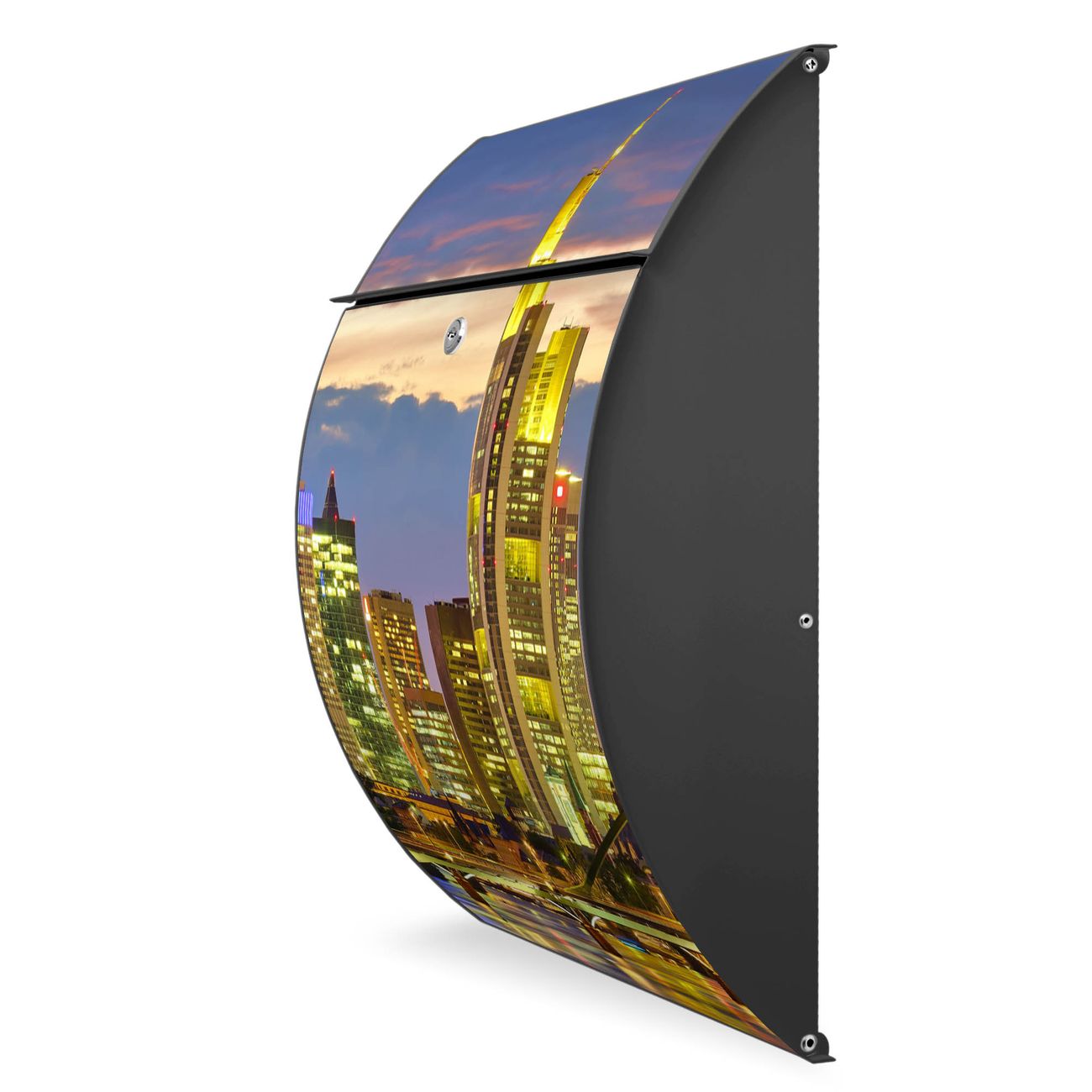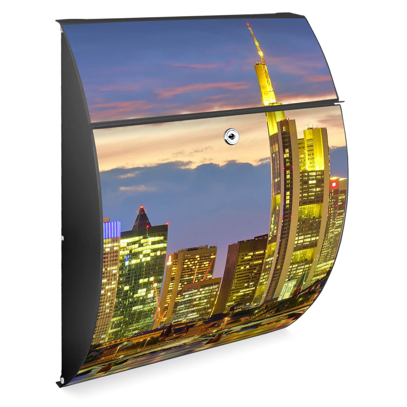 FUNKTION: DESIGN: Das Modell Riviera mit Motiv Frankfurt Main hat ein sehr ansprechendes und zeitloses Design. Heben Sie Sich von der tristen grauen Masse ab, ohne auf Funktionalität zu verzichten. Der integrierte Öffnungsstopp ermöglicht eine einfache Handhabung beim Entnehmen der Post. DETAILS: Der Postkasten besteht aus vollflächig verzinktem Stahl welcher in Anthrazit lackiert wurde. Das Motiv besteht aus einer wetter- und UV-festen Folie, die mit einem Schutzlaminat überzogen ist, durch die Ihren Briefkasten zusätzlich vor Kratzern geschützt ist. Sie erhalten 2 Schlüssel sowie das passende Montagematerial. NUTZEN: Sie können den Briefkasten sowohl als Wandbriefkasten montieren oder einen passenden Ständer kaufen und als Standbriefkasten einbetonieren. Die Größe bietet genügend Platz für Sendungen aller Art, der Einwurf fasst auch größere A4 Sendungen. BANJADO: Ihr Briefkasten wird in Sachsen in einer kleinen Manufaktur von Hand veredelt. Die Motivfolie ist lösungsmittelfrei und schutzlaminiert, dies sorgt für einen langen Halt. Wir legen großen Wert auf die Verbindung von Funktionalität und Design. Sie erhalten Handarbeit aus Sachsen.