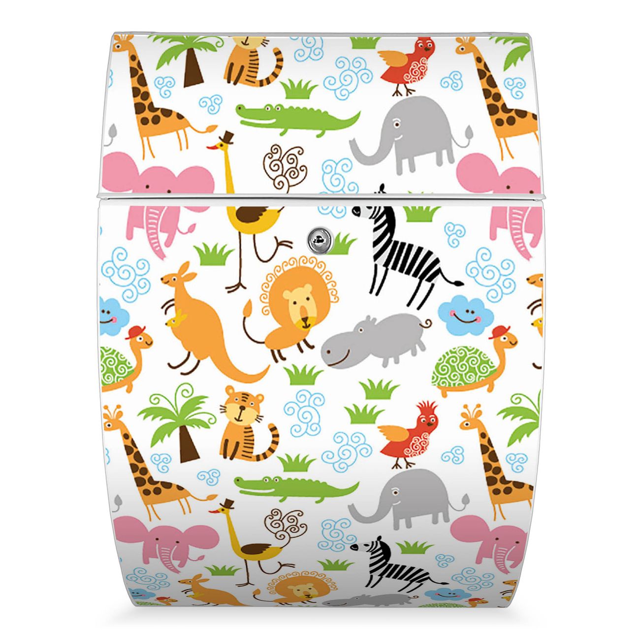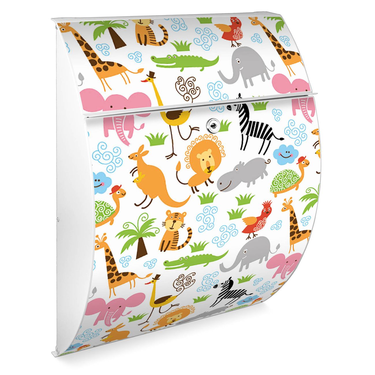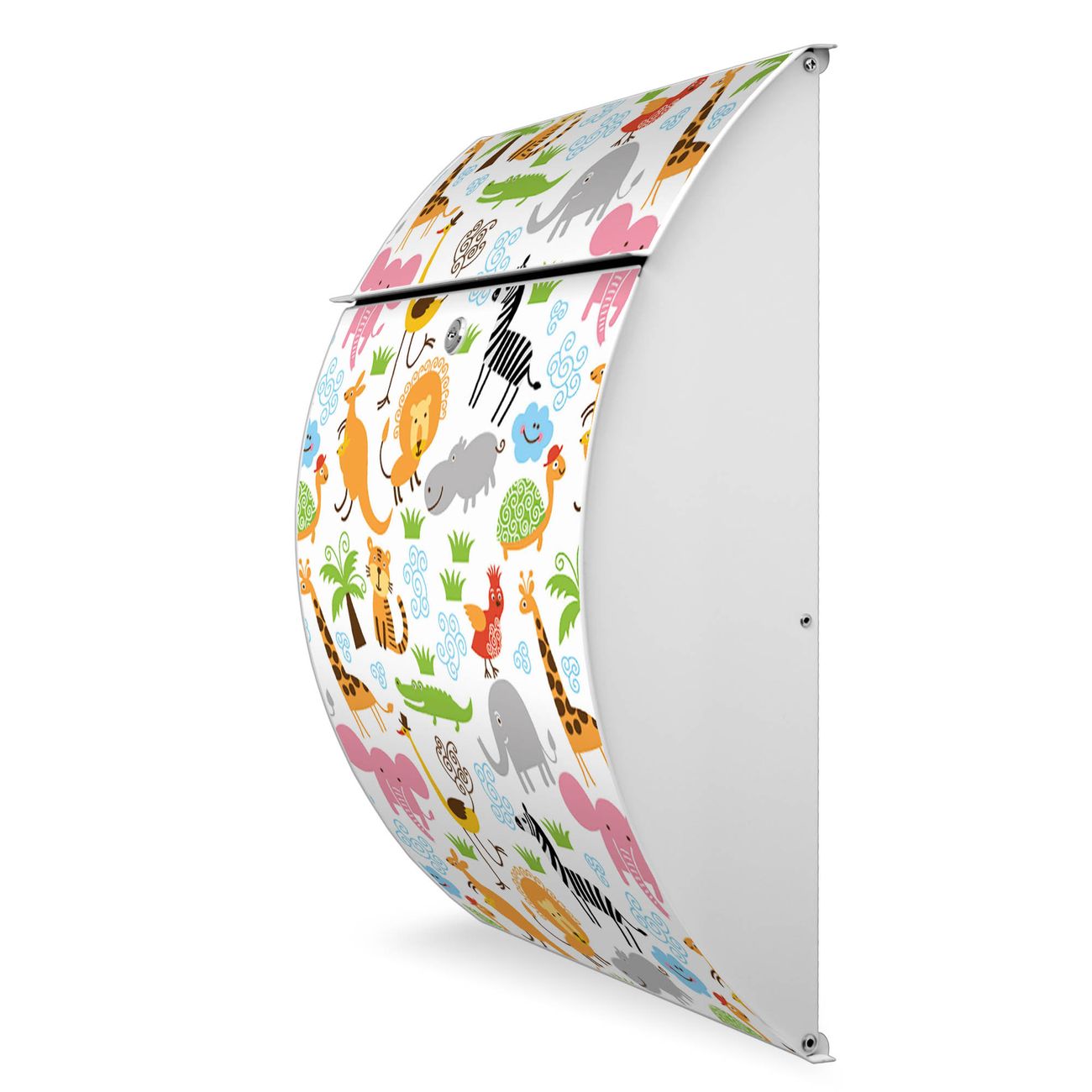 Der weiße Burg Wächter Design Briefkasten mit Motiv Fröhliche Tiere bietet Ihnen mit seinem Fassungsvermögen genügend Platz auch für große A4 Sendungen. Auf Wunsch können Sie bei uns auch den passenden Ständer kaufen und so aus dem Wandbriefkasten einen Standbriefkasten machen.