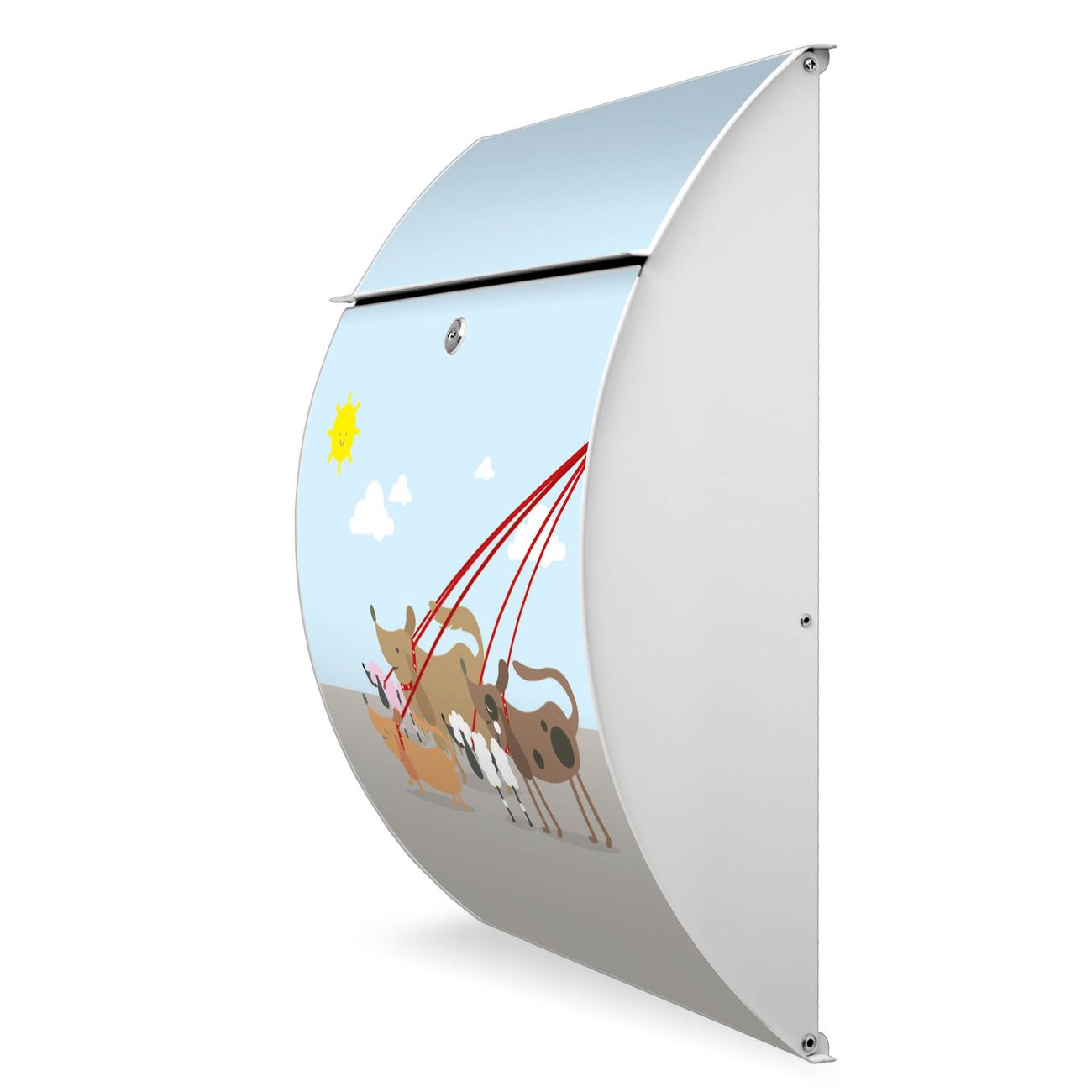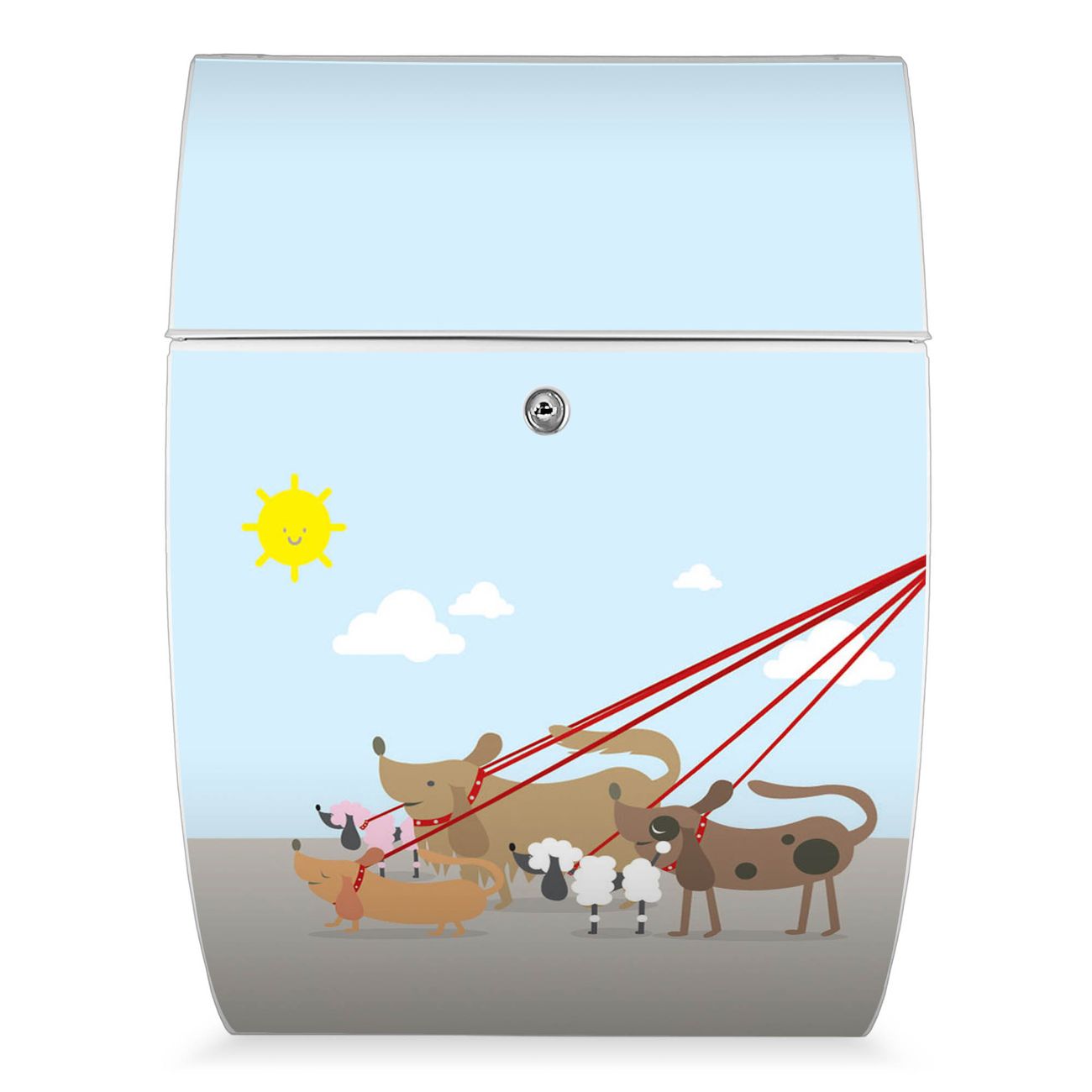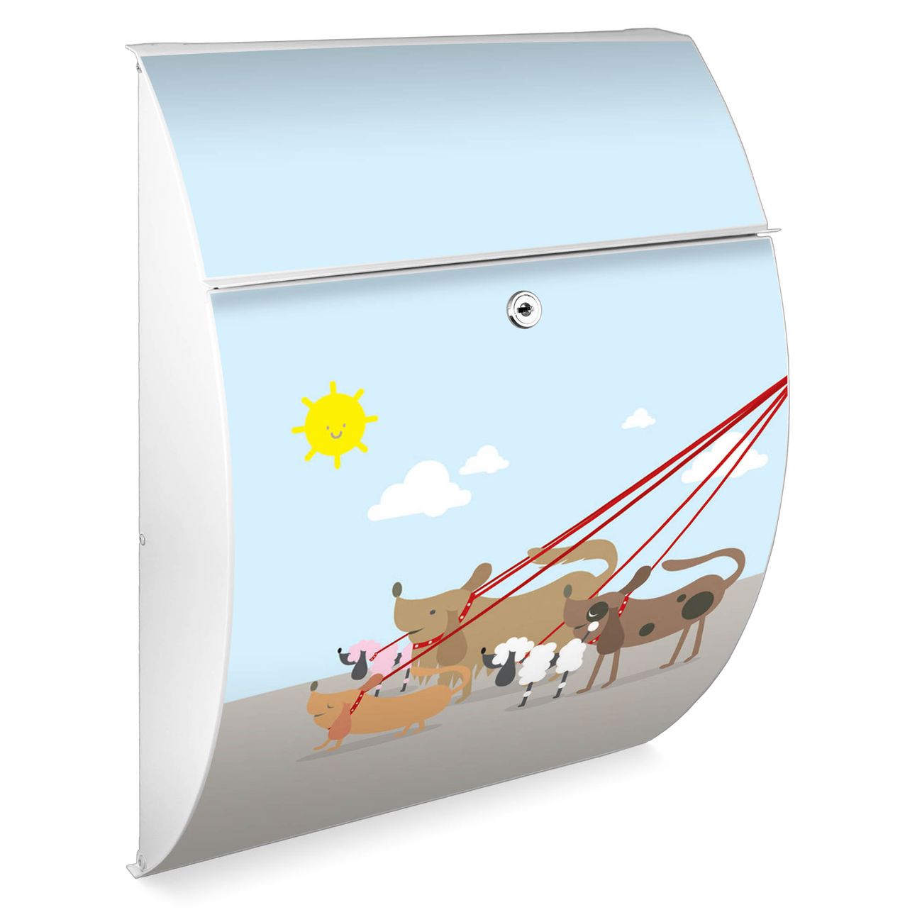 Der weiße Burg Wächter Design Briefkasten mit Motiv Gassi Gehen bietet Ihnen mit seinem Fassungsvermögen genügend Platz auch für große A4 Sendungen. Auf Wunsch können Sie bei uns auch den passenden Ständer kaufen und so aus dem Wandbriefkasten einen Standbriefkasten machen.