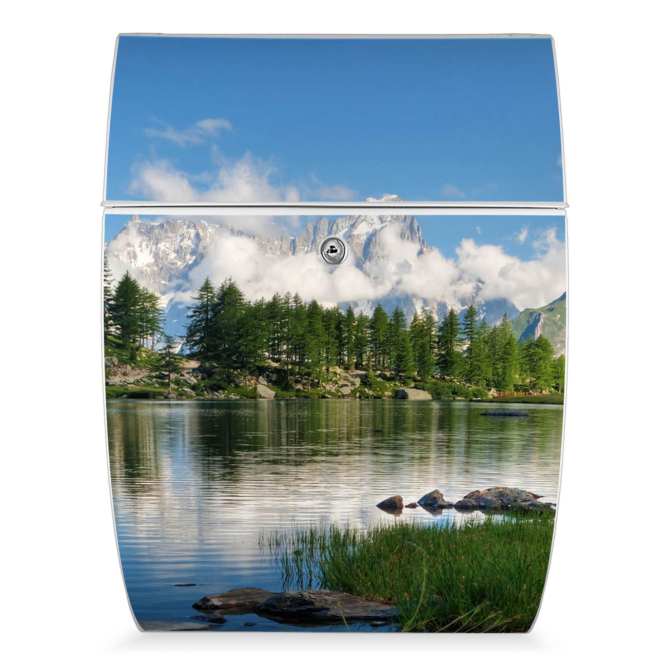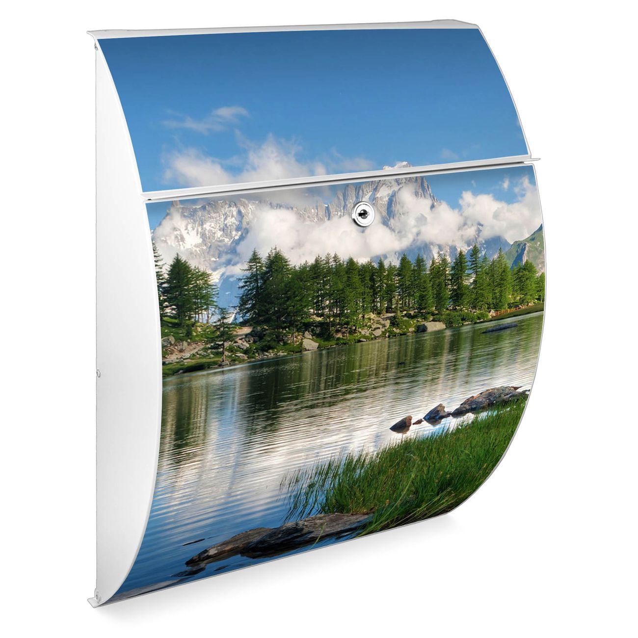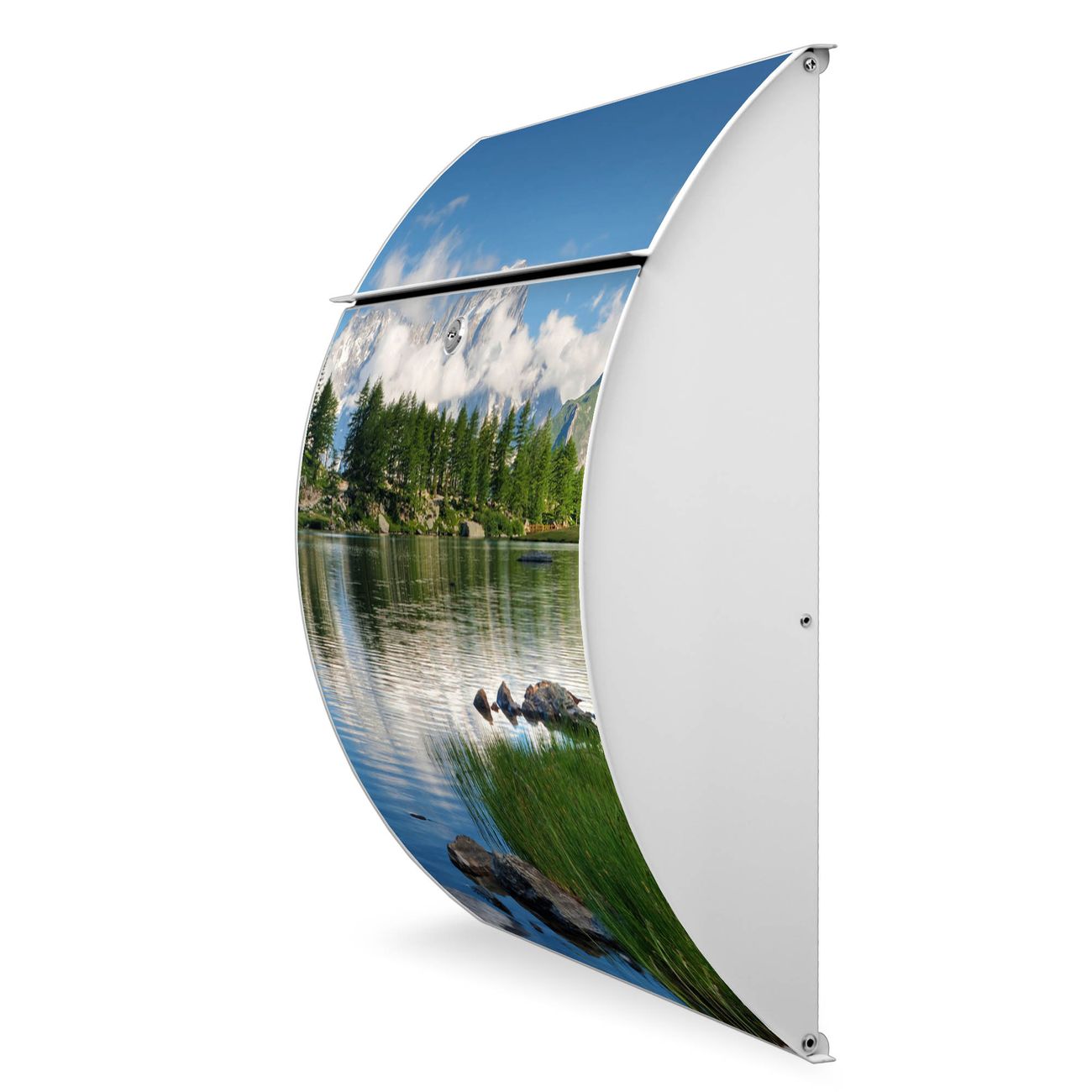 Der weiße Burg Wächter Design Briefkasten mit Motiv Gebirgssee bietet Ihnen mit seinem Fassungsvermögen genügend Platz auch für große A4 Sendungen. Auf Wunsch können Sie bei uns auch den passenden Ständer kaufen und so aus dem Wandbriefkasten einen Standbriefkasten machen.