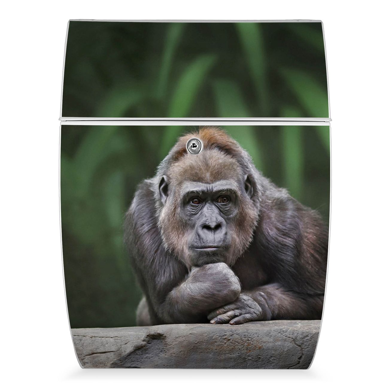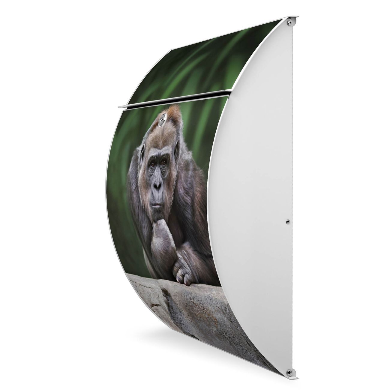 Der weiße Burg Wächter Design Briefkasten mit Motiv Gorilla bietet Ihnen mit seinem Fassungsvermögen genügend Platz auch für große A4 Sendungen. Auf Wunsch können Sie bei uns auch den passenden Ständer kaufen und so aus dem Wandbriefkasten einen Standbriefkasten machen.