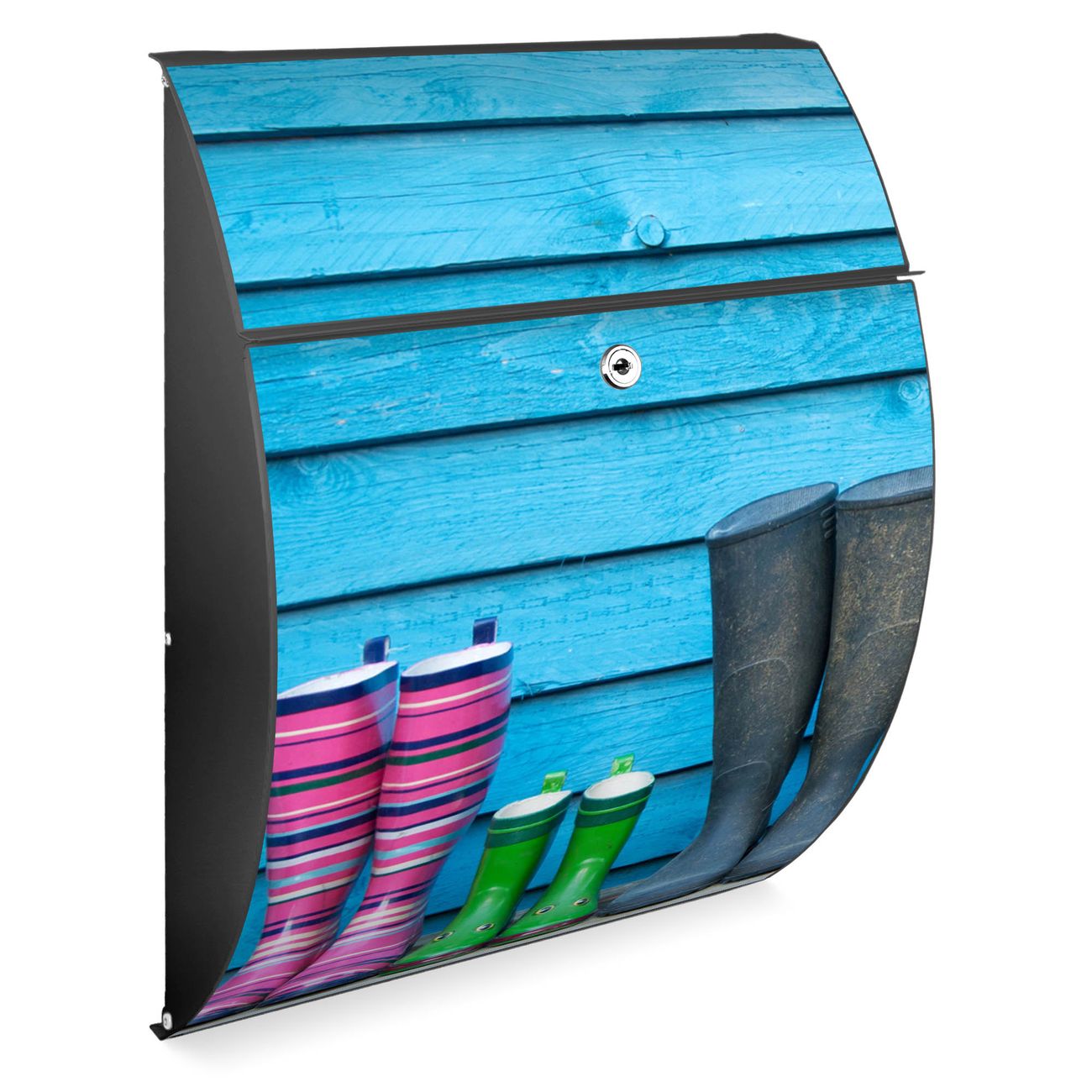 FUNKTION: DESIGN: Das Modell Riviera mit Motiv Gummistiefel hat ein sehr ansprechendes und zeitloses Design. Heben Sie Sich von der tristen grauen Masse ab, ohne auf Funktionalität zu verzichten. Der integrierte Öffnungsstopp ermöglicht eine einfache Handhabung beim Entnehmen der Post. DETAILS: Der Postkasten besteht aus vollflächig verzinktem Stahl welcher in Anthrazit lackiert wurde. Das Motiv besteht aus einer wetter- und UV-festen Folie, die mit einem Schutzlaminat überzogen ist, durch die Ihren Briefkasten zusätzlich vor Kratzern geschützt ist. Sie erhalten 2 Schlüssel sowie das passende Montagematerial. NUTZEN: Sie können den Briefkasten sowohl als Wandbriefkasten montieren oder einen passenden Ständer kaufen und als Standbriefkasten einbetonieren. Die Größe bietet genügend Platz für Sendungen aller Art, der Einwurf fasst auch größere A4 Sendungen. BANJADO: Ihr Briefkasten wird in Sachsen in einer kleinen Manufaktur von Hand veredelt. Die Motivfolie ist lösungsmittelfrei und schutzlaminiert, dies sorgt für einen langen Halt. Wir legen großen Wert auf die Verbindung von Funktionalität und Design. Sie erhalten Handarbeit aus Sachsen.