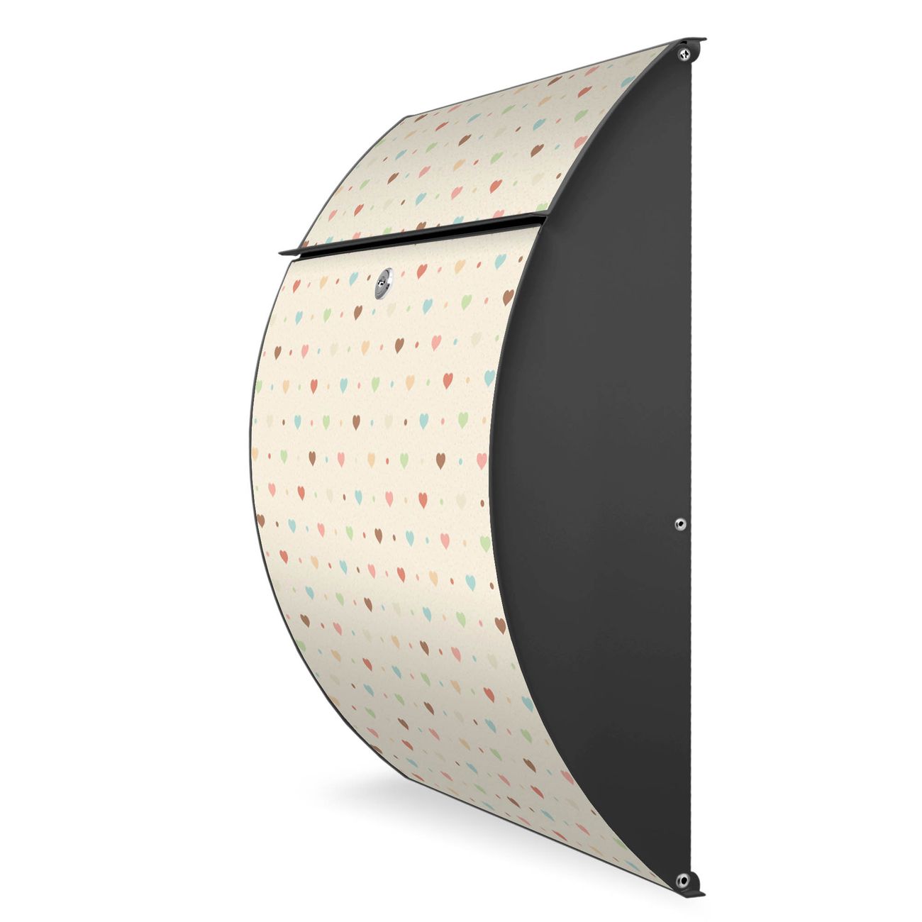 FUNKTION: DESIGN: Das Modell Riviera mit Motiv Herzen bunt hat ein sehr ansprechendes und zeitloses Design. Heben Sie Sich von der tristen grauen Masse ab, ohne auf Funktionalität zu verzichten. Der integrierte Öffnungsstopp ermöglicht eine einfache Handhabung beim Entnehmen der Post. DETAILS: Der Postkasten besteht aus vollflächig verzinktem Stahl welcher in Anthrazit lackiert wurde. Das Motiv besteht aus einer wetter- und UV-festen Folie, die mit einem Schutzlaminat überzogen ist, durch die Ihren Briefkasten zusätzlich vor Kratzern geschützt ist. Sie erhalten 2 Schlüssel sowie das passende Montagematerial. NUTZEN: Sie können den Briefkasten sowohl als Wandbriefkasten montieren oder einen passenden Ständer kaufen und als Standbriefkasten einbetonieren. Die Größe bietet genügend Platz für Sendungen aller Art, der Einwurf fasst auch größere A4 Sendungen. BANJADO: Ihr Briefkasten wird in Sachsen in einer kleinen Manufaktur von Hand veredelt. Die Motivfolie ist lösungsmittelfrei und schutzlaminiert, dies sorgt für einen langen Halt. Wir legen großen Wert auf die Verbindung von Funktionalität und Design. Sie erhalten Handarbeit aus Sachsen.
