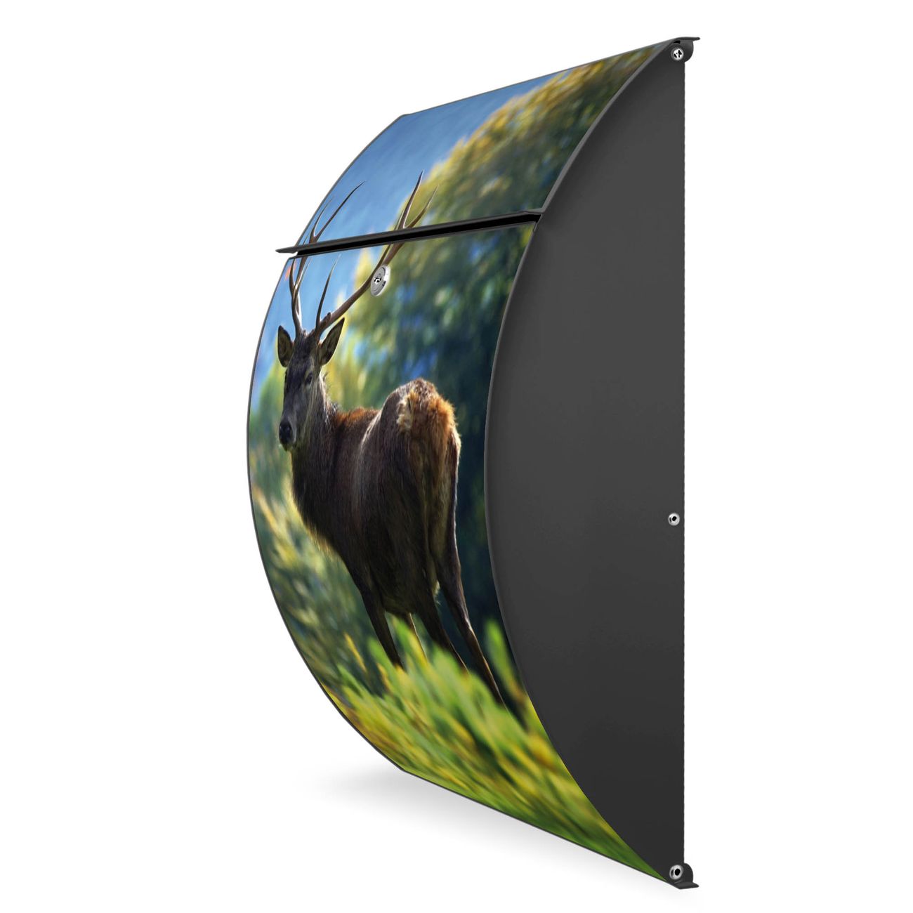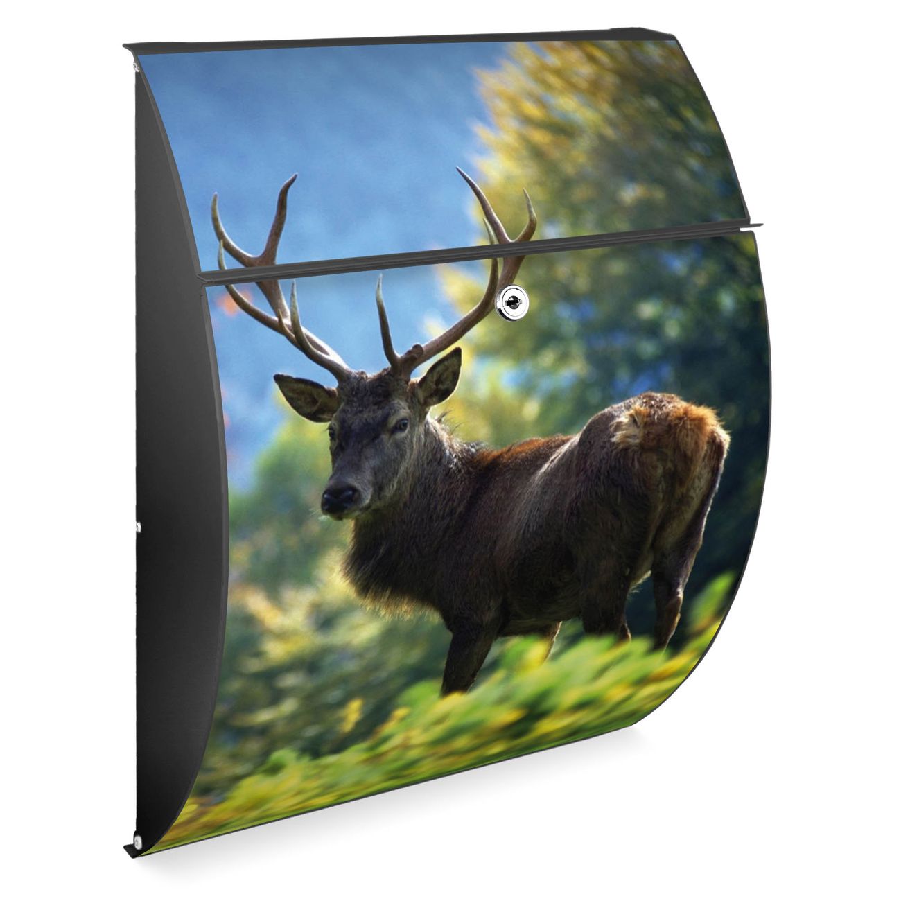 FUNKTION: DESIGN: Das Modell Riviera mit Motiv Hirsch hat ein sehr ansprechendes und zeitloses Design. Heben Sie Sich von der tristen grauen Masse ab, ohne auf Funktionalität zu verzichten. Der integrierte Öffnungsstopp ermöglicht eine einfache Handhabung beim Entnehmen der Post. DETAILS: Der Postkasten besteht aus vollflächig verzinktem Stahl welcher in Anthrazit lackiert wurde. Das Motiv besteht aus einer wetter- und UV-festen Folie, die mit einem Schutzlaminat überzogen ist, durch die Ihren Briefkasten zusätzlich vor Kratzern geschützt ist. Sie erhalten 2 Schlüssel sowie das passende Montagematerial. NUTZEN: Sie können den Briefkasten sowohl als Wandbriefkasten montieren oder einen passenden Ständer kaufen und als Standbriefkasten einbetonieren. Die Größe bietet genügend Platz für Sendungen aller Art, der Einwurf fasst auch größere A4 Sendungen. BANJADO: Ihr Briefkasten wird in Sachsen in einer kleinen Manufaktur von Hand veredelt. Die Motivfolie ist lösungsmittelfrei und schutzlaminiert, dies sorgt für einen langen Halt. Wir legen großen Wert auf die Verbindung von Funktionalität und Design. Sie erhalten Handarbeit aus Sachsen.