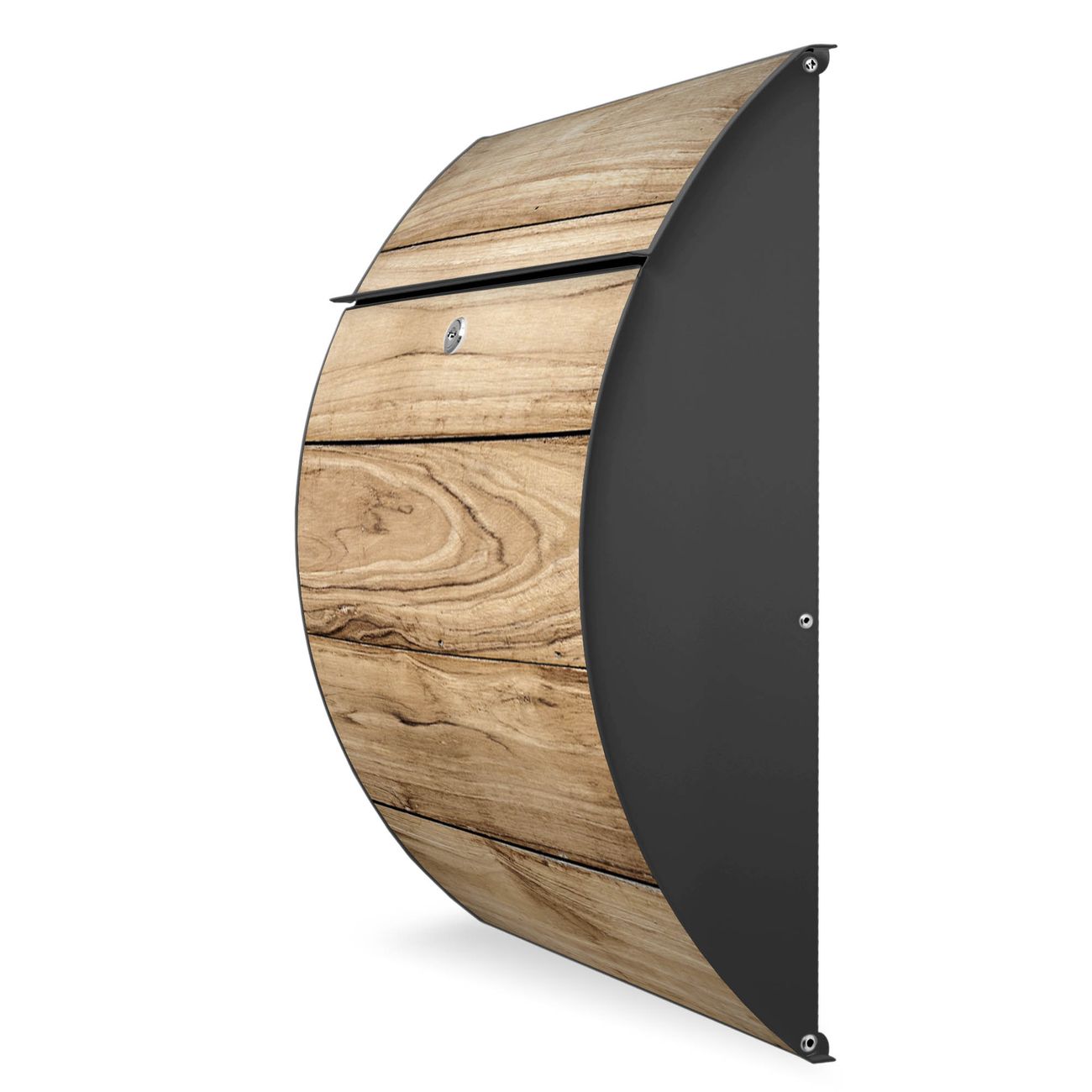 FUNKTION: DESIGN: Das Modell Riviera mit Motiv Holzplanken hat ein sehr ansprechendes und zeitloses Design. Heben Sie Sich von der tristen grauen Masse ab, ohne auf Funktionalität zu verzichten. Der integrierte Öffnungsstopp ermöglicht eine einfache Handhabung beim Entnehmen der Post. DETAILS: Der Postkasten besteht aus vollflächig verzinktem Stahl welcher in Anthrazit lackiert wurde. Das Motiv besteht aus einer wetter- und UV-festen Folie, die mit einem Schutzlaminat überzogen ist, durch die Ihren Briefkasten zusätzlich vor Kratzern geschützt ist. Sie erhalten 2 Schlüssel sowie das passende Montagematerial. NUTZEN: Sie können den Briefkasten sowohl als Wandbriefkasten montieren oder einen passenden Ständer kaufen und als Standbriefkasten einbetonieren. Die Größe bietet genügend Platz für Sendungen aller Art, der Einwurf fasst auch größere A4 Sendungen. BANJADO: Ihr Briefkasten wird in Sachsen in einer kleinen Manufaktur von Hand veredelt. Die Motivfolie ist lösungsmittelfrei und schutzlaminiert, dies sorgt für einen langen Halt. Wir legen großen Wert auf die Verbindung von Funktionalität und Design. Sie erhalten Handarbeit aus Sachsen.