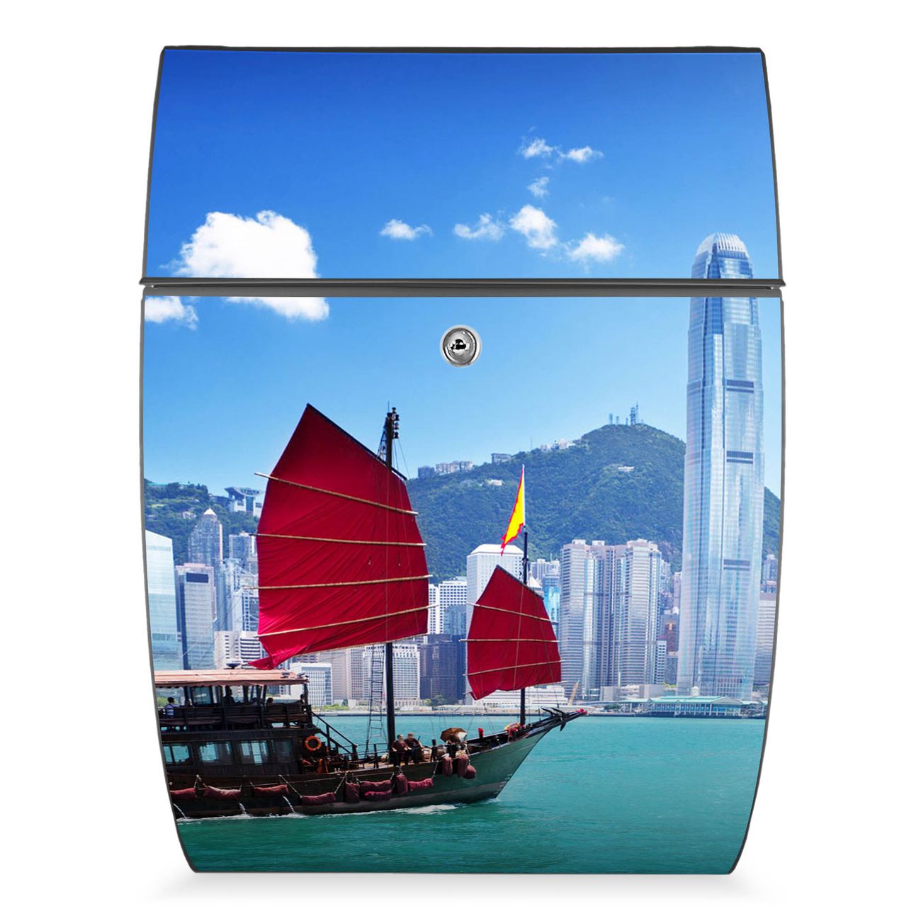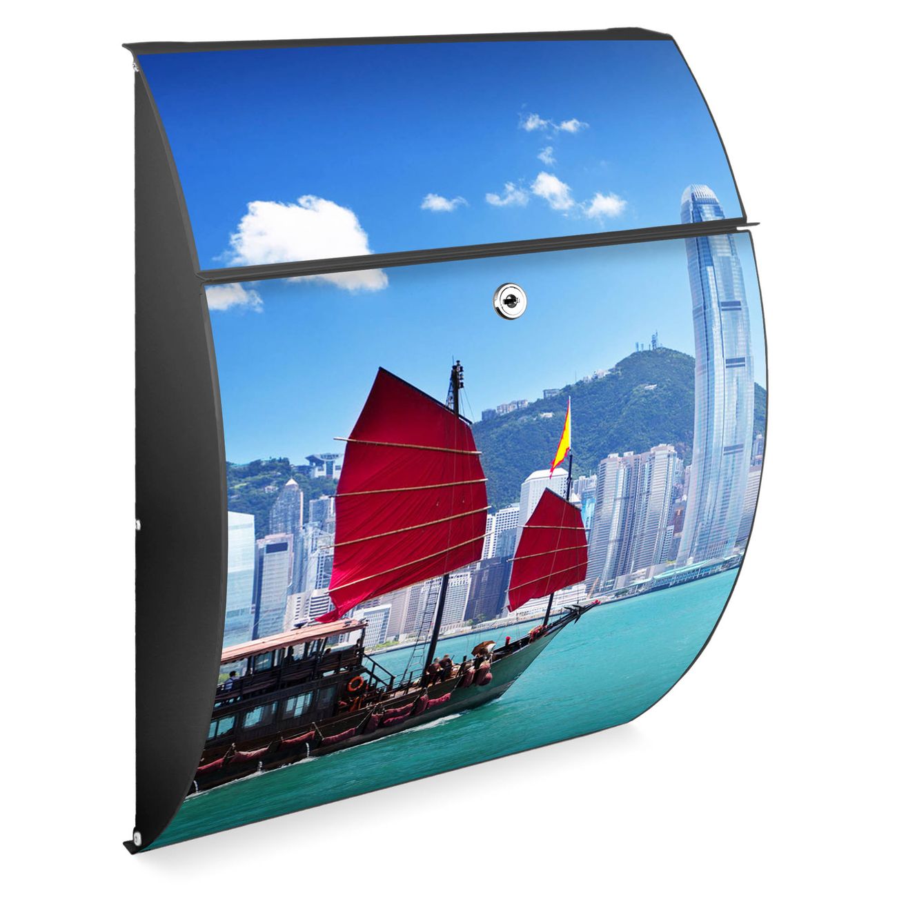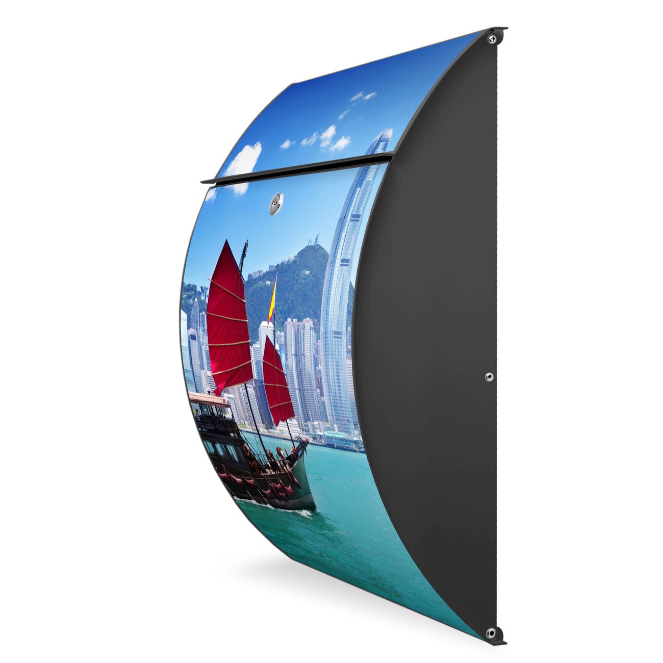 FUNKTION: DESIGN: Das Modell Riviera mit Motiv Hong Kong hat ein sehr ansprechendes und zeitloses Design. Heben Sie Sich von der tristen grauen Masse ab, ohne auf Funktionalität zu verzichten. Der integrierte Öffnungsstopp ermöglicht eine einfache Handhabung beim Entnehmen der Post. DETAILS: Der Postkasten besteht aus vollflächig verzinktem Stahl welcher in Anthrazit lackiert wurde. Das Motiv besteht aus einer wetter- und UV-festen Folie, die mit einem Schutzlaminat überzogen ist, durch die Ihren Briefkasten zusätzlich vor Kratzern geschützt ist. Sie erhalten 2 Schlüssel sowie das passende Montagematerial. NUTZEN: Sie können den Briefkasten sowohl als Wandbriefkasten montieren oder einen passenden Ständer kaufen und als Standbriefkasten einbetonieren. Die Größe bietet genügend Platz für Sendungen aller Art, der Einwurf fasst auch größere A4 Sendungen. BANJADO: Ihr Briefkasten wird in Sachsen in einer kleinen Manufaktur von Hand veredelt. Die Motivfolie ist lösungsmittelfrei und schutzlaminiert, dies sorgt für einen langen Halt. Wir legen großen Wert auf die Verbindung von Funktionalität und Design. Sie erhalten Handarbeit aus Sachsen.