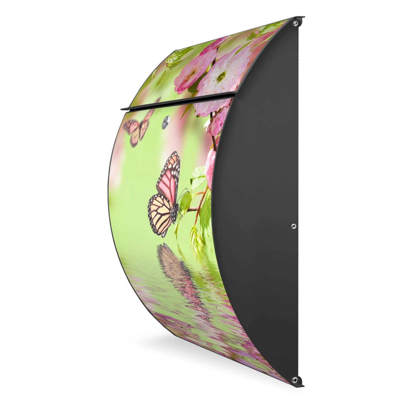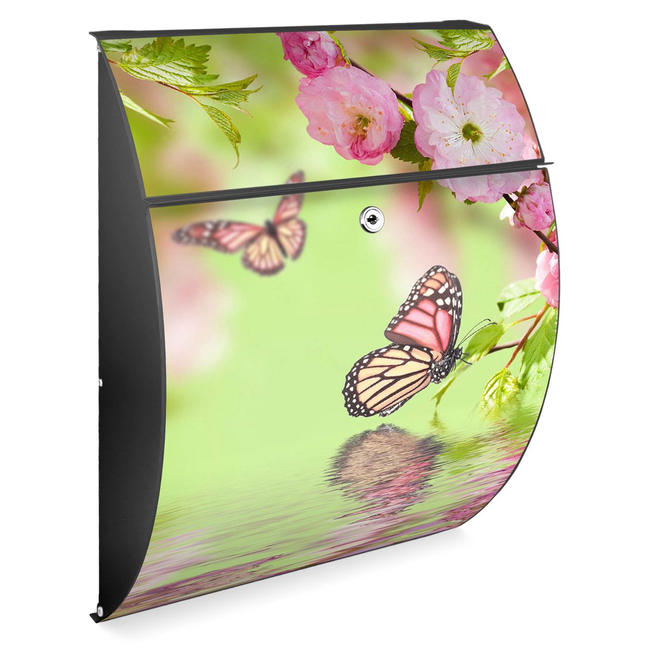 FUNKTION: DESIGN: Das Modell Riviera mit Motiv Japanische Kirschblüte hat ein sehr ansprechendes und zeitloses Design. Heben Sie Sich von der tristen grauen Masse ab, ohne auf Funktionalität zu verzichten. Der integrierte Öffnungsstopp ermöglicht eine einfache Handhabung beim Entnehmen der Post. DETAILS: Der Postkasten besteht aus vollflächig verzinktem Stahl welcher in Anthrazit lackiert wurde. Das Motiv besteht aus einer wetter- und UV-festen Folie, die mit einem Schutzlaminat überzogen ist, durch die Ihren Briefkasten zusätzlich vor Kratzern geschützt ist. Sie erhalten 2 Schlüssel sowie das passende Montagematerial. NUTZEN: Sie können den Briefkasten sowohl als Wandbriefkasten montieren oder einen passenden Ständer kaufen und als Standbriefkasten einbetonieren. Die Größe bietet genügend Platz für Sendungen aller Art, der Einwurf fasst auch größere A4 Sendungen. BANJADO: Ihr Briefkasten wird in Sachsen in einer kleinen Manufaktur von Hand veredelt. Die Motivfolie ist lösungsmittelfrei und schutzlaminiert, dies sorgt für einen langen Halt. Wir legen großen Wert auf die Verbindung von Funktionalität und Design. Sie erhalten Handarbeit aus Sachsen.