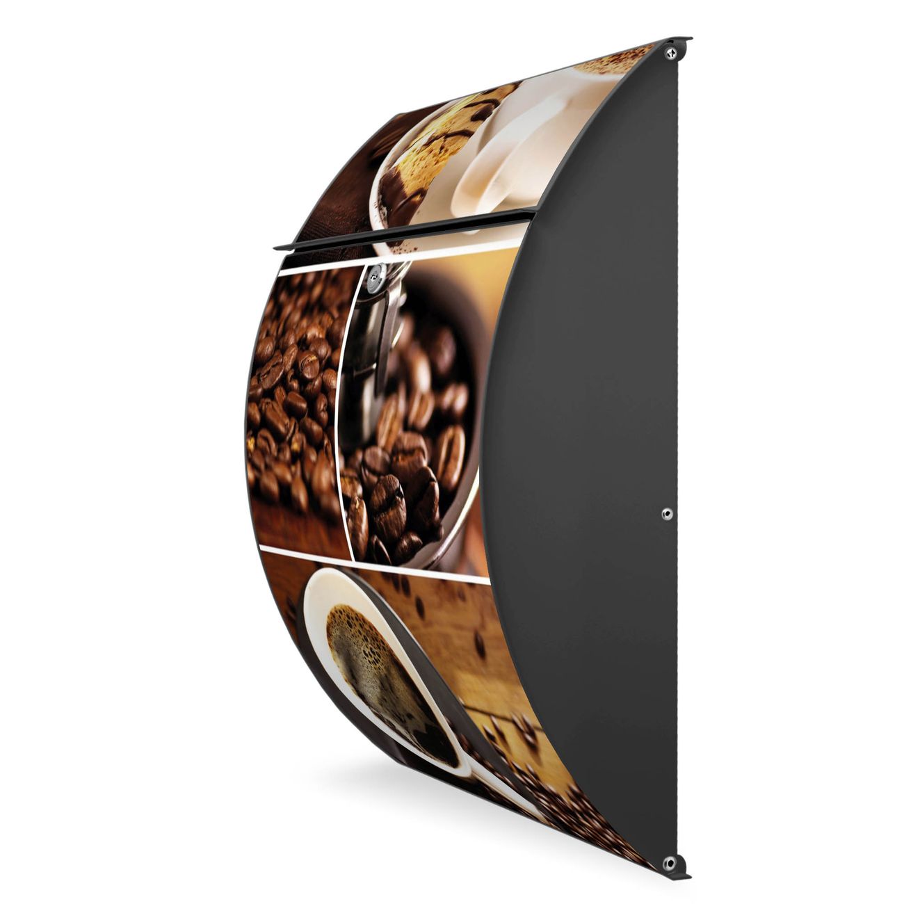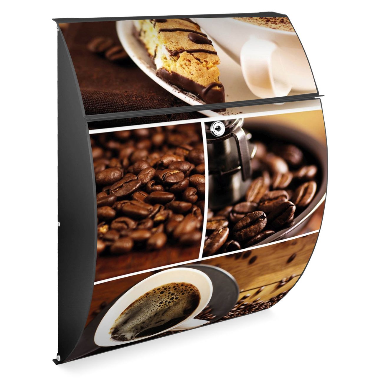 FUNKTION: DESIGN: Das Modell Riviera mit Motiv Kaffee&Schokolade hat ein sehr ansprechendes und zeitloses Design. Heben Sie Sich von der tristen grauen Masse ab, ohne auf Funktionalität zu verzichten. Der integrierte Öffnungsstopp ermöglicht eine einfache Handhabung beim Entnehmen der Post. DETAILS: Der Postkasten besteht aus vollflächig verzinktem Stahl welcher in Anthrazit lackiert wurde. Das Motiv besteht aus einer wetter- und UV-festen Folie, die mit einem Schutzlaminat überzogen ist, durch die Ihren Briefkasten zusätzlich vor Kratzern geschützt ist. Sie erhalten 2 Schlüssel sowie das passende Montagematerial. NUTZEN: Sie können den Briefkasten sowohl als Wandbriefkasten montieren oder einen passenden Ständer kaufen und als Standbriefkasten einbetonieren. Die Größe bietet genügend Platz für Sendungen aller Art, der Einwurf fasst auch größere A4 Sendungen. BANJADO: Ihr Briefkasten wird in Sachsen in einer kleinen Manufaktur von Hand veredelt. Die Motivfolie ist lösungsmittelfrei und schutzlaminiert, dies sorgt für einen langen Halt. Wir legen großen Wert auf die Verbindung von Funktionalität und Design. Sie erhalten Handarbeit aus Sachsen.