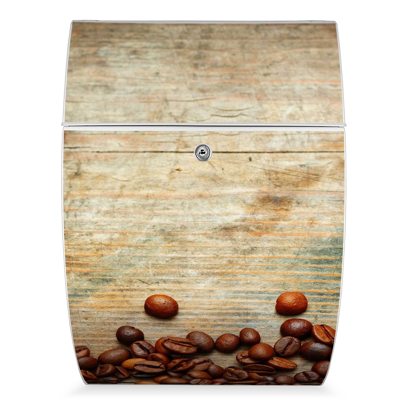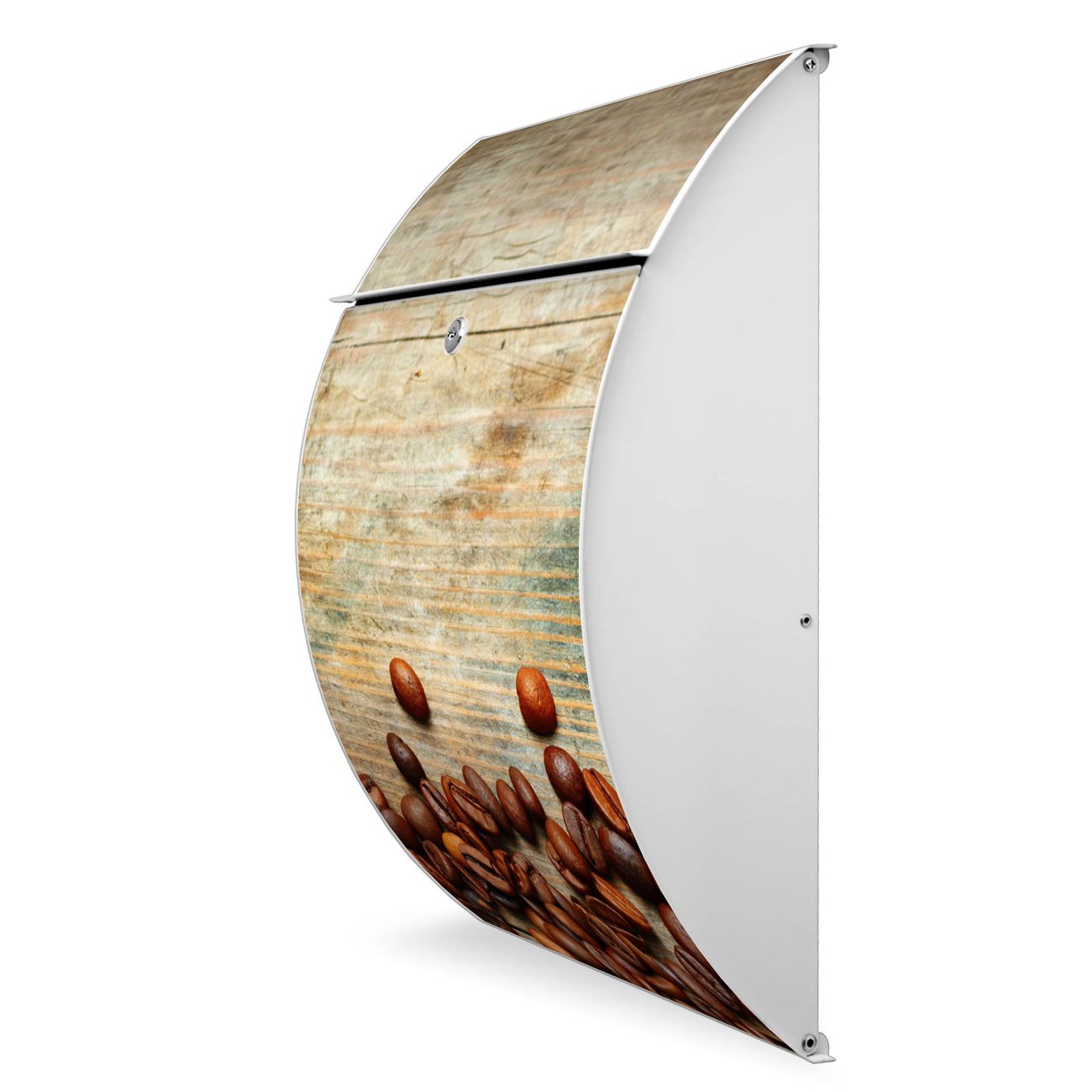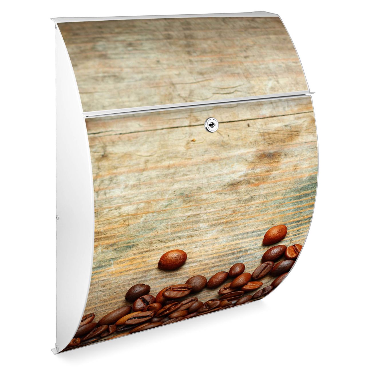 FUNKTION: DESIGN: Das Modell Riviera mit Motiv Kaffeebohnen hat ein sehr ansprechendes und zeitloses Design. Heben Sie Sich von der tristen grauen Masse ab, ohne auf Funktionalität zu verzichten. Der integrierte Öffnungsstopp ermöglicht eine einfache Handhabung beim Entnehmen der Post. DETAILS: Der Postkasten besteht aus vollflächig verzinktem Stahl welcher in weiß lackiert wurde. Das Motiv besteht aus einer wetter- und UV-festen Folie, die mit einem Schutzlaminat überzogen ist, durch die Ihren Briefkasten zusätzlich vor Kratzern geschützt ist. Sie erhalten 2 Schlüssel sowie das passende Montagematerial. NUTZEN: Sie können den Briefkasten sowohl als Wandbriefkasten montieren oder einen passenden Ständer kaufen und als Standbriefkasten einbetonieren. Die Größe bietet genügend Platz für Sendungen aller Art, der Einwurf fasst auch größere A4 Sendungen. BANJADO: Ihr Briefkasten wird in Sachsen in einer kleinen Manufaktur von Hand veredelt. Die Motivfolie ist lösungsmittelfrei und schutzlaminiert, dies sorgt für einen langen Halt. Wir legen großen Wert auf die Verbindung von Funktionalität und Design. Sie erhalten Handarbeit aus Sachsen.
