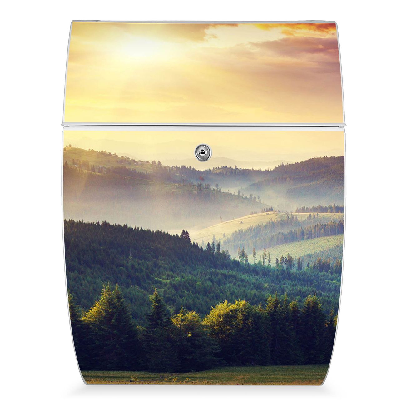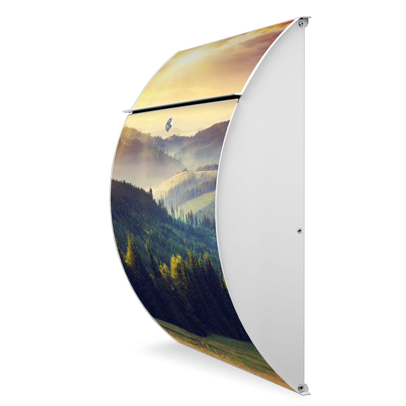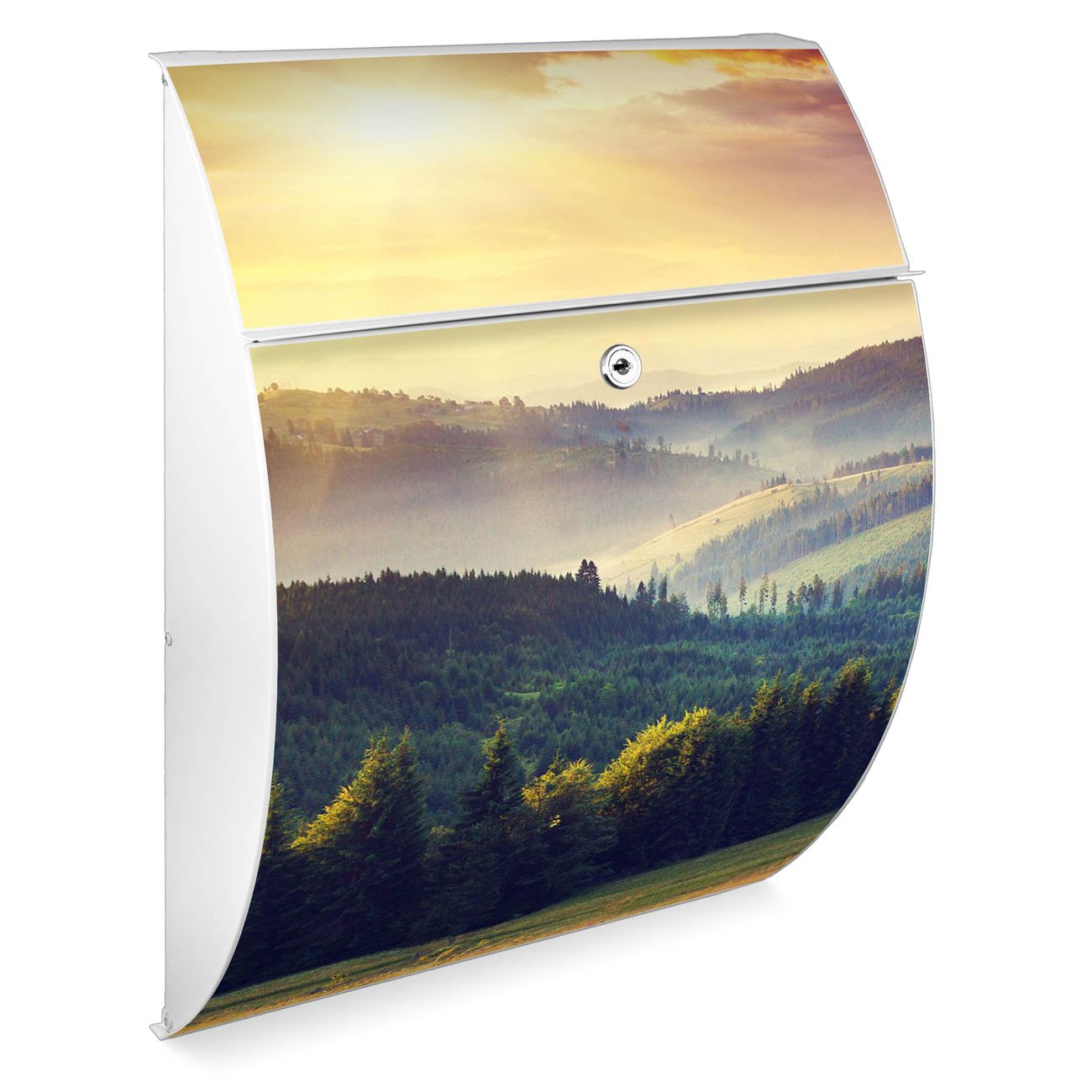 Der weiße Burg Wächter Design Briefkasten mit Motiv Karpaten Sonnenuntergang bietet Ihnen mit seinem Fassungsvermögen genügend Platz auch für große A4 Sendungen. Auf Wunsch können Sie bei uns auch den passenden Ständer kaufen und so aus dem Wandbriefkasten einen Standbriefkasten machen.