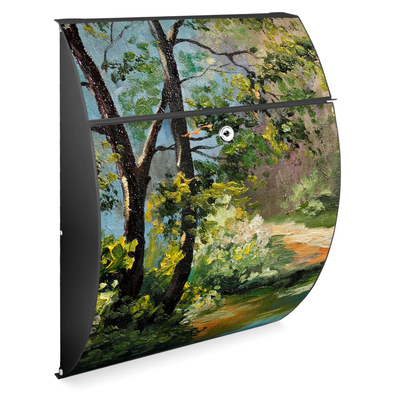 FUNKTION: DESIGN: Das Modell Riviera mit Motiv Kleine Brücke hat ein sehr ansprechendes und zeitloses Design. Heben Sie Sich von der tristen grauen Masse ab, ohne auf Funktionalität zu verzichten. Der integrierte Öffnungsstopp ermöglicht eine einfache Handhabung beim Entnehmen der Post. DETAILS: Der Postkasten besteht aus vollflächig verzinktem Stahl welcher in Anthrazit lackiert wurde. Das Motiv besteht aus einer wetter- und UV-festen Folie, die mit einem Schutzlaminat überzogen ist, durch die Ihren Briefkasten zusätzlich vor Kratzern geschützt ist. Sie erhalten 2 Schlüssel sowie das passende Montagematerial. NUTZEN: Sie können den Briefkasten sowohl als Wandbriefkasten montieren oder einen passenden Ständer kaufen und als Standbriefkasten einbetonieren. Die Größe bietet genügend Platz für Sendungen aller Art, der Einwurf fasst auch größere A4 Sendungen. BANJADO: Ihr Briefkasten wird in Sachsen in einer kleinen Manufaktur von Hand veredelt. Die Motivfolie ist lösungsmittelfrei und schutzlaminiert, dies sorgt für einen langen Halt. Wir legen großen Wert auf die Verbindung von Funktionalität und Design. Sie erhalten Handarbeit aus Sachsen.