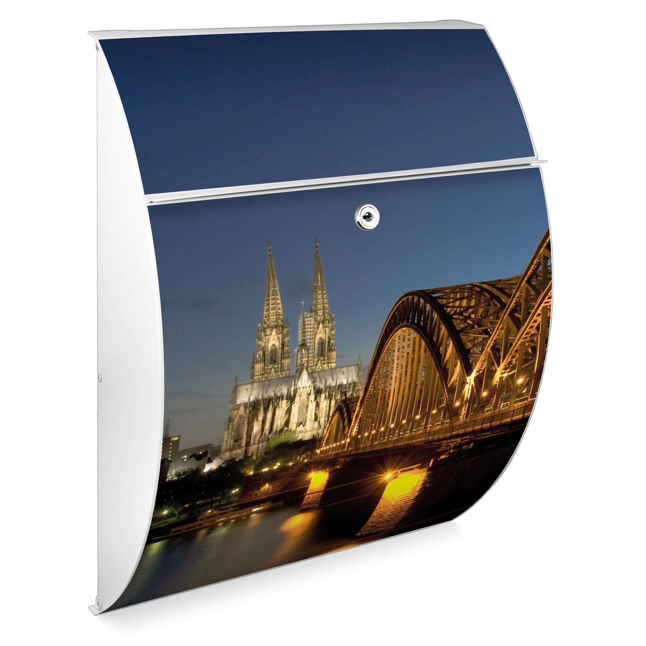 Der weiße Burg Wächter Design Briefkasten mit Motiv Köln bietet Ihnen mit seinem Fassungsvermögen genügend Platz auch für große A4 Sendungen. Auf Wunsch können Sie bei uns auch den passenden Ständer kaufen und so aus dem Wandbriefkasten einen Standbriefkasten machen.