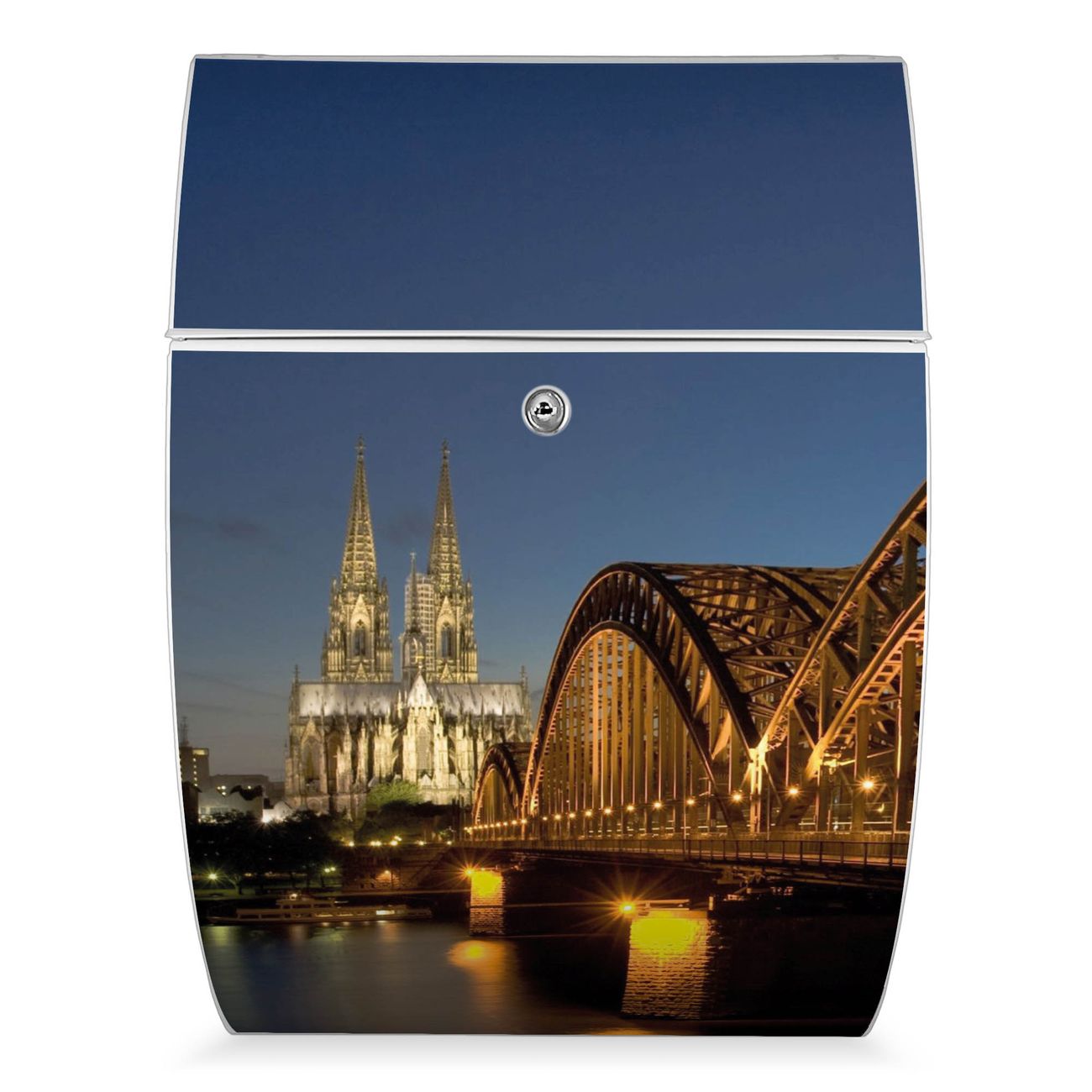 FUNKTION: DESIGN: Das Modell Riviera mit Motiv Köln hat ein sehr ansprechendes und zeitloses Design. Heben Sie Sich von der tristen grauen Masse ab, ohne auf Funktionalität zu verzichten. Der integrierte Öffnungsstopp ermöglicht eine einfache Handhabung beim Entnehmen der Post. DETAILS: Der Postkasten besteht aus vollflächig verzinktem Stahl welcher in weiß lackiert wurde. Das Motiv besteht aus einer wetter- und UV-festen Folie, die mit einem Schutzlaminat überzogen ist, durch die Ihren Briefkasten zusätzlich vor Kratzern geschützt ist. Sie erhalten 2 Schlüssel sowie das passende Montagematerial. NUTZEN: Sie können den Briefkasten sowohl als Wandbriefkasten montieren oder einen passenden Ständer kaufen und als Standbriefkasten einbetonieren. Die Größe bietet genügend Platz für Sendungen aller Art, der Einwurf fasst auch größere A4 Sendungen. BANJADO: Ihr Briefkasten wird in Sachsen in einer kleinen Manufaktur von Hand veredelt. Die Motivfolie ist lösungsmittelfrei und schutzlaminiert, dies sorgt für einen langen Halt. Wir legen großen Wert auf die Verbindung von Funktionalität und Design. Sie erhalten Handarbeit aus Sachsen.