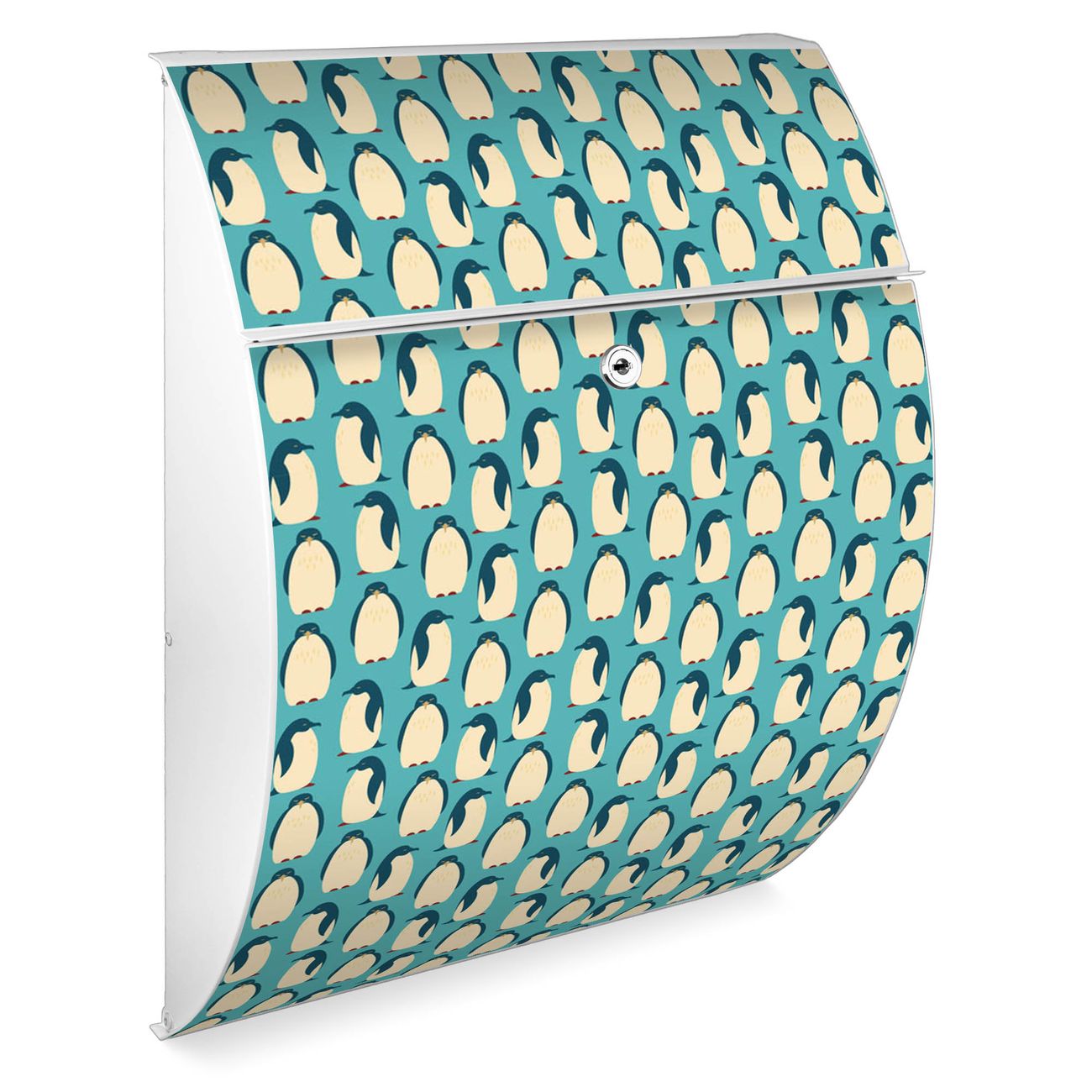 Der weiße Burg Wächter Design Briefkasten mit Motiv Königspinguine bietet Ihnen mit seinem Fassungsvermögen genügend Platz auch für große A4 Sendungen. Auf Wunsch können Sie bei uns auch den passenden Ständer kaufen und so aus dem Wandbriefkasten einen Standbriefkasten machen.