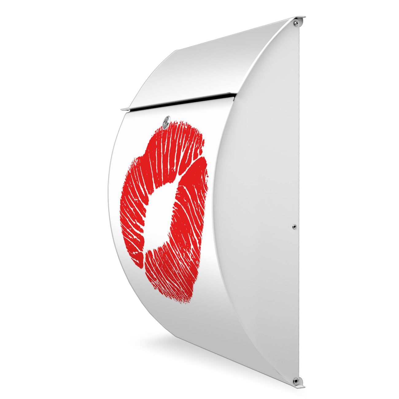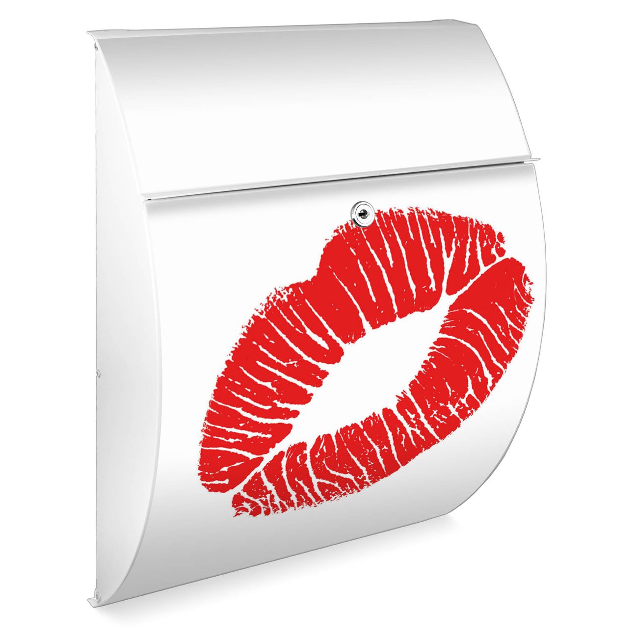 Der weiße Burg Wächter Design Briefkasten mit Motiv Kussmund bietet Ihnen mit seinem Fassungsvermögen genügend Platz auch für große A4 Sendungen. Auf Wunsch können Sie bei uns auch den passenden Ständer kaufen und so aus dem Wandbriefkasten einen Standbriefkasten machen.