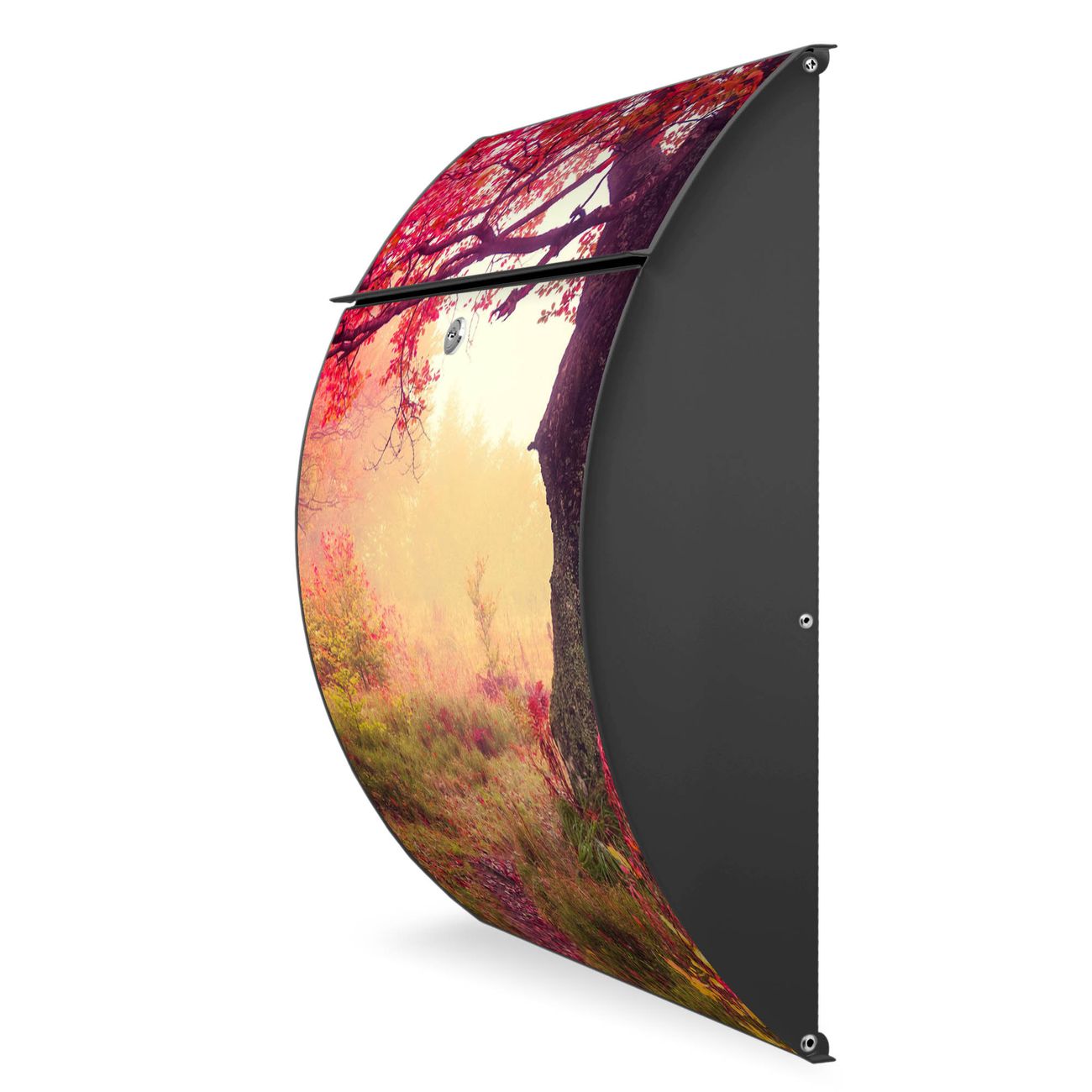 FUNKTION: DESIGN: Das Modell Riviera mit Motiv Lichtung Im Herbst hat ein sehr ansprechendes und zeitloses Design. Heben Sie Sich von der tristen grauen Masse ab, ohne auf Funktionalität zu verzichten. Der integrierte Öffnungsstopp ermöglicht eine einfache Handhabung beim Entnehmen der Post. DETAILS: Der Postkasten besteht aus vollflächig verzinktem Stahl welcher in Anthrazit lackiert wurde. Das Motiv besteht aus einer wetter- und UV-festen Folie, die mit einem Schutzlaminat überzogen ist, durch die Ihren Briefkasten zusätzlich vor Kratzern geschützt ist. Sie erhalten 2 Schlüssel sowie das passende Montagematerial. NUTZEN: Sie können den Briefkasten sowohl als Wandbriefkasten montieren oder einen passenden Ständer kaufen und als Standbriefkasten einbetonieren. Die Größe bietet genügend Platz für Sendungen aller Art, der Einwurf fasst auch größere A4 Sendungen. BANJADO: Ihr Briefkasten wird in Sachsen in einer kleinen Manufaktur von Hand veredelt. Die Motivfolie ist lösungsmittelfrei und schutzlaminiert, dies sorgt für einen langen Halt. Wir legen großen Wert auf die Verbindung von Funktionalität und Design. Sie erhalten Handarbeit aus Sachsen.