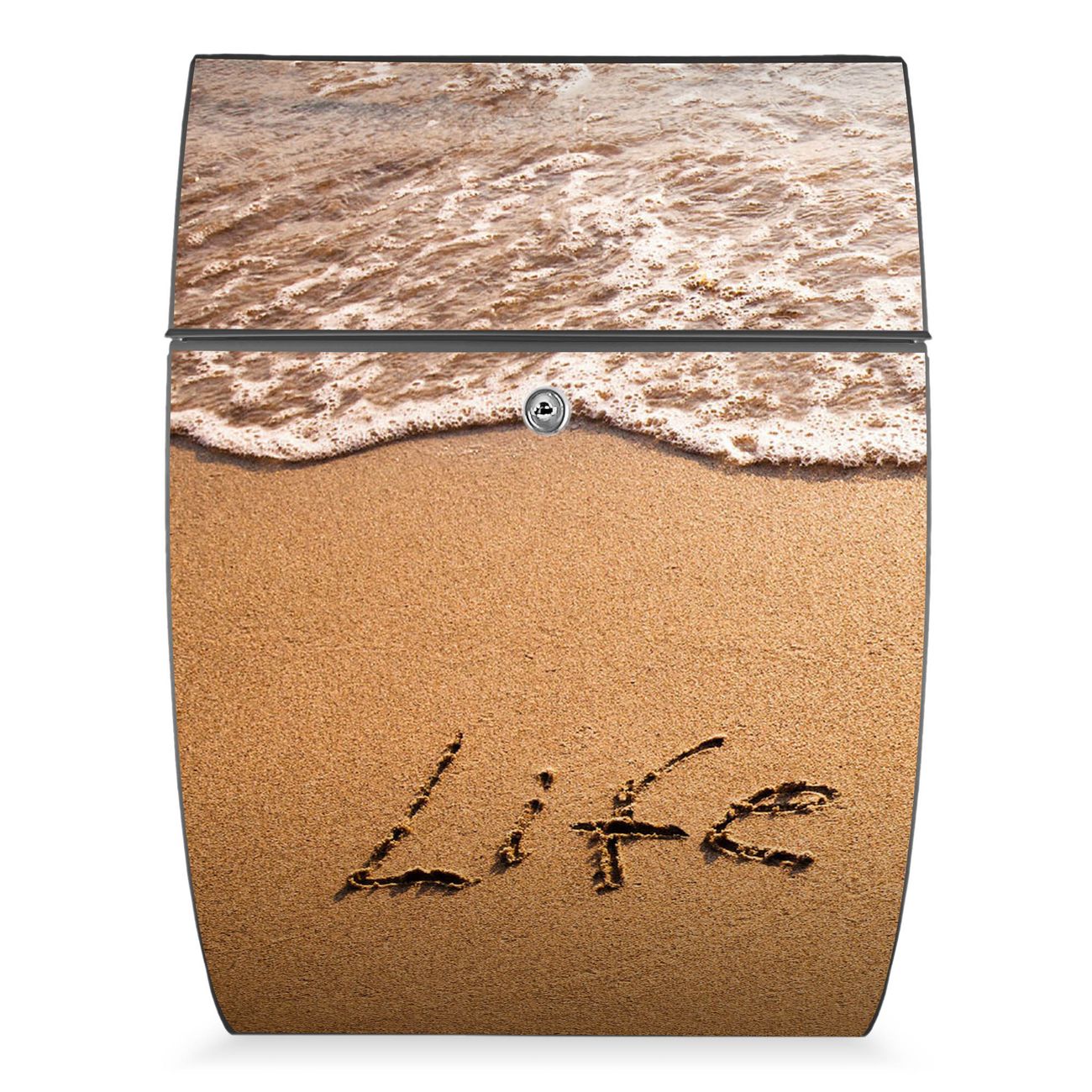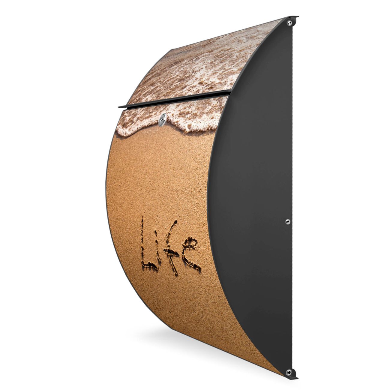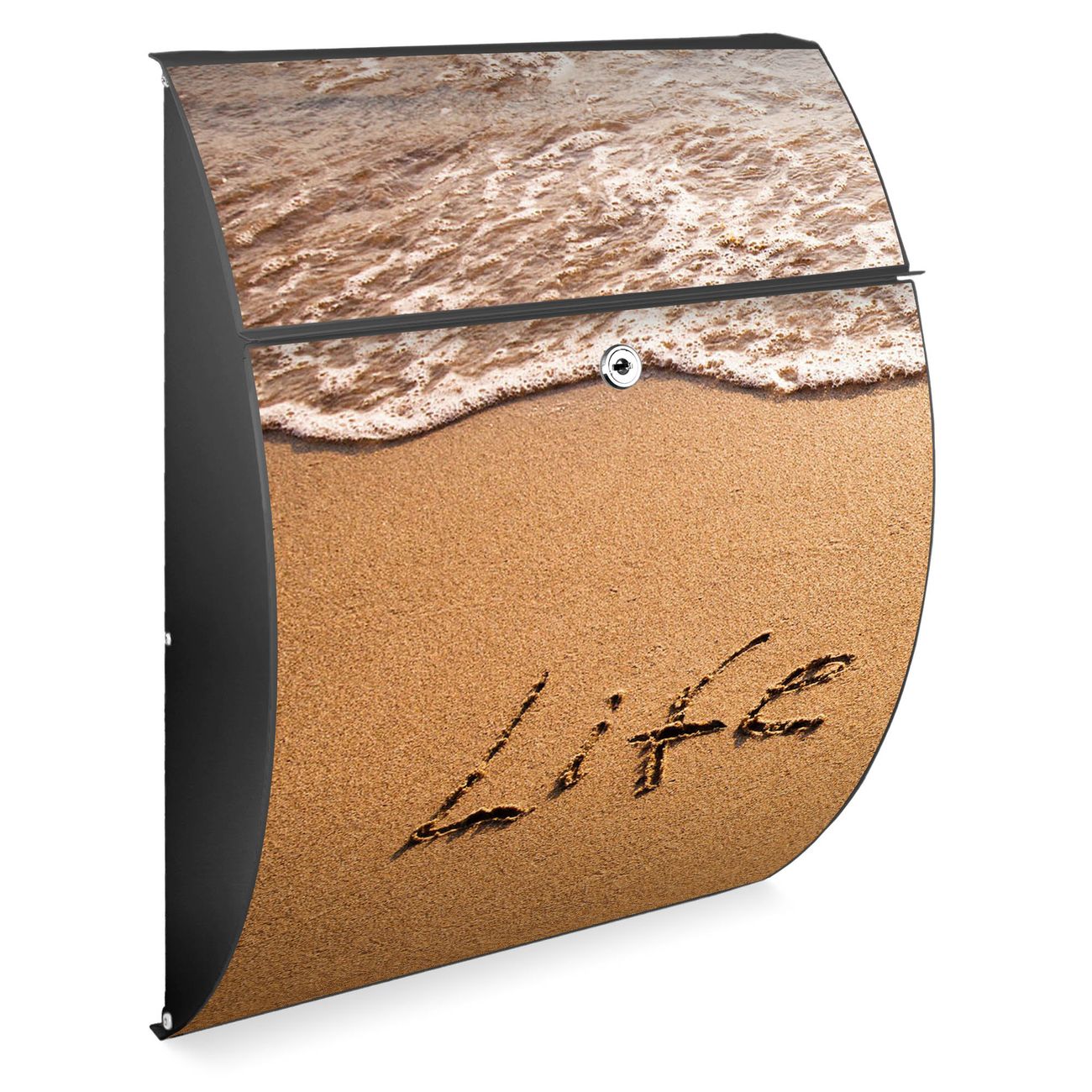 FUNKTION: DESIGN: Das Modell Riviera mit Motiv Life Is Good hat ein sehr ansprechendes und zeitloses Design. Heben Sie Sich von der tristen grauen Masse ab, ohne auf Funktionalität zu verzichten. Der integrierte Öffnungsstopp ermöglicht eine einfache Handhabung beim Entnehmen der Post. DETAILS: Der Postkasten besteht aus vollflächig verzinktem Stahl welcher in Anthrazit lackiert wurde. Das Motiv besteht aus einer wetter- und UV-festen Folie, die mit einem Schutzlaminat überzogen ist, durch die Ihren Briefkasten zusätzlich vor Kratzern geschützt ist. Sie erhalten 2 Schlüssel sowie das passende Montagematerial. NUTZEN: Sie können den Briefkasten sowohl als Wandbriefkasten montieren oder einen passenden Ständer kaufen und als Standbriefkasten einbetonieren. Die Größe bietet genügend Platz für Sendungen aller Art, der Einwurf fasst auch größere A4 Sendungen. BANJADO: Ihr Briefkasten wird in Sachsen in einer kleinen Manufaktur von Hand veredelt. Die Motivfolie ist lösungsmittelfrei und schutzlaminiert, dies sorgt für einen langen Halt. Wir legen großen Wert auf die Verbindung von Funktionalität und Design. Sie erhalten Handarbeit aus Sachsen.