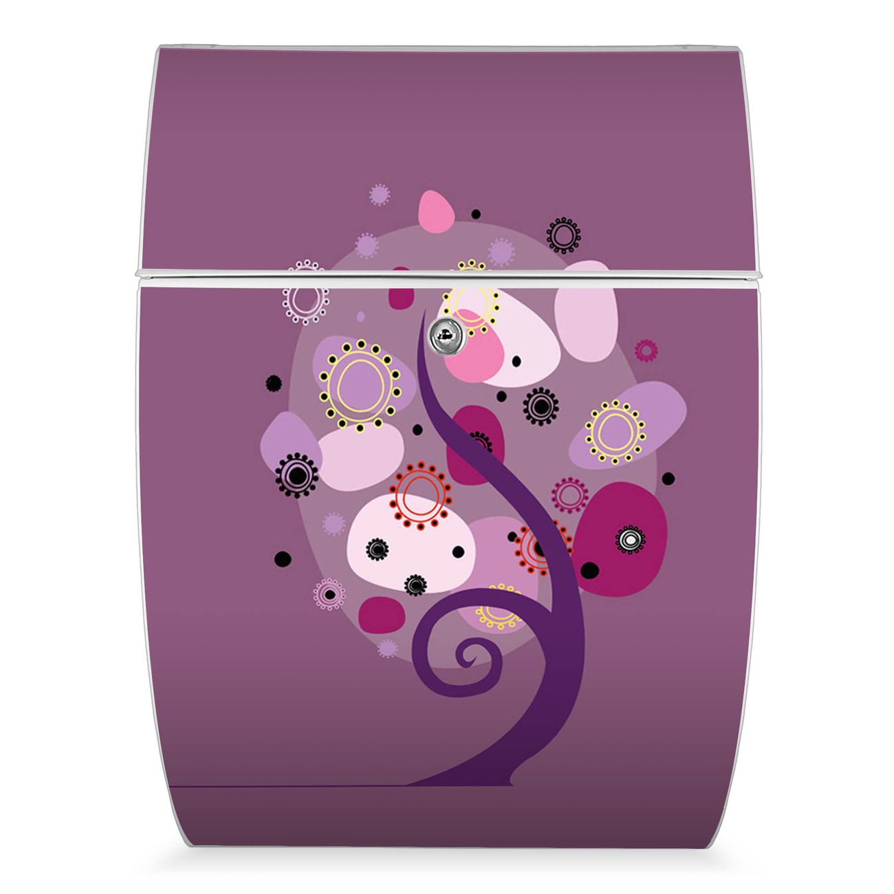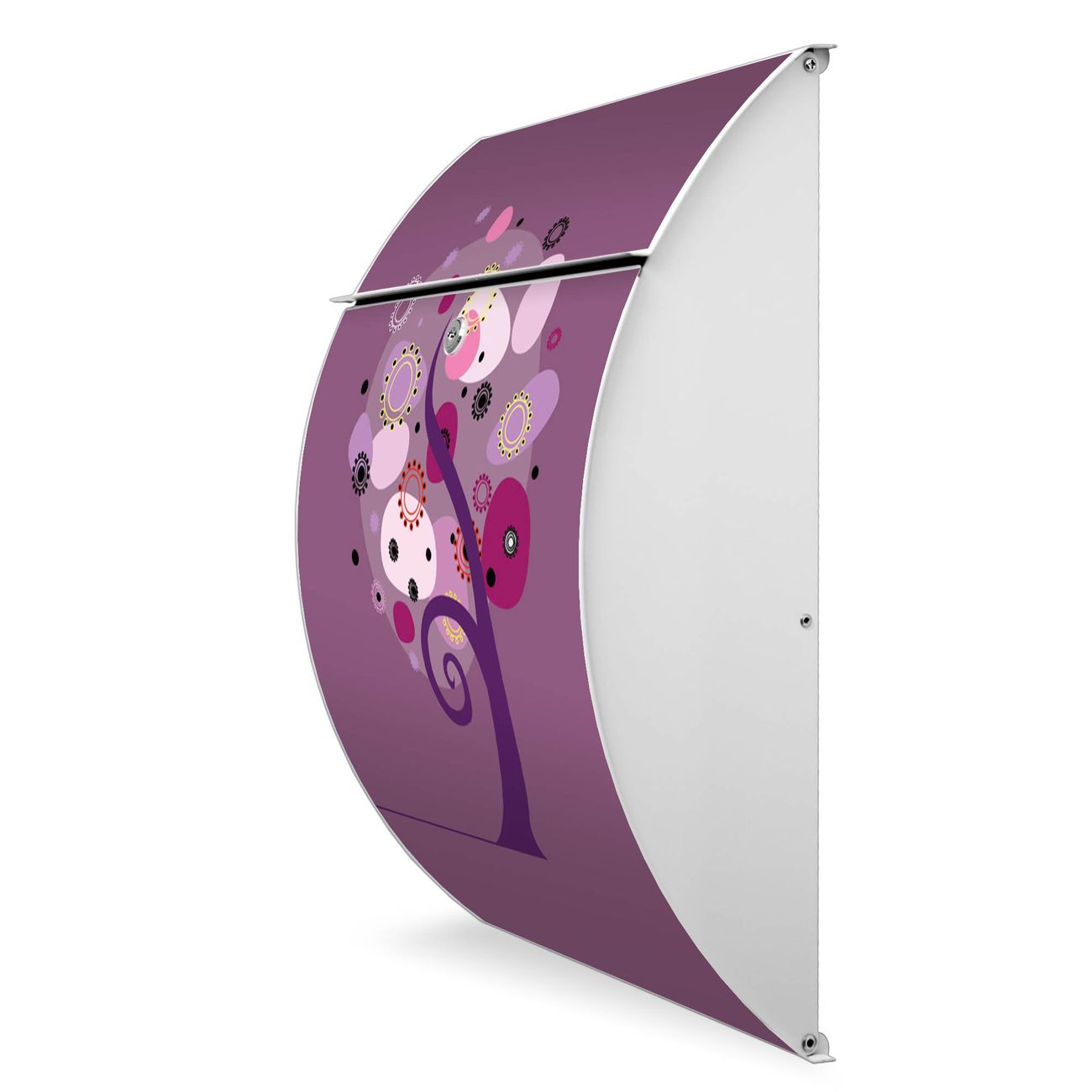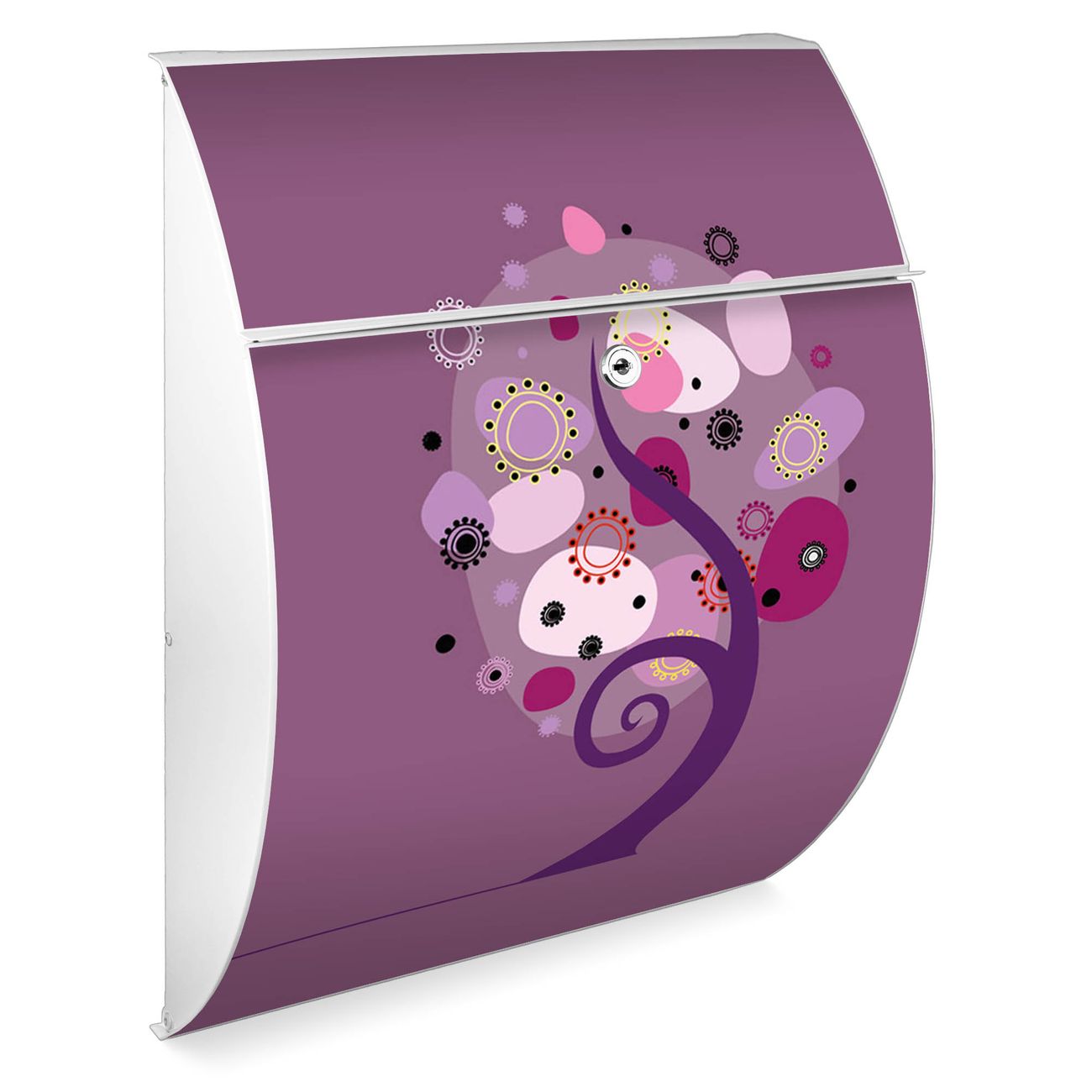 Der weiße Burg Wächter Design Briefkasten mit Motiv Lila Baum bietet Ihnen mit seinem Fassungsvermögen genügend Platz auch für große A4 Sendungen. Auf Wunsch können Sie bei uns auch den passenden Ständer kaufen und so aus dem Wandbriefkasten einen Standbriefkasten machen.