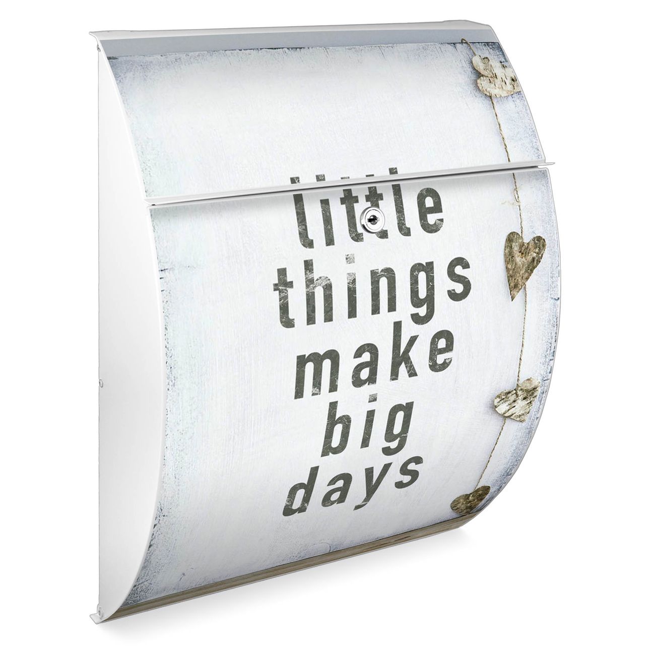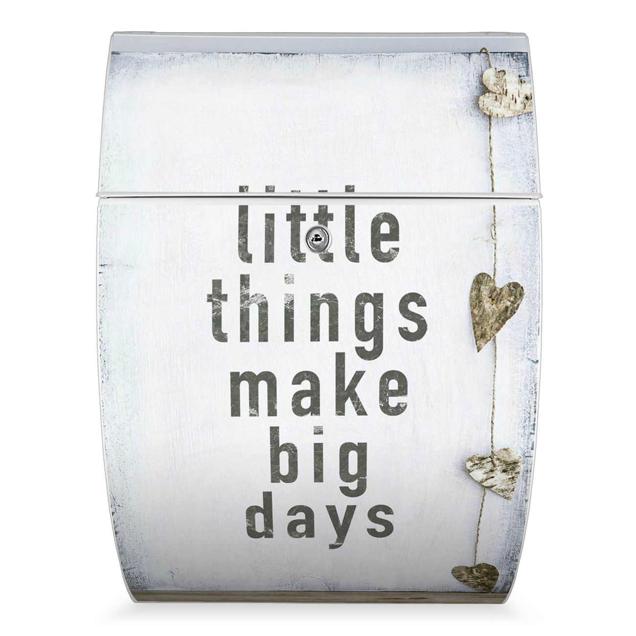 Der weiße Burg Wächter Design Briefkasten mit Motiv Little Things bietet Ihnen mit seinem Fassungsvermögen genügend Platz auch für große A4 Sendungen. Auf Wunsch können Sie bei uns auch den passenden Ständer kaufen und so aus dem Wandbriefkasten einen Standbriefkasten machen.