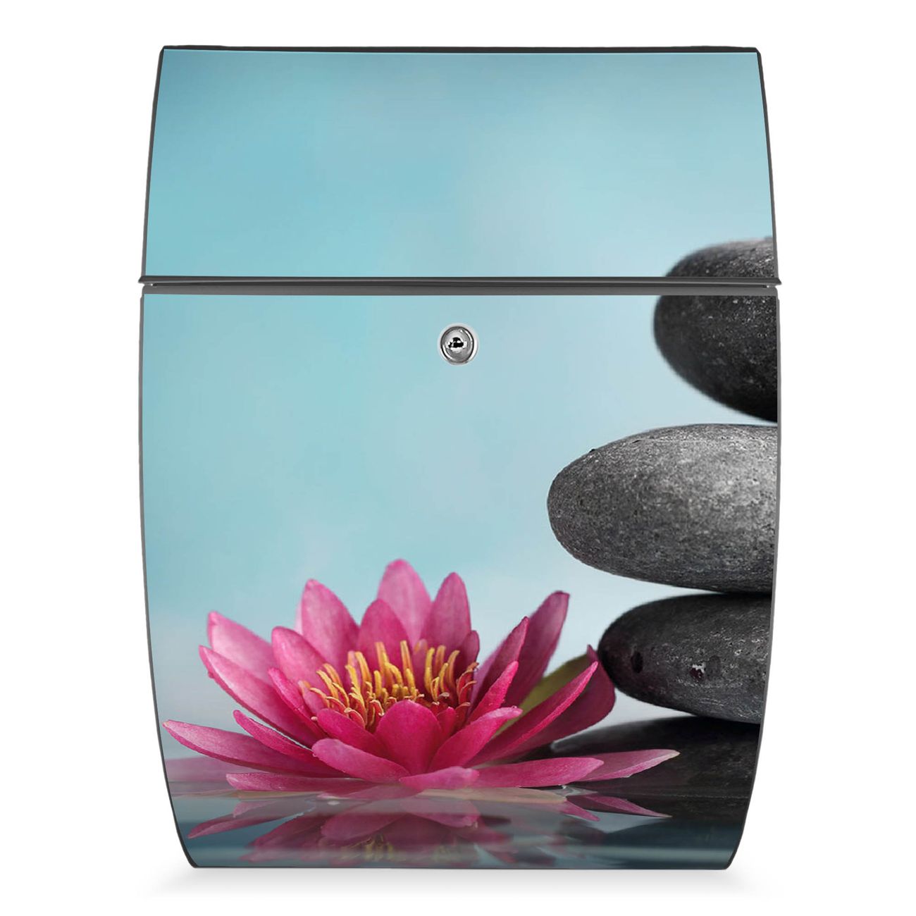 Der Burg Wächter Design Briefkasten mit Motiv Lotus Und Steine bietet Ihnen mit seinem Fassungsvermögen genügend Platz auch für große A4 Sendungen. Auf Wunsch können Sie bei uns den passenden Ständer kaufen und so aus dem Wandbriefkasten einen Standbriefkasten machen.