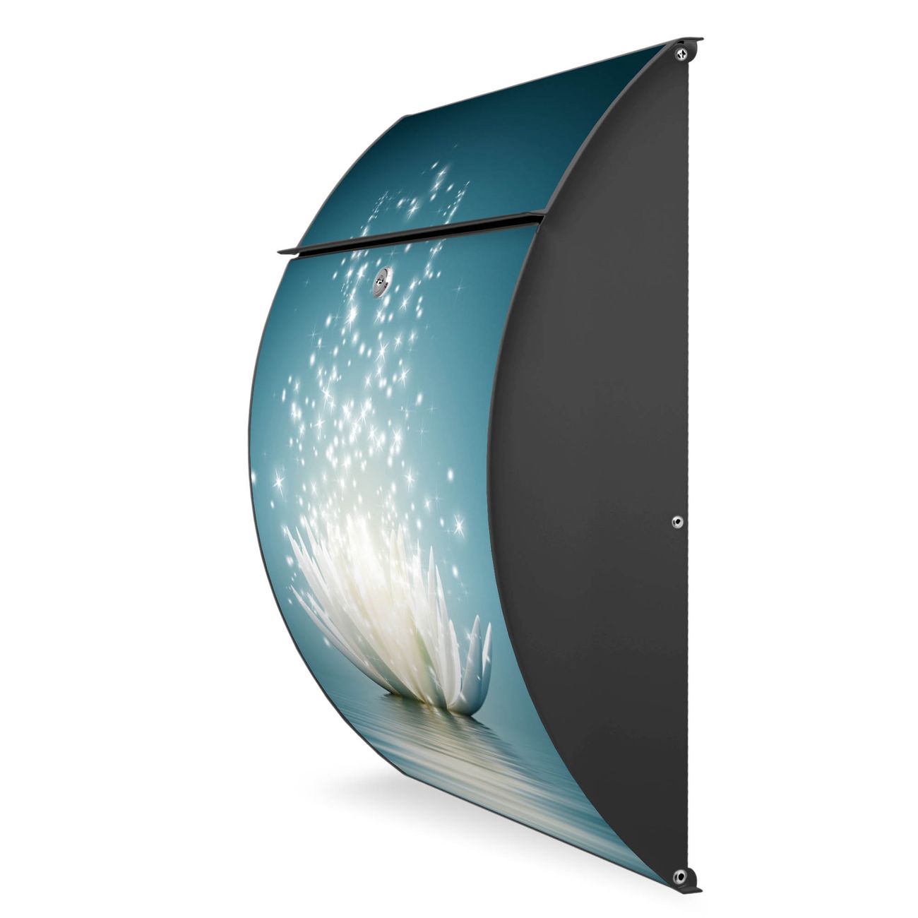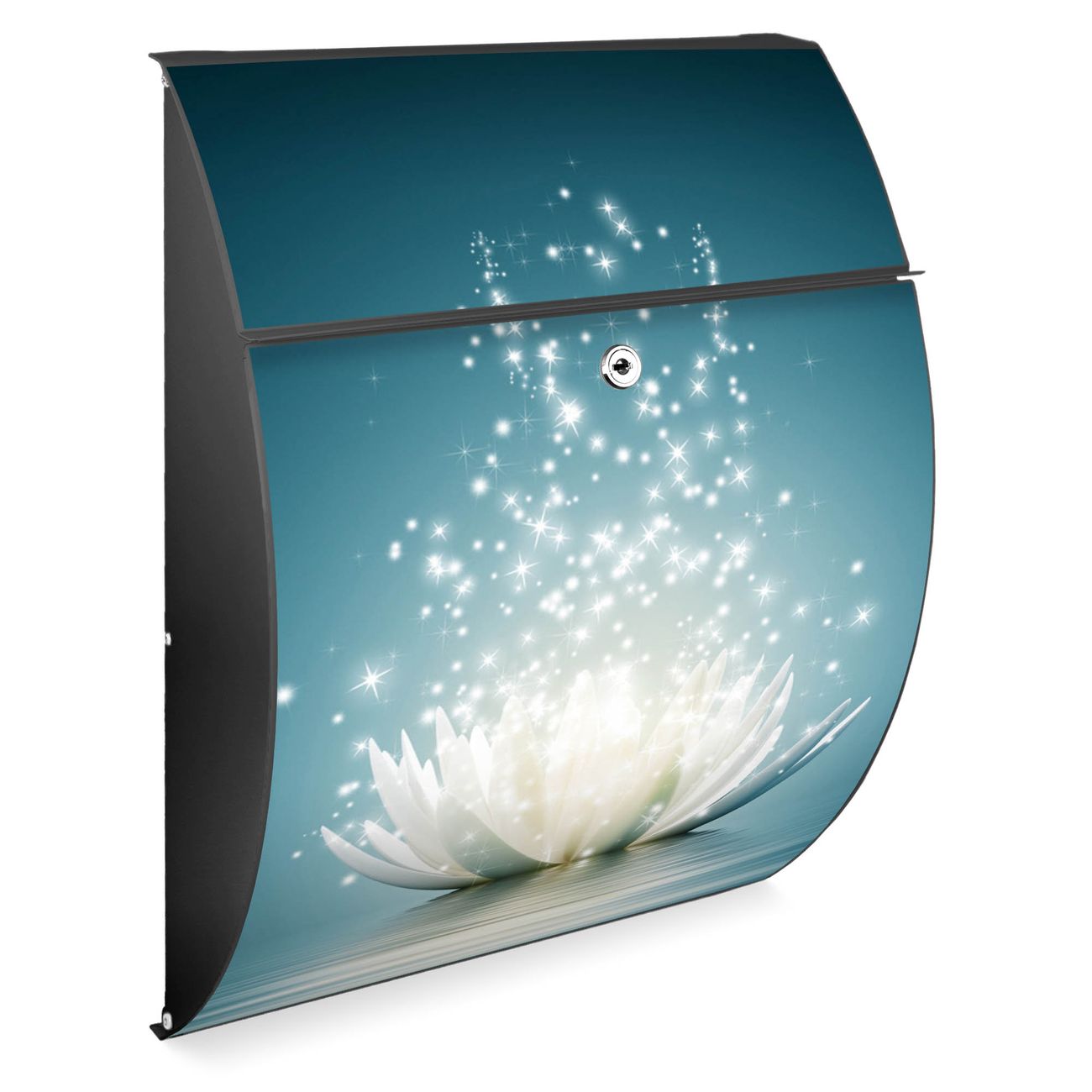 FUNKTION: DESIGN: Das Modell Riviera mit Motiv Magische Lotusblüte hat ein sehr ansprechendes und zeitloses Design. Heben Sie Sich von der tristen grauen Masse ab, ohne auf Funktionalität zu verzichten. Der integrierte Öffnungsstopp ermöglicht eine einfache Handhabung beim Entnehmen der Post. DETAILS: Der Postkasten besteht aus vollflächig verzinktem Stahl welcher in Anthrazit lackiert wurde. Das Motiv besteht aus einer wetter- und UV-festen Folie, die mit einem Schutzlaminat überzogen ist, durch die Ihren Briefkasten zusätzlich vor Kratzern geschützt ist. Sie erhalten 2 Schlüssel sowie das passende Montagematerial. NUTZEN: Sie können den Briefkasten sowohl als Wandbriefkasten montieren oder einen passenden Ständer kaufen und als Standbriefkasten einbetonieren. Die Größe bietet genügend Platz für Sendungen aller Art, der Einwurf fasst auch größere A4 Sendungen. BANJADO: Ihr Briefkasten wird in Sachsen in einer kleinen Manufaktur von Hand veredelt. Die Motivfolie ist lösungsmittelfrei und schutzlaminiert, dies sorgt für einen langen Halt. Wir legen großen Wert auf die Verbindung von Funktionalität und Design. Sie erhalten Handarbeit aus Sachsen.