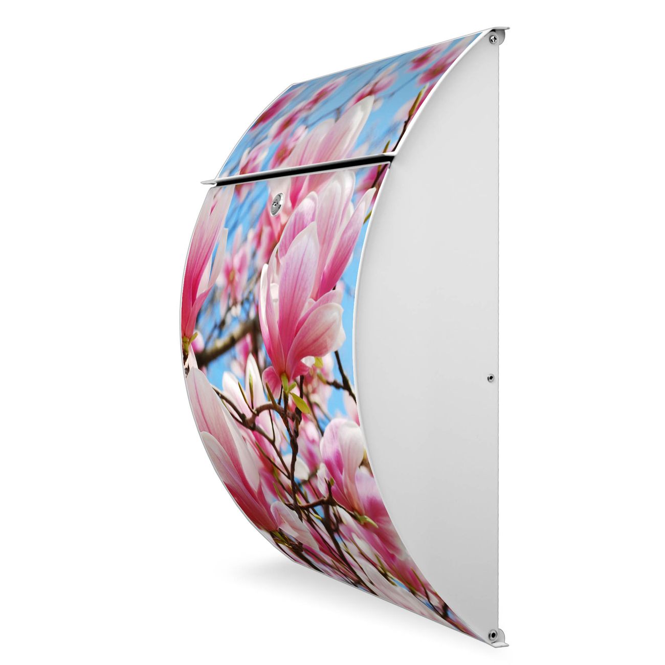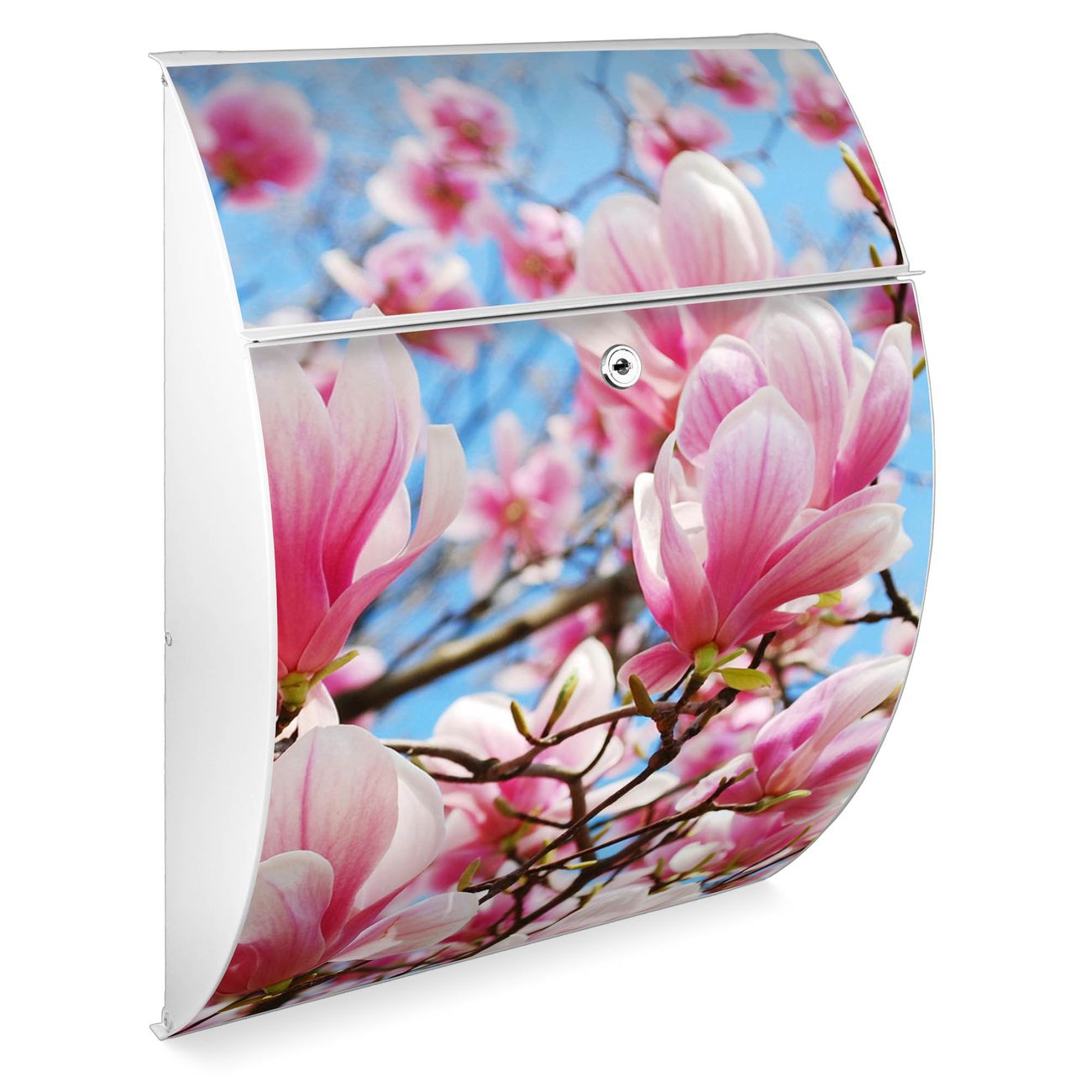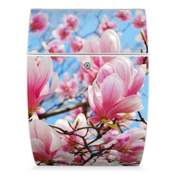 Der weiße Burg Wächter Design Briefkasten mit Motiv Magnolienbaum bietet Ihnen mit seinem Fassungsvermögen genügend Platz auch für große A4 Sendungen. Auf Wunsch können Sie bei uns auch den passenden Ständer kaufen und so aus dem Wandbriefkasten einen Standbriefkasten machen.