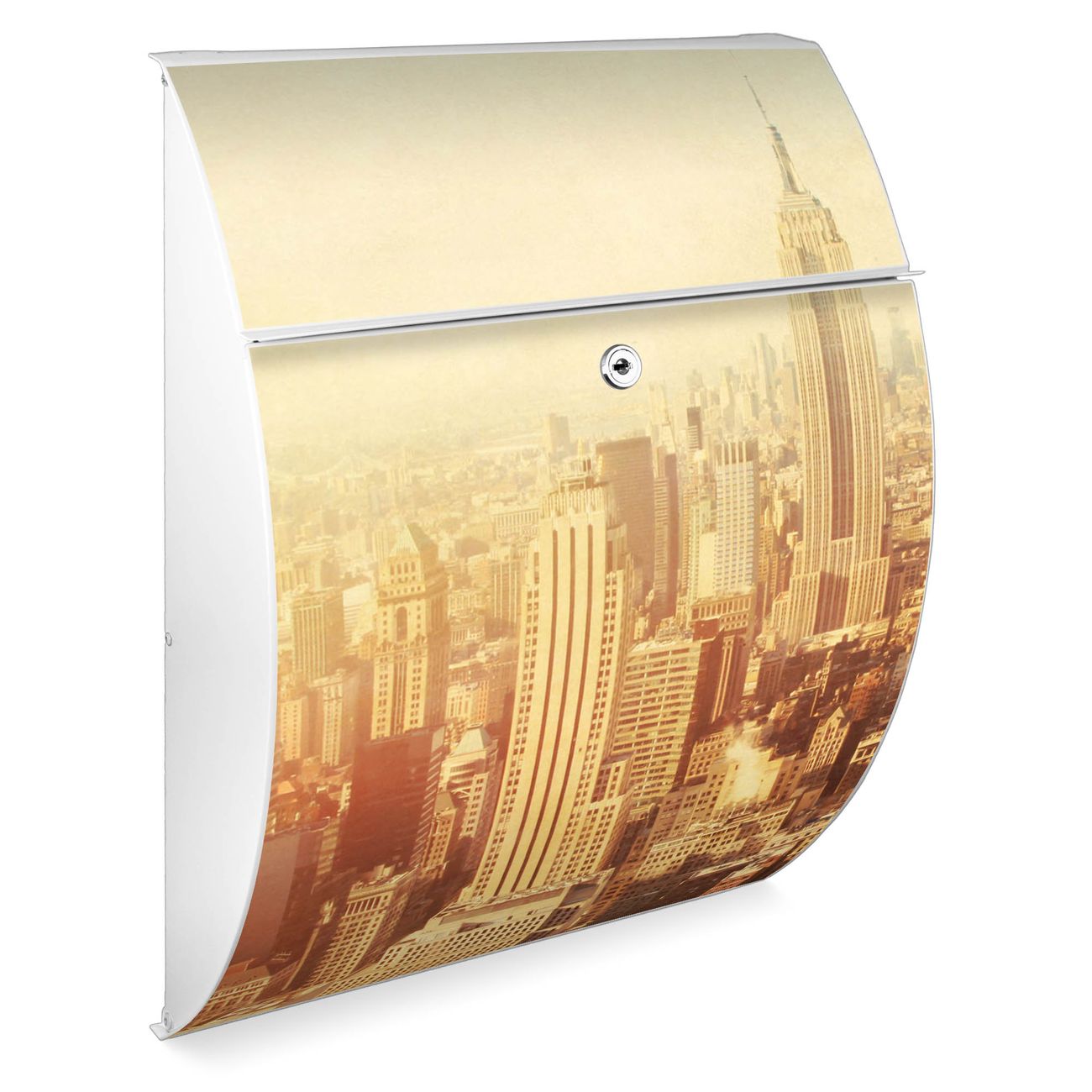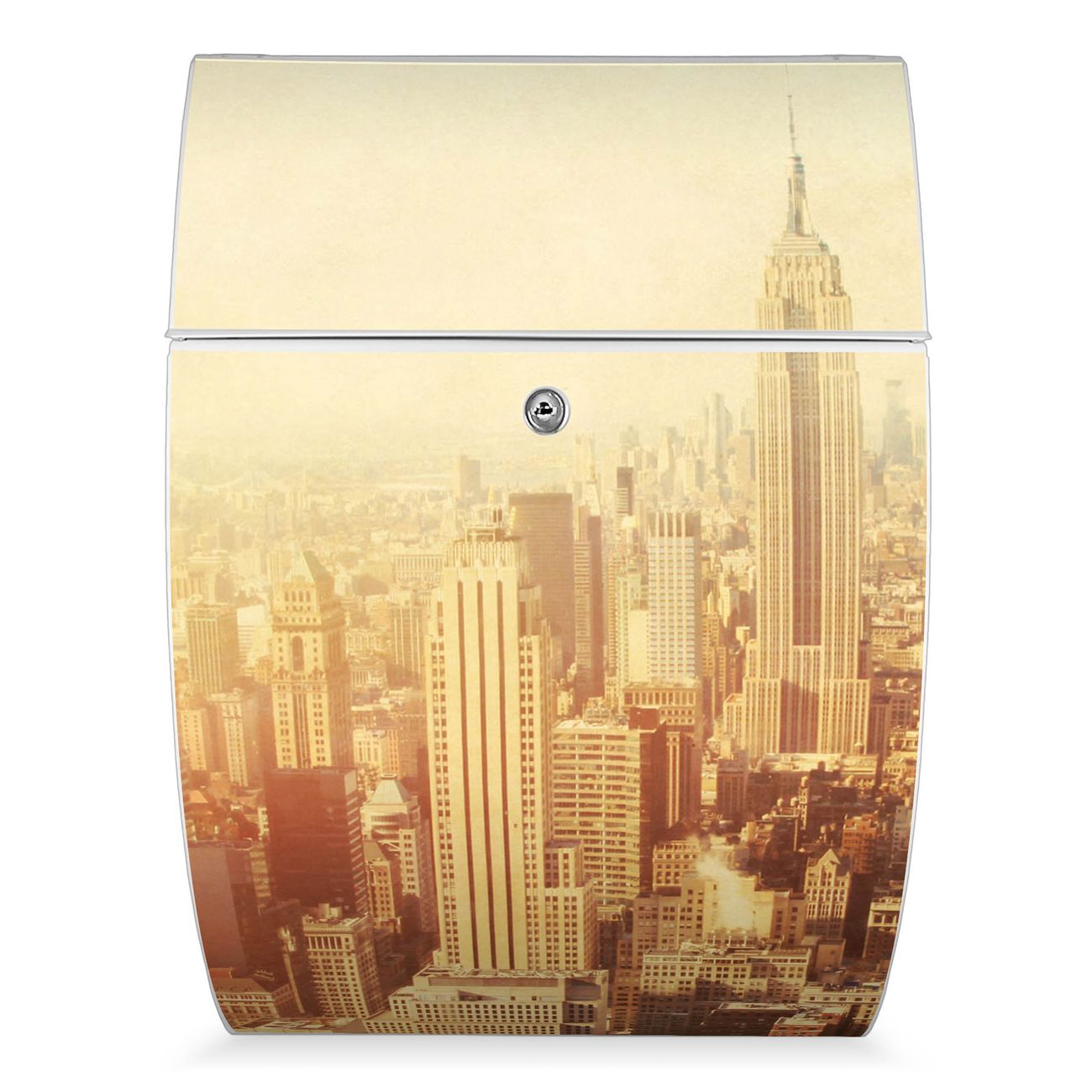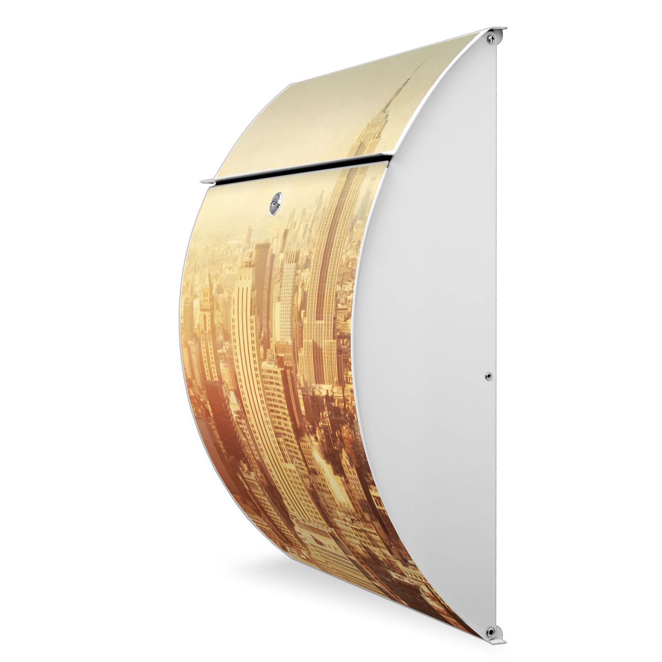 Der weiße Burg Wächter Design Briefkasten mit Motiv Manhattan 2 bietet Ihnen mit seinem Fassungsvermögen genügend Platz auch für große A4 Sendungen. Auf Wunsch können Sie bei uns auch den passenden Ständer kaufen und so aus dem Wandbriefkasten einen Standbriefkasten machen.