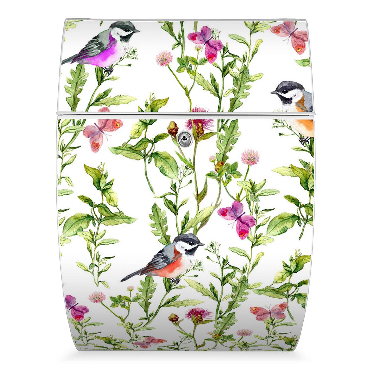 Der weiße Burg Wächter Design Briefkasten mit Motiv Meisen im Klee bietet Ihnen mit seinem Fassungsvermögen genügend Platz auch für große A4 Sendungen. Auf Wunsch können Sie bei uns auch den passenden Ständer kaufen und so aus dem Wandbriefkasten einen Standbriefkasten machen.