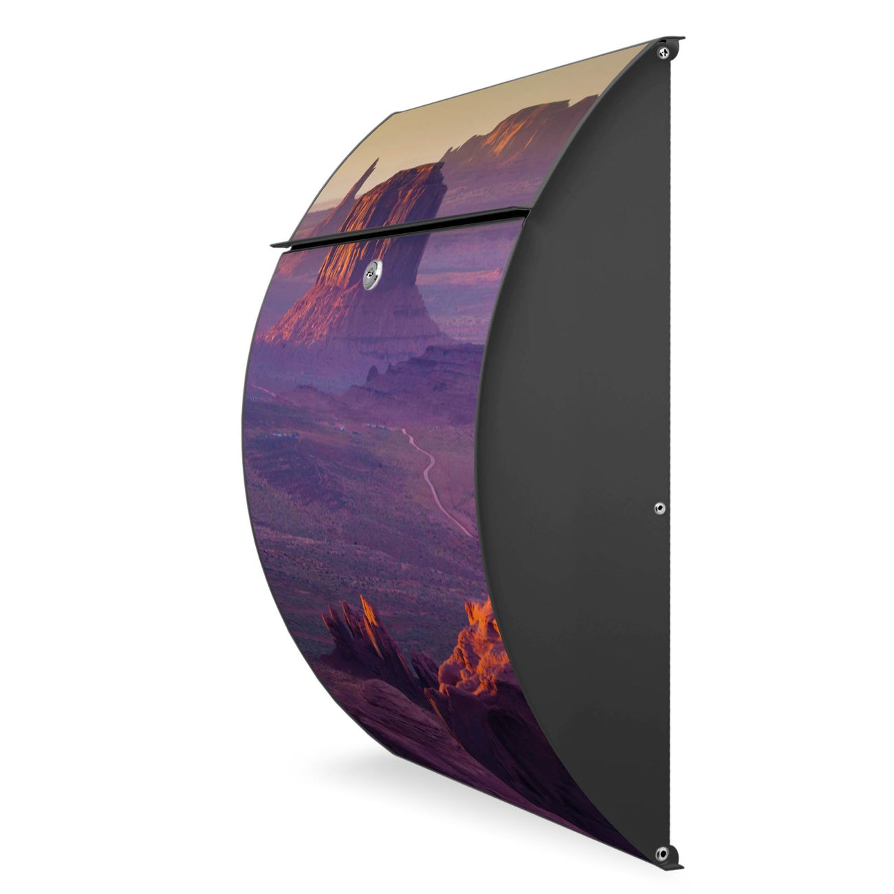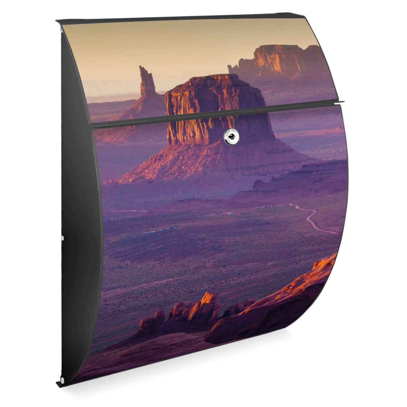 FUNKTION: DESIGN: Das Modell Riviera mit Motiv Monument Valley hat ein sehr ansprechendes und zeitloses Design. Heben Sie Sich von der tristen grauen Masse ab, ohne auf Funktionalität zu verzichten. Der integrierte Öffnungsstopp ermöglicht eine einfache Handhabung beim Entnehmen der Post. DETAILS: Der Postkasten besteht aus vollflächig verzinktem Stahl welcher in Anthrazit lackiert wurde. Das Motiv besteht aus einer wetter- und UV-festen Folie, die mit einem Schutzlaminat überzogen ist, durch die Ihren Briefkasten zusätzlich vor Kratzern geschützt ist. Sie erhalten 2 Schlüssel sowie das passende Montagematerial. NUTZEN: Sie können den Briefkasten sowohl als Wandbriefkasten montieren oder einen passenden Ständer kaufen und als Standbriefkasten einbetonieren. Die Größe bietet genügend Platz für Sendungen aller Art, der Einwurf fasst auch größere A4 Sendungen. BANJADO: Ihr Briefkasten wird in Sachsen in einer kleinen Manufaktur von Hand veredelt. Die Motivfolie ist lösungsmittelfrei und schutzlaminiert, dies sorgt für einen langen Halt. Wir legen großen Wert auf die Verbindung von Funktionalität und Design. Sie erhalten Handarbeit aus Sachsen.