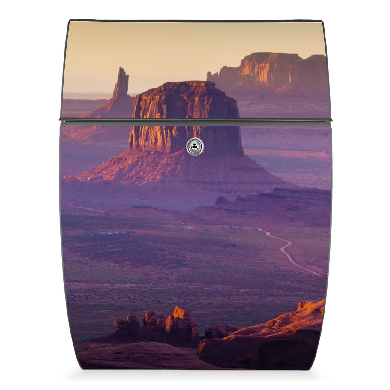 Der Burg Wächter Design Briefkasten mit Motiv Monument Valley bietet Ihnen mit seinem Fassungsvermögen genügend Platz auch für große A4 Sendungen. Auf Wunsch können Sie bei uns den passenden Ständer kaufen und so aus dem Wandbriefkasten einen Standbriefkasten machen.