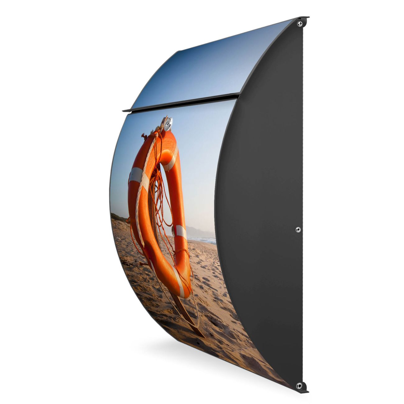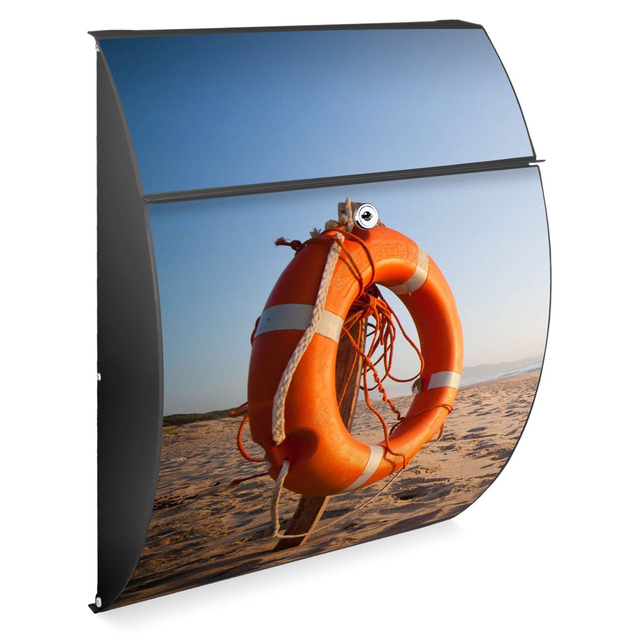 FUNKTION: DESIGN: Das Modell Riviera mit Motiv Morgens Am Strand hat ein sehr ansprechendes und zeitloses Design. Heben Sie Sich von der tristen grauen Masse ab, ohne auf Funktionalität zu verzichten. Der integrierte Öffnungsstopp ermöglicht eine einfache Handhabung beim Entnehmen der Post. DETAILS: Der Postkasten besteht aus vollflächig verzinktem Stahl welcher in Anthrazit lackiert wurde. Das Motiv besteht aus einer wetter- und UV-festen Folie, die mit einem Schutzlaminat überzogen ist, durch die Ihren Briefkasten zusätzlich vor Kratzern geschützt ist. Sie erhalten 2 Schlüssel sowie das passende Montagematerial. NUTZEN: Sie können den Briefkasten sowohl als Wandbriefkasten montieren oder einen passenden Ständer kaufen und als Standbriefkasten einbetonieren. Die Größe bietet genügend Platz für Sendungen aller Art, der Einwurf fasst auch größere A4 Sendungen. BANJADO: Ihr Briefkasten wird in Sachsen in einer kleinen Manufaktur von Hand veredelt. Die Motivfolie ist lösungsmittelfrei und schutzlaminiert, dies sorgt für einen langen Halt. Wir legen großen Wert auf die Verbindung von Funktionalität und Design. Sie erhalten Handarbeit aus Sachsen.