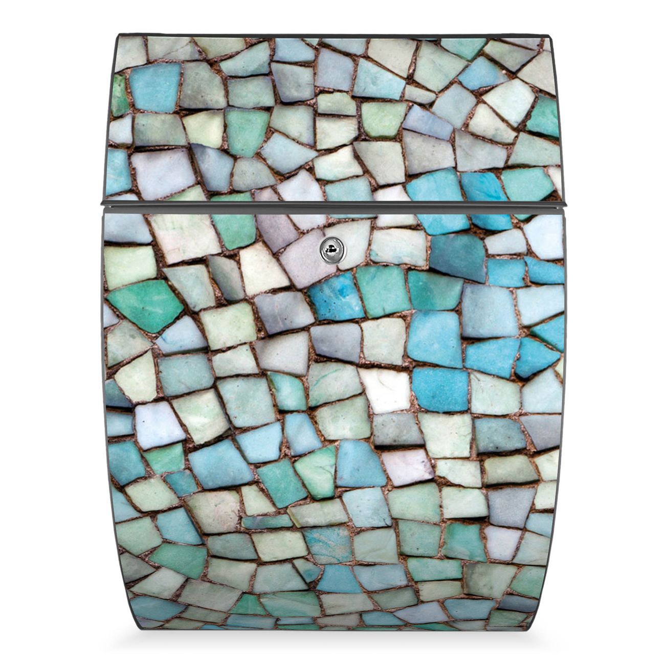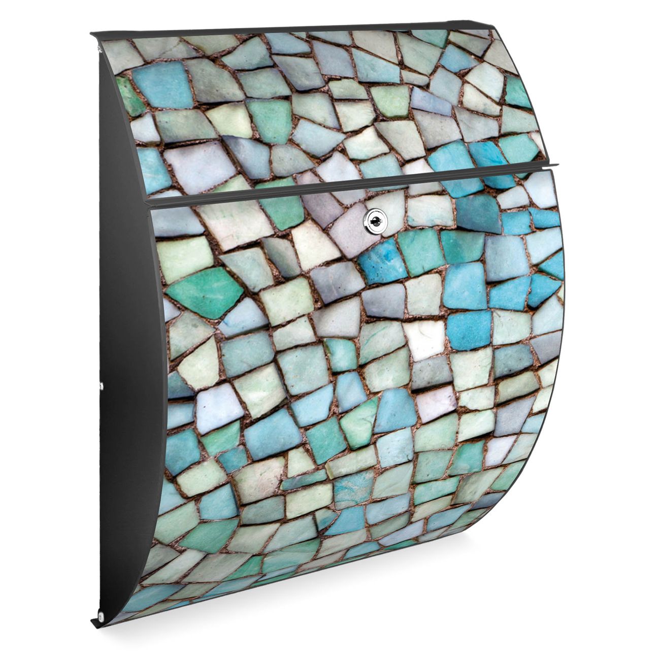 FUNKTION: DESIGN: Das Modell Riviera mit Motiv Mosaik Blau hat ein sehr ansprechendes und zeitloses Design. Heben Sie Sich von der tristen grauen Masse ab, ohne auf Funktionalität zu verzichten. Der integrierte Öffnungsstopp ermöglicht eine einfache Handhabung beim Entnehmen der Post. DETAILS: Der Postkasten besteht aus vollflächig verzinktem Stahl welcher in Anthrazit lackiert wurde. Das Motiv besteht aus einer wetter- und UV-festen Folie, die mit einem Schutzlaminat überzogen ist, durch die Ihren Briefkasten zusätzlich vor Kratzern geschützt ist. Sie erhalten 2 Schlüssel sowie das passende Montagematerial. NUTZEN: Sie können den Briefkasten sowohl als Wandbriefkasten montieren oder einen passenden Ständer kaufen und als Standbriefkasten einbetonieren. Die Größe bietet genügend Platz für Sendungen aller Art, der Einwurf fasst auch größere A4 Sendungen. BANJADO: Ihr Briefkasten wird in Sachsen in einer kleinen Manufaktur von Hand veredelt. Die Motivfolie ist lösungsmittelfrei und schutzlaminiert, dies sorgt für einen langen Halt. Wir legen großen Wert auf die Verbindung von Funktionalität und Design. Sie erhalten Handarbeit aus Sachsen.