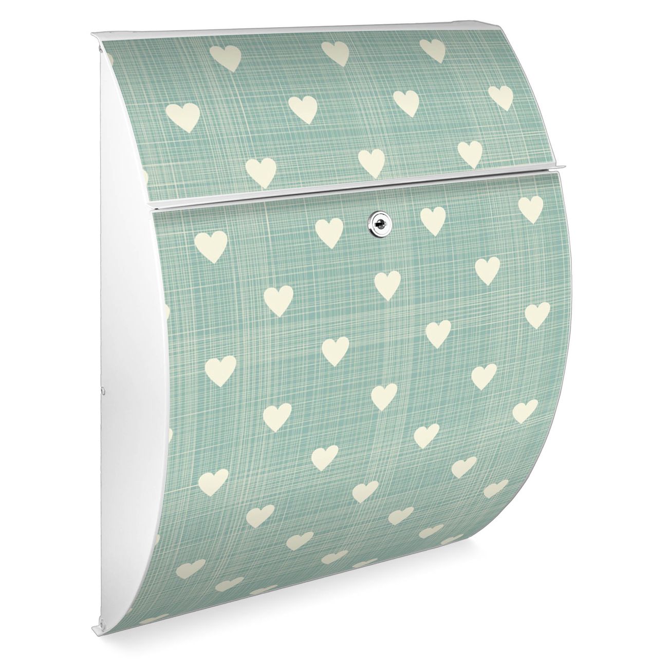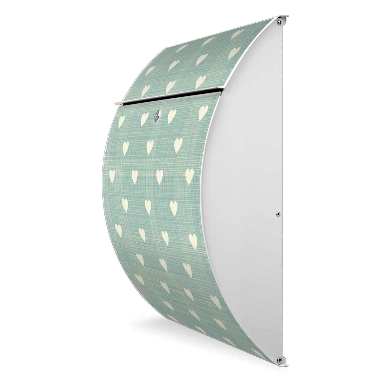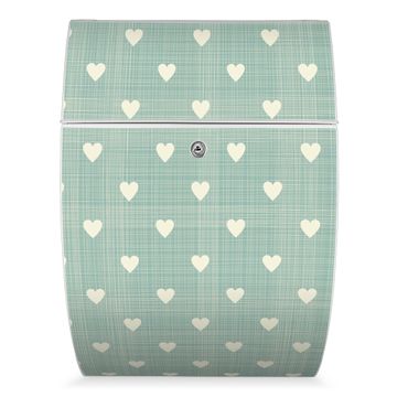 FUNKTION: DESIGN: Das Modell Riviera mit Motiv Muster Herzen hat ein sehr ansprechendes und zeitloses Design. Heben Sie Sich von der tristen grauen Masse ab, ohne auf Funktionalität zu verzichten. Der integrierte Öffnungsstopp ermöglicht eine einfache Handhabung beim Entnehmen der Post. DETAILS: Der Postkasten besteht aus vollflächig verzinktem Stahl welcher in weiß lackiert wurde. Das Motiv besteht aus einer wetter- und UV-festen Folie, die mit einem Schutzlaminat überzogen ist, durch die Ihren Briefkasten zusätzlich vor Kratzern geschützt ist. Sie erhalten 2 Schlüssel sowie das passende Montagematerial. NUTZEN: Sie können den Briefkasten sowohl als Wandbriefkasten montieren oder einen passenden Ständer kaufen und als Standbriefkasten einbetonieren. Die Größe bietet genügend Platz für Sendungen aller Art, der Einwurf fasst auch größere A4 Sendungen. BANJADO: Ihr Briefkasten wird in Sachsen in einer kleinen Manufaktur von Hand veredelt. Die Motivfolie ist lösungsmittelfrei und schutzlaminiert, dies sorgt für einen langen Halt. Wir legen großen Wert auf die Verbindung von Funktionalität und Design. Sie erhalten Handarbeit aus Sachsen.