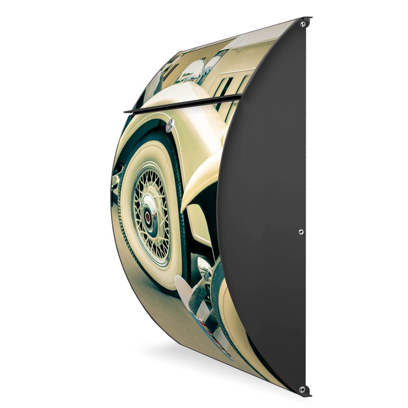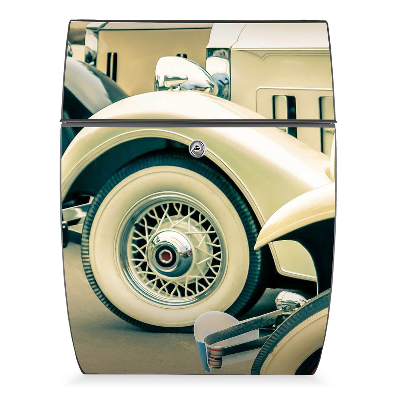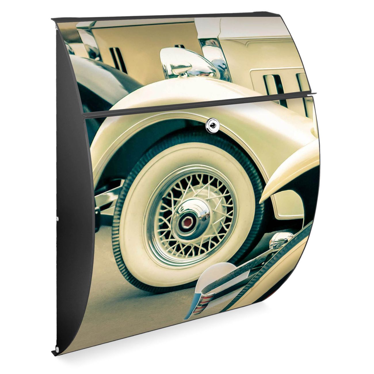 FUNKTION: DESIGN: Das Modell Riviera mit Motiv Oldtimer Räder hat ein sehr ansprechendes und zeitloses Design. Heben Sie Sich von der tristen grauen Masse ab, ohne auf Funktionalität zu verzichten. Der integrierte Öffnungsstopp ermöglicht eine einfache Handhabung beim Entnehmen der Post. DETAILS: Der Postkasten besteht aus vollflächig verzinktem Stahl welcher in Anthrazit lackiert wurde. Das Motiv besteht aus einer wetter- und UV-festen Folie, die mit einem Schutzlaminat überzogen ist, durch die Ihren Briefkasten zusätzlich vor Kratzern geschützt ist. Sie erhalten 2 Schlüssel sowie das passende Montagematerial. NUTZEN: Sie können den Briefkasten sowohl als Wandbriefkasten montieren oder einen passenden Ständer kaufen und als Standbriefkasten einbetonieren. Die Größe bietet genügend Platz für Sendungen aller Art, der Einwurf fasst auch größere A4 Sendungen. BANJADO: Ihr Briefkasten wird in Sachsen in einer kleinen Manufaktur von Hand veredelt. Die Motivfolie ist lösungsmittelfrei und schutzlaminiert, dies sorgt für einen langen Halt. Wir legen großen Wert auf die Verbindung von Funktionalität und Design. Sie erhalten Handarbeit aus Sachsen.