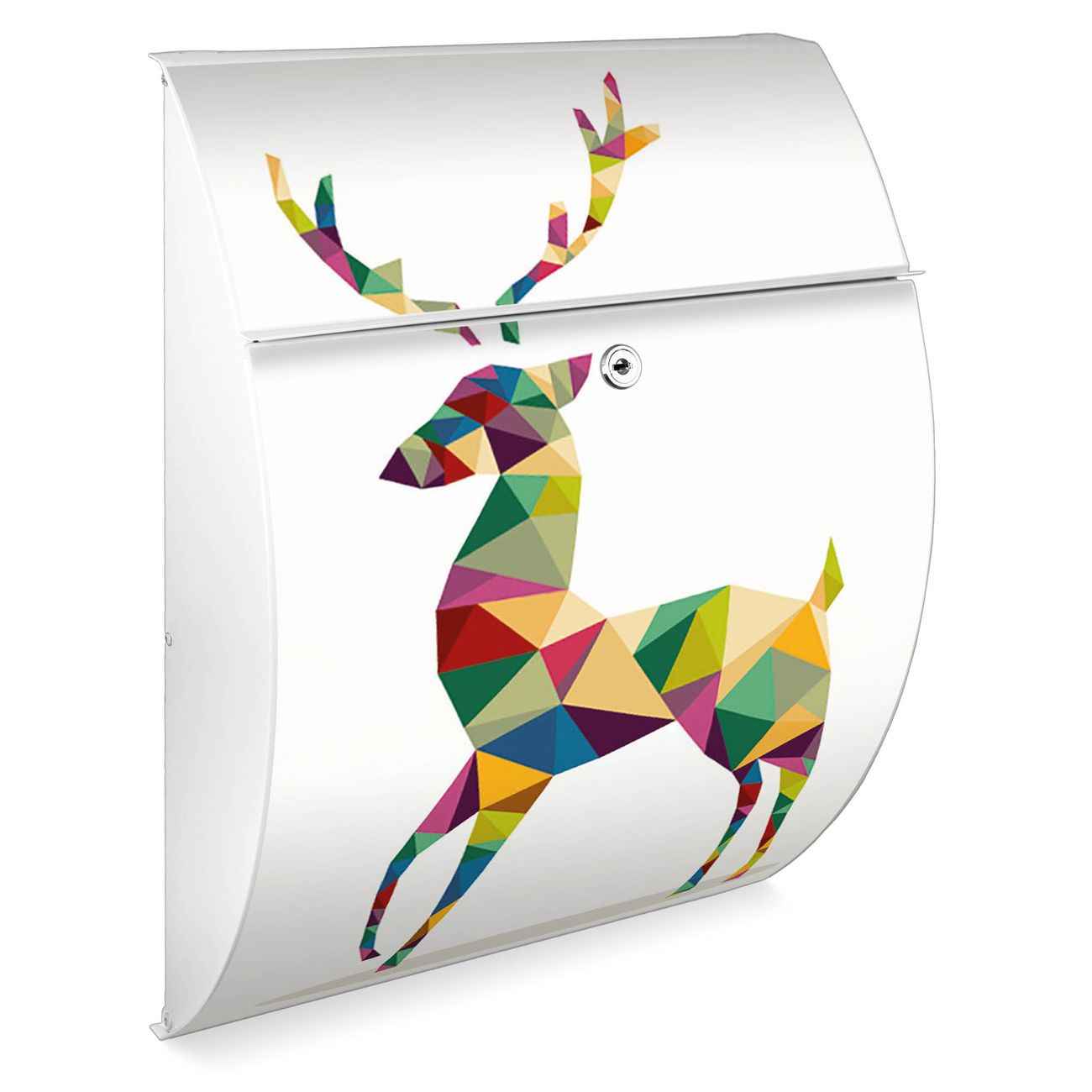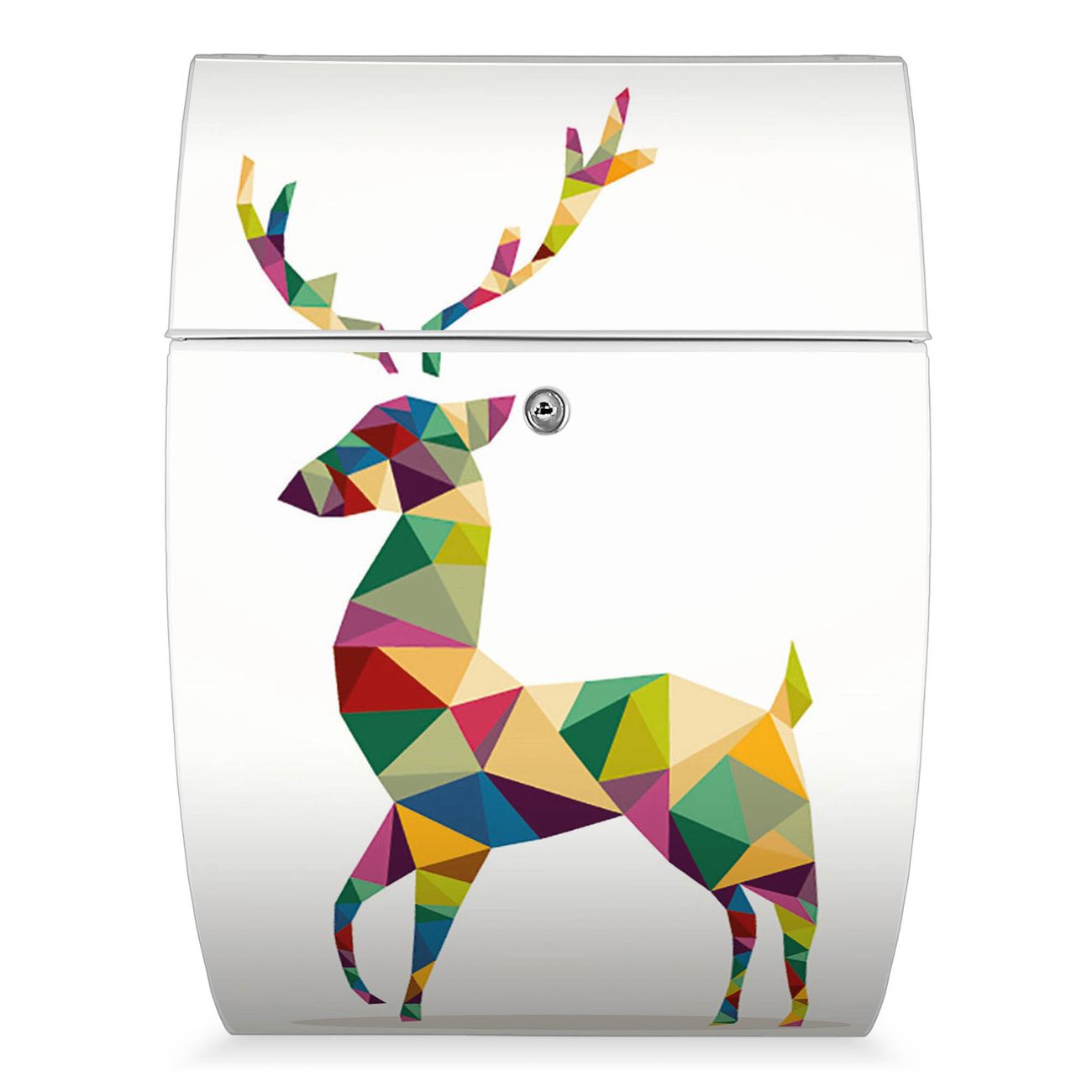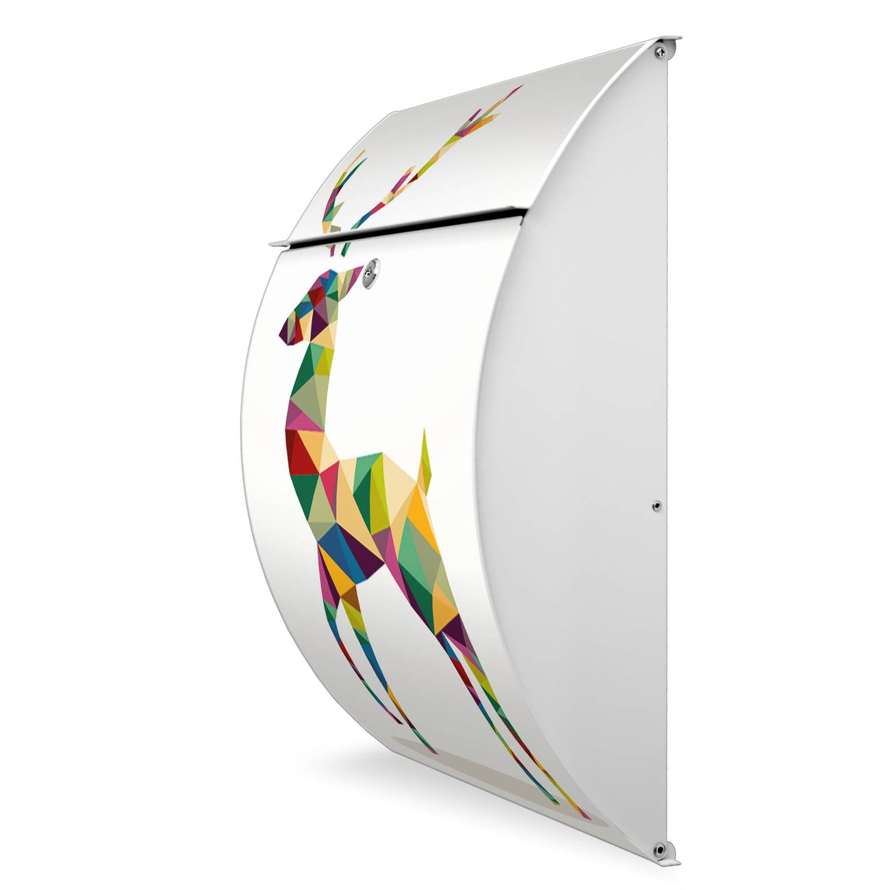 Der weiße Burg Wächter Design Briefkasten mit Motiv Origami Hirsch bietet Ihnen mit seinem Fassungsvermögen genügend Platz auch für große A4 Sendungen. Auf Wunsch können Sie bei uns auch den passenden Ständer kaufen und so aus dem Wandbriefkasten einen Standbriefkasten machen.
