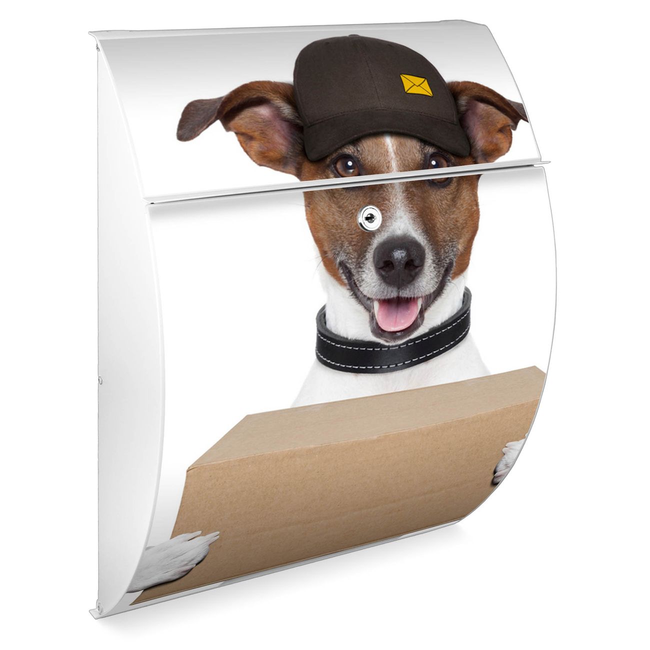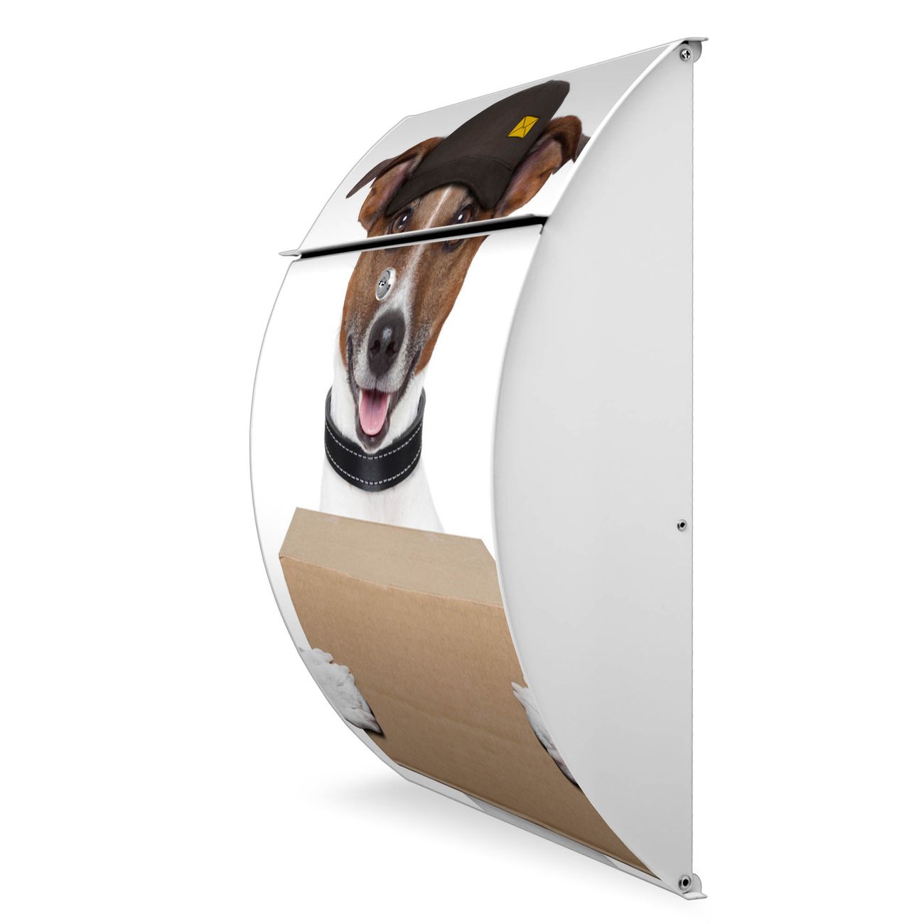 Der weiße Burg Wächter Design Briefkasten mit Motiv Paketdienst Jack Russel bietet Ihnen mit seinem Fassungsvermögen genügend Platz auch für große A4 Sendungen. Auf Wunsch können Sie bei uns auch den passenden Ständer kaufen und so aus dem Wandbriefkasten einen Standbriefkasten machen.