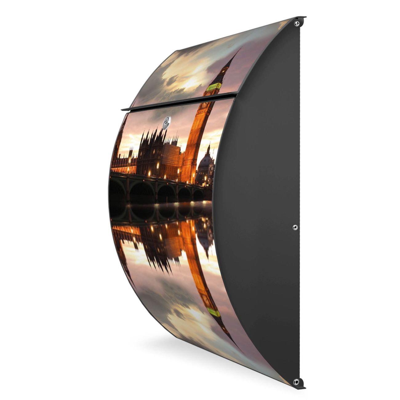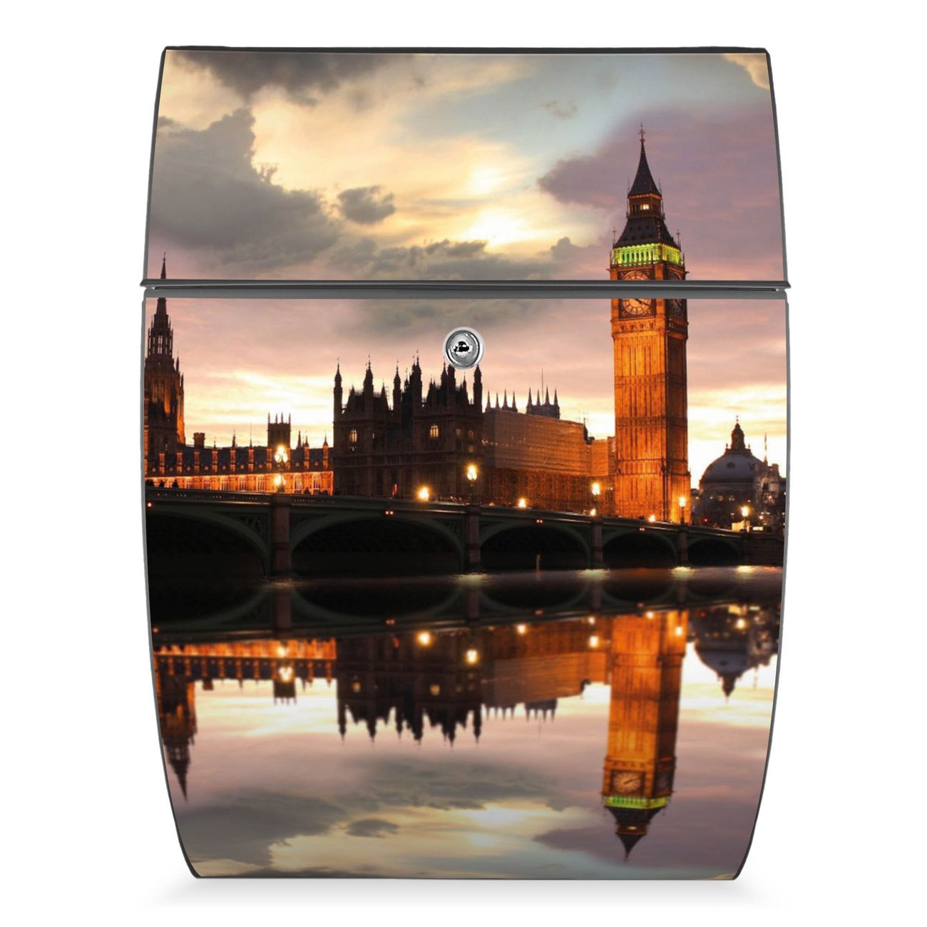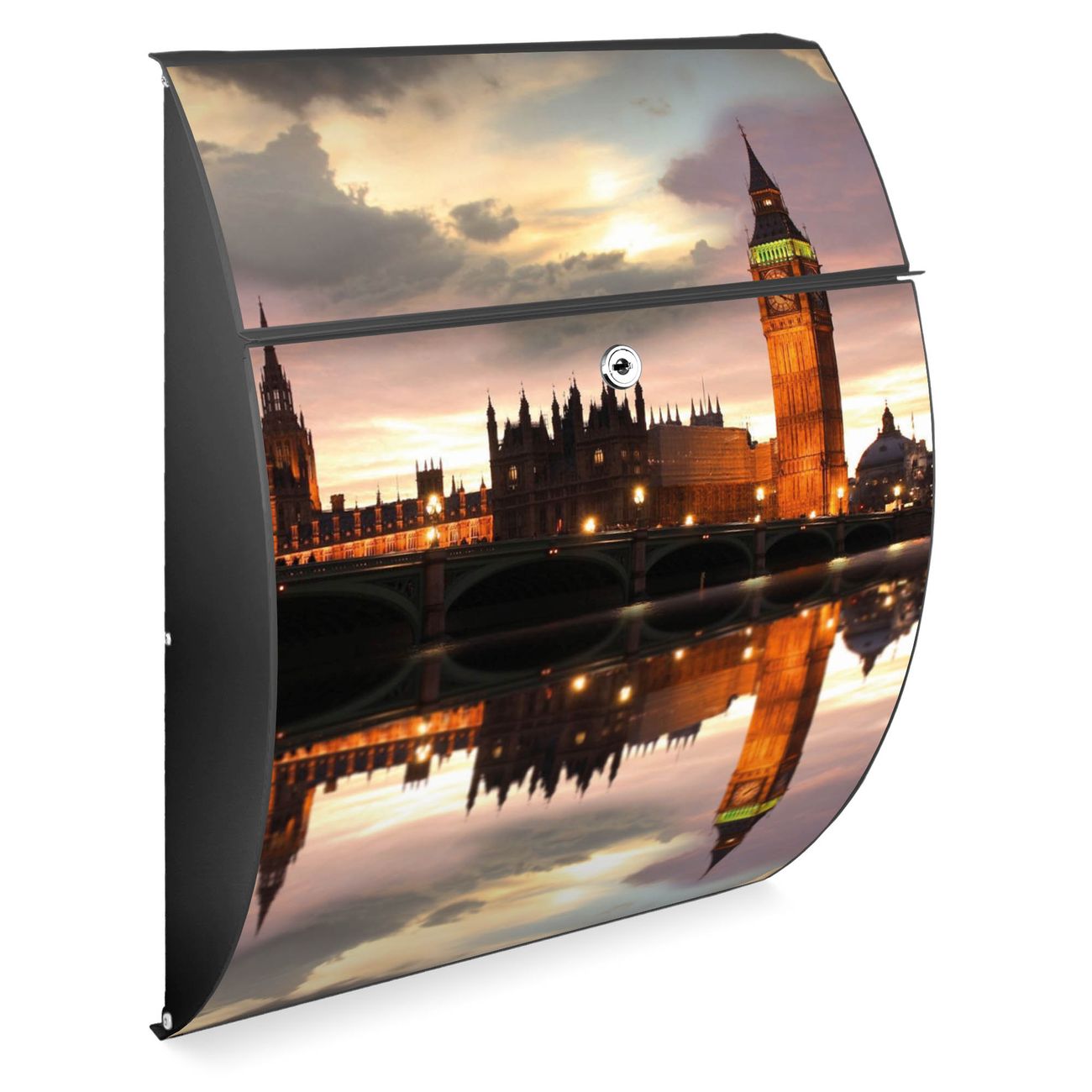 FUNKTION: DESIGN: Das Modell Riviera mit Motiv Palace of Westminster hat ein sehr ansprechendes und zeitloses Design. Heben Sie Sich von der tristen grauen Masse ab, ohne auf Funktionalität zu verzichten. Der integrierte Öffnungsstopp ermöglicht eine einfache Handhabung beim Entnehmen der Post. DETAILS: Der Postkasten besteht aus vollflächig verzinktem Stahl welcher in Anthrazit lackiert wurde. Das Motiv besteht aus einer wetter- und UV-festen Folie, die mit einem Schutzlaminat überzogen ist, durch die Ihren Briefkasten zusätzlich vor Kratzern geschützt ist. Sie erhalten 2 Schlüssel sowie das passende Montagematerial. NUTZEN: Sie können den Briefkasten sowohl als Wandbriefkasten montieren oder einen passenden Ständer kaufen und als Standbriefkasten einbetonieren. Die Größe bietet genügend Platz für Sendungen aller Art, der Einwurf fasst auch größere A4 Sendungen. BANJADO: Ihr Briefkasten wird in Sachsen in einer kleinen Manufaktur von Hand veredelt. Die Motivfolie ist lösungsmittelfrei und schutzlaminiert, dies sorgt für einen langen Halt. Wir legen großen Wert auf die Verbindung von Funktionalität und Design. Sie erhalten Handarbeit aus Sachsen.