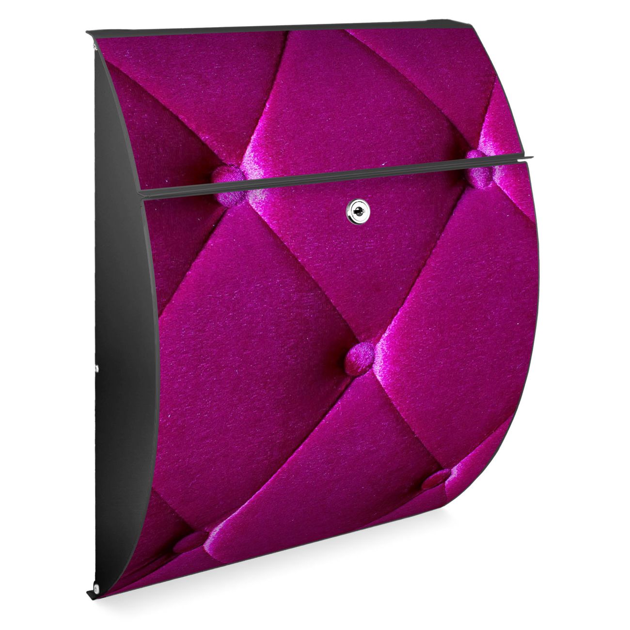 FUNKTION: DESIGN: Das Modell Riviera mit Motiv Pink Polster hat ein sehr ansprechendes und zeitloses Design. Heben Sie Sich von der tristen grauen Masse ab, ohne auf Funktionalität zu verzichten. Der integrierte Öffnungsstopp ermöglicht eine einfache Handhabung beim Entnehmen der Post. DETAILS: Der Postkasten besteht aus vollflächig verzinktem Stahl welcher in Anthrazit lackiert wurde. Das Motiv besteht aus einer wetter- und UV-festen Folie, die mit einem Schutzlaminat überzogen ist, durch die Ihren Briefkasten zusätzlich vor Kratzern geschützt ist. Sie erhalten 2 Schlüssel sowie das passende Montagematerial. NUTZEN: Sie können den Briefkasten sowohl als Wandbriefkasten montieren oder einen passenden Ständer kaufen und als Standbriefkasten einbetonieren. Die Größe bietet genügend Platz für Sendungen aller Art, der Einwurf fasst auch größere A4 Sendungen. BANJADO: Ihr Briefkasten wird in Sachsen in einer kleinen Manufaktur von Hand veredelt. Die Motivfolie ist lösungsmittelfrei und schutzlaminiert, dies sorgt für einen langen Halt. Wir legen großen Wert auf die Verbindung von Funktionalität und Design. Sie erhalten Handarbeit aus Sachsen.