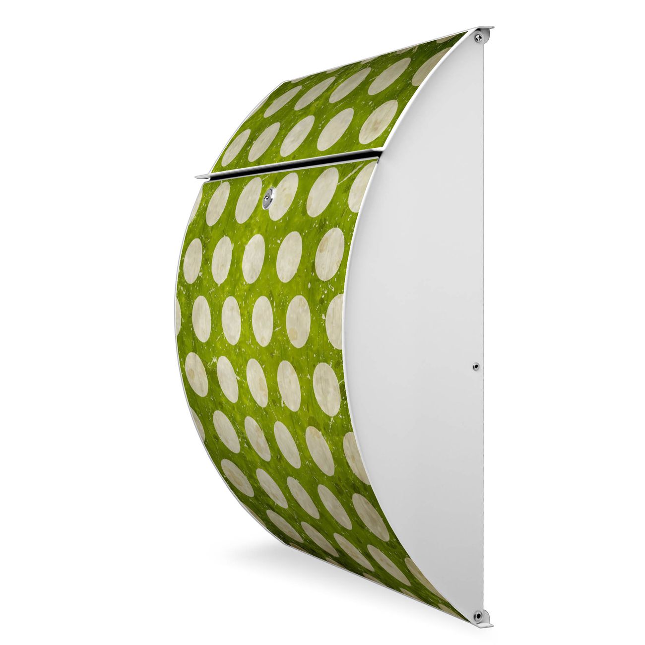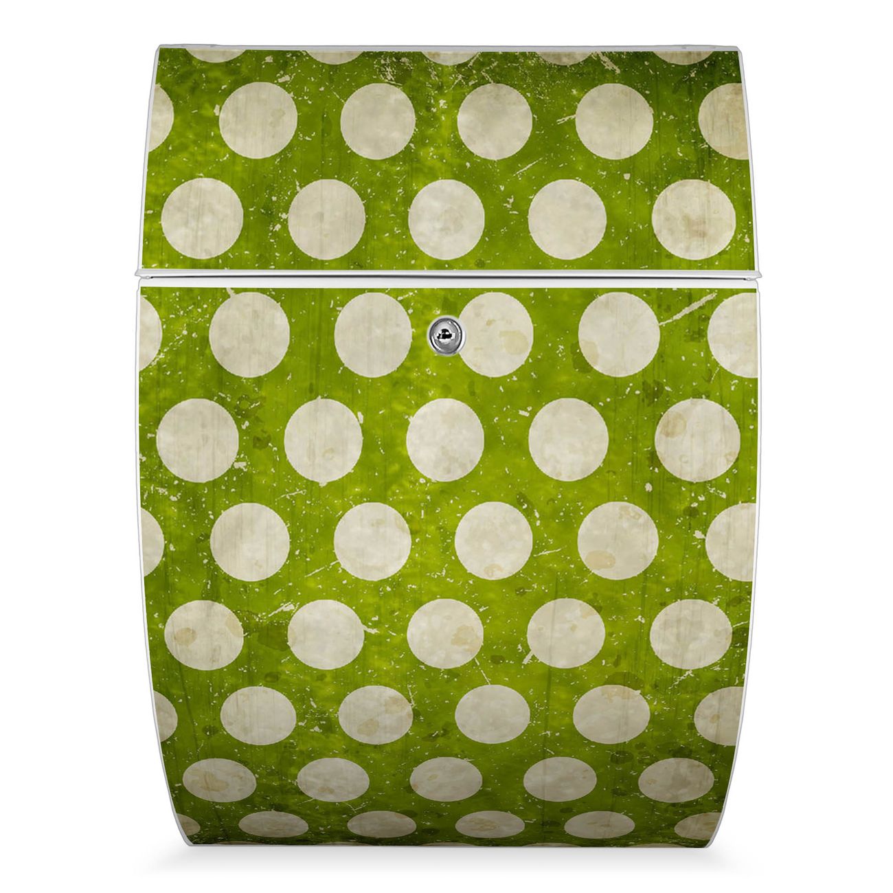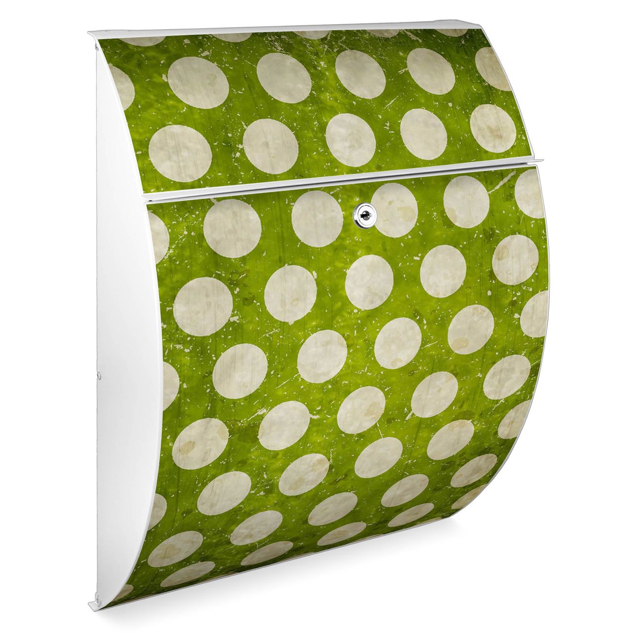 Der weiße Burg Wächter Design Briefkasten mit Motiv Punkte Grün Vintage bietet Ihnen mit seinem Fassungsvermögen genügend Platz auch für große A4 Sendungen. Auf Wunsch können Sie bei uns auch den passenden Ständer kaufen und so aus dem Wandbriefkasten einen Standbriefkasten machen.
