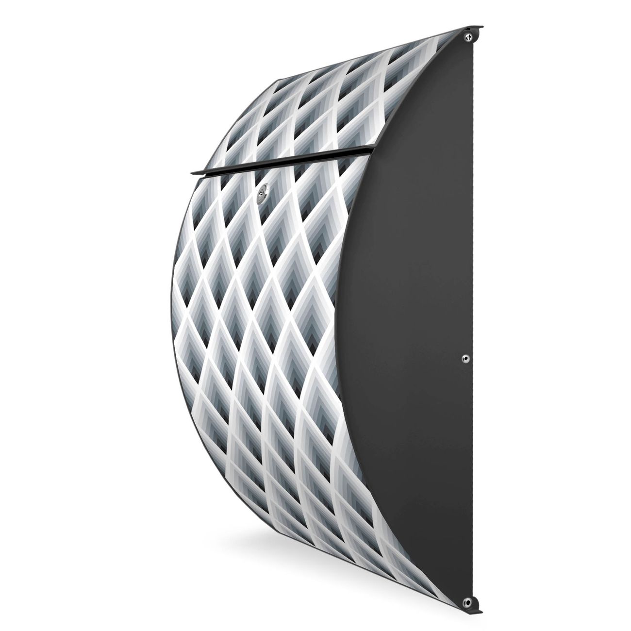 FUNKTION: DESIGN: Das Modell Riviera mit Motiv Raster 3D Grau hat ein sehr ansprechendes und zeitloses Design. Heben Sie Sich von der tristen grauen Masse ab, ohne auf Funktionalität zu verzichten. Der integrierte Öffnungsstopp ermöglicht eine einfache Handhabung beim Entnehmen der Post. DETAILS: Der Postkasten besteht aus vollflächig verzinktem Stahl welcher in Anthrazit lackiert wurde. Das Motiv besteht aus einer wetter- und UV-festen Folie, die mit einem Schutzlaminat überzogen ist, durch die Ihren Briefkasten zusätzlich vor Kratzern geschützt ist. Sie erhalten 2 Schlüssel sowie das passende Montagematerial. NUTZEN: Sie können den Briefkasten sowohl als Wandbriefkasten montieren oder einen passenden Ständer kaufen und als Standbriefkasten einbetonieren. Die Größe bietet genügend Platz für Sendungen aller Art, der Einwurf fasst auch größere A4 Sendungen. BANJADO: Ihr Briefkasten wird in Sachsen in einer kleinen Manufaktur von Hand veredelt. Die Motivfolie ist lösungsmittelfrei und schutzlaminiert, dies sorgt für einen langen Halt. Wir legen großen Wert auf die Verbindung von Funktionalität und Design. Sie erhalten Handarbeit aus Sachsen.