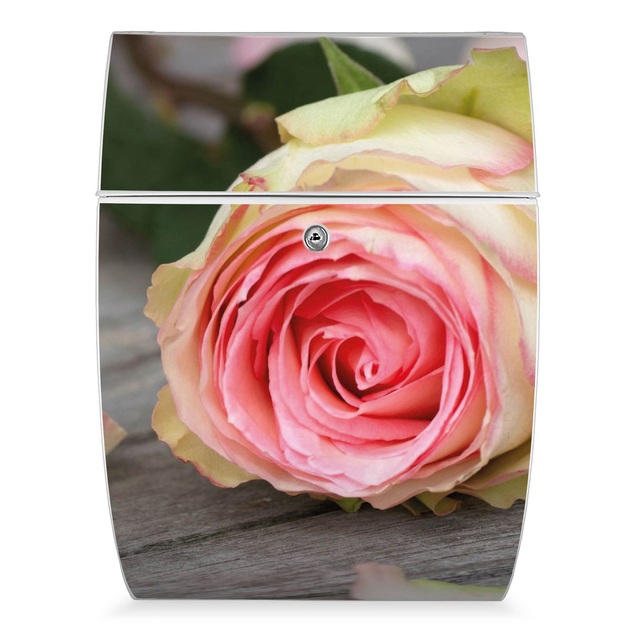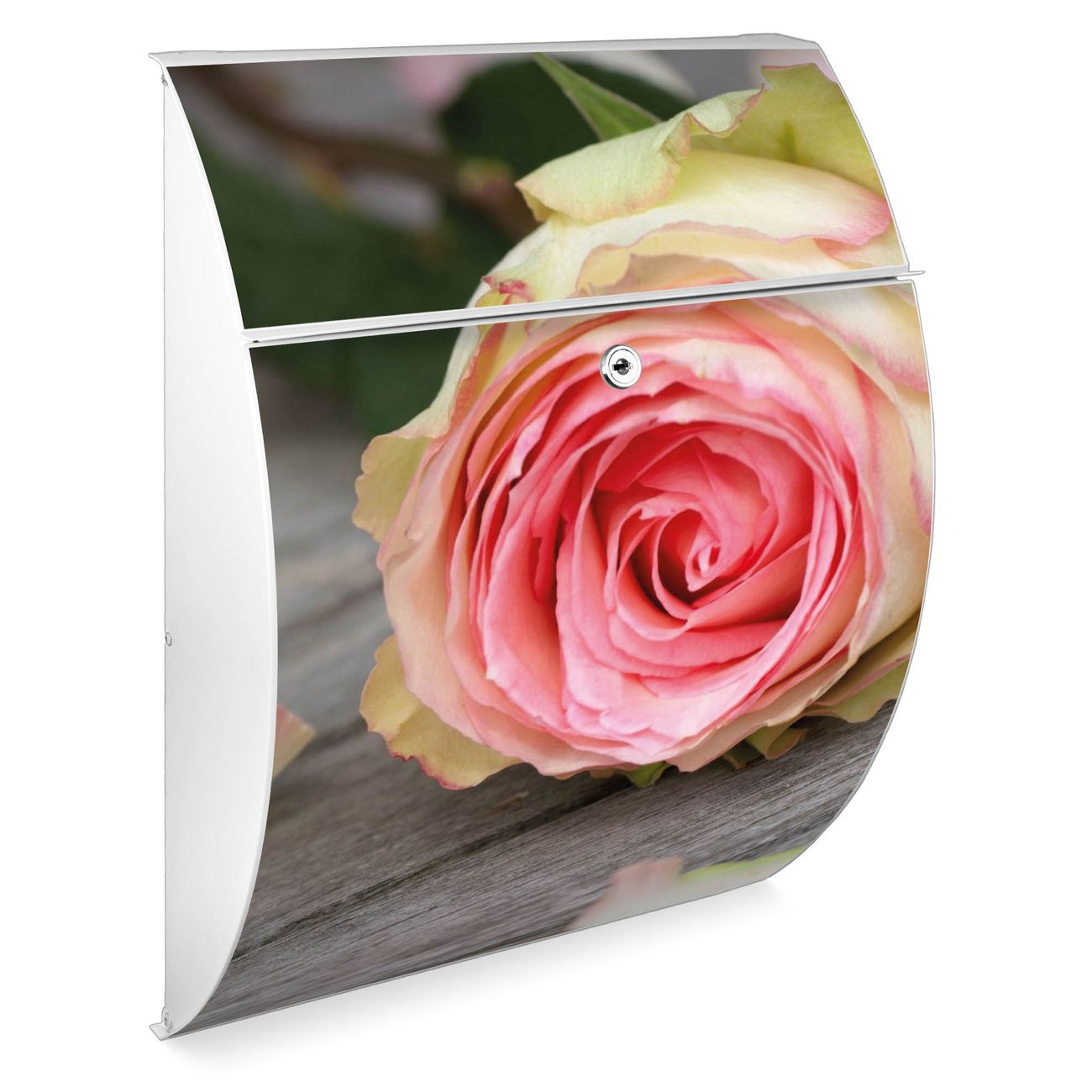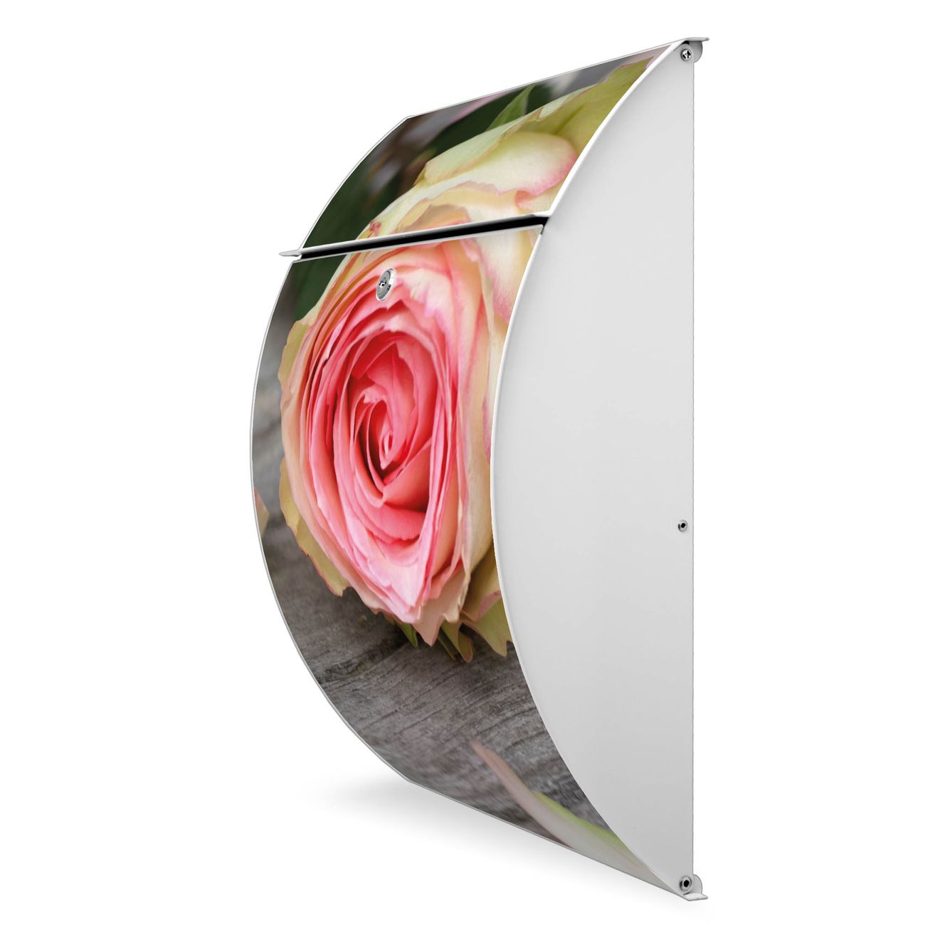 FUNKTION: DESIGN: Das Modell Riviera mit Motiv Rosa Rose hat ein sehr ansprechendes und zeitloses Design. Heben Sie Sich von der tristen grauen Masse ab, ohne auf Funktionalität zu verzichten. Der integrierte Öffnungsstopp ermöglicht eine einfache Handhabung beim Entnehmen der Post. DETAILS: Der Postkasten besteht aus vollflächig verzinktem Stahl welcher in weiß lackiert wurde. Das Motiv besteht aus einer wetter- und UV-festen Folie, die mit einem Schutzlaminat überzogen ist, durch die Ihren Briefkasten zusätzlich vor Kratzern geschützt ist. Sie erhalten 2 Schlüssel sowie das passende Montagematerial. NUTZEN: Sie können den Briefkasten sowohl als Wandbriefkasten montieren oder einen passenden Ständer kaufen und als Standbriefkasten einbetonieren. Die Größe bietet genügend Platz für Sendungen aller Art, der Einwurf fasst auch größere A4 Sendungen. BANJADO: Ihr Briefkasten wird in Sachsen in einer kleinen Manufaktur von Hand veredelt. Die Motivfolie ist lösungsmittelfrei und schutzlaminiert, dies sorgt für einen langen Halt. Wir legen großen Wert auf die Verbindung von Funktionalität und Design. Sie erhalten Handarbeit aus Sachsen.
