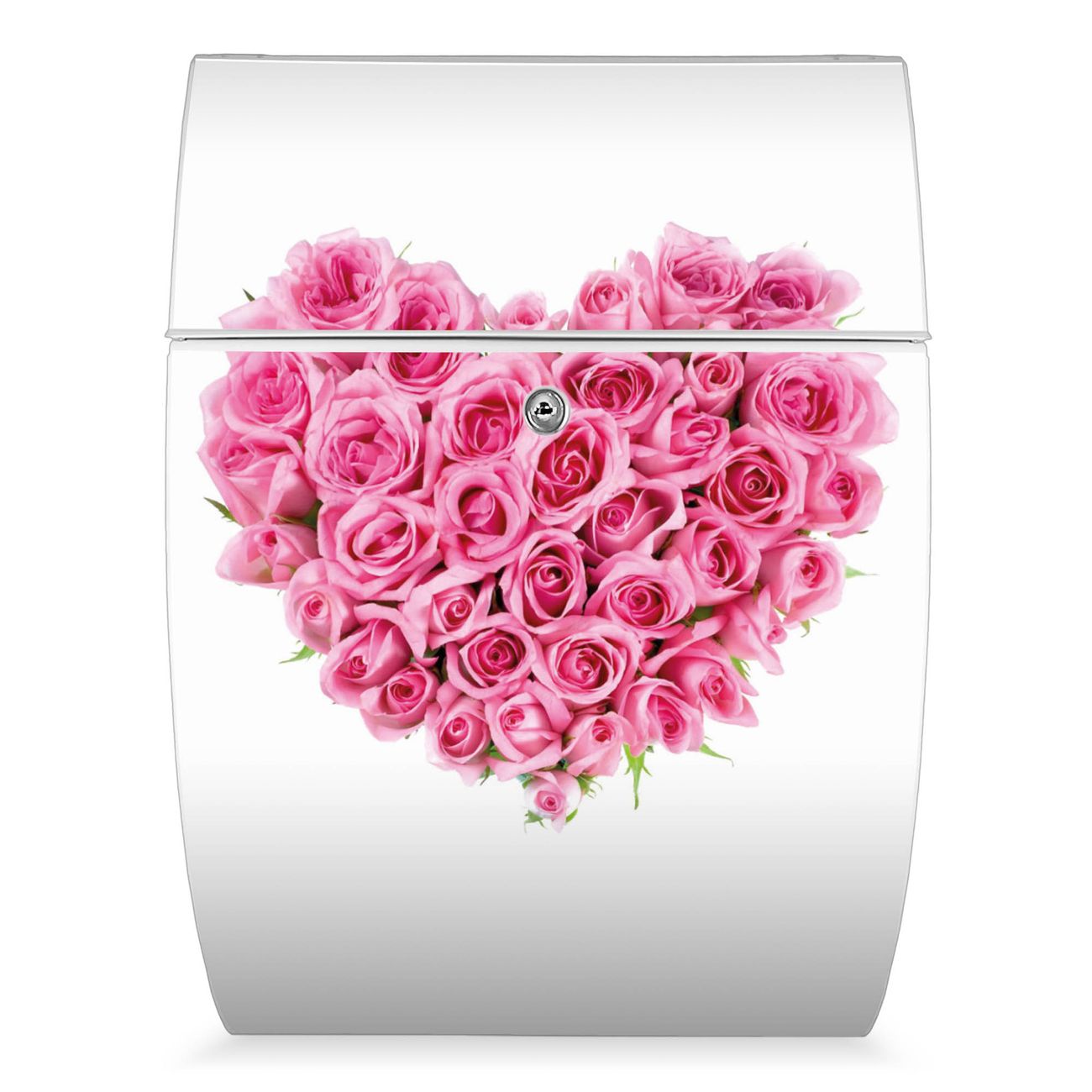 Der weiße Burg Wächter Design Briefkasten mit Motiv Rosenherz bietet Ihnen mit seinem Fassungsvermögen genügend Platz auch für große A4 Sendungen. Auf Wunsch können Sie bei uns auch den passenden Ständer kaufen und so aus dem Wandbriefkasten einen Standbriefkasten machen.