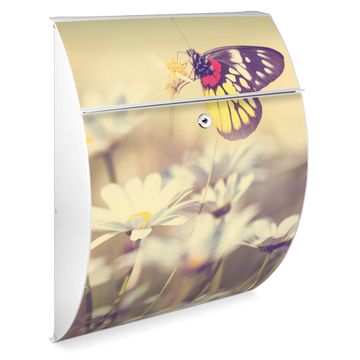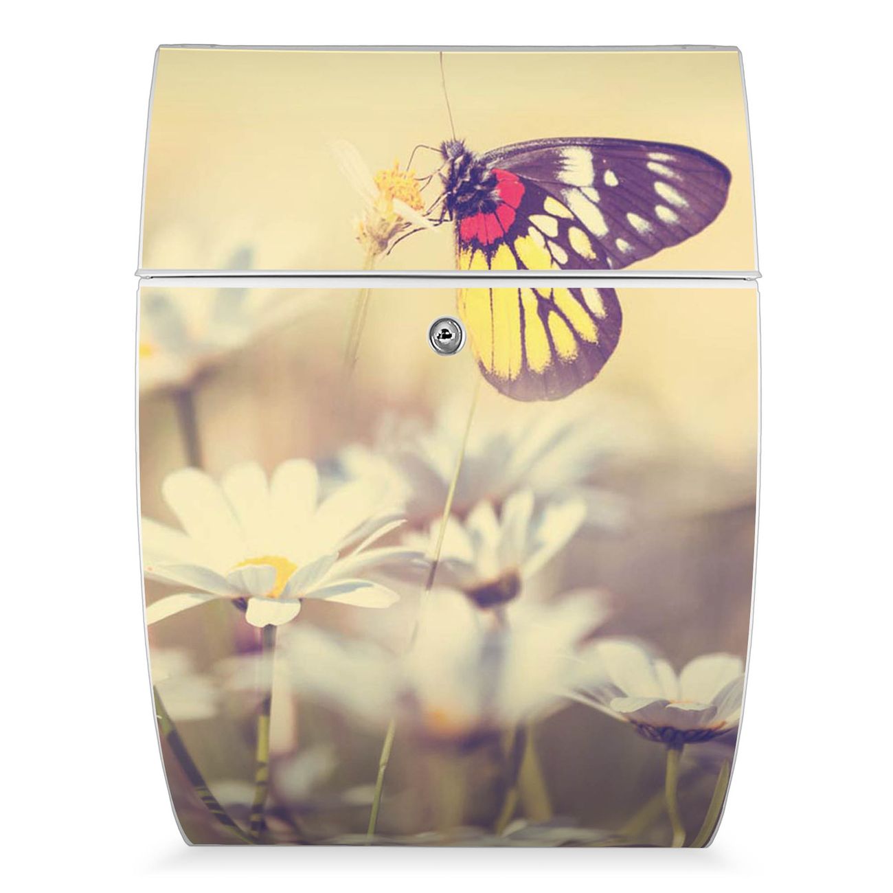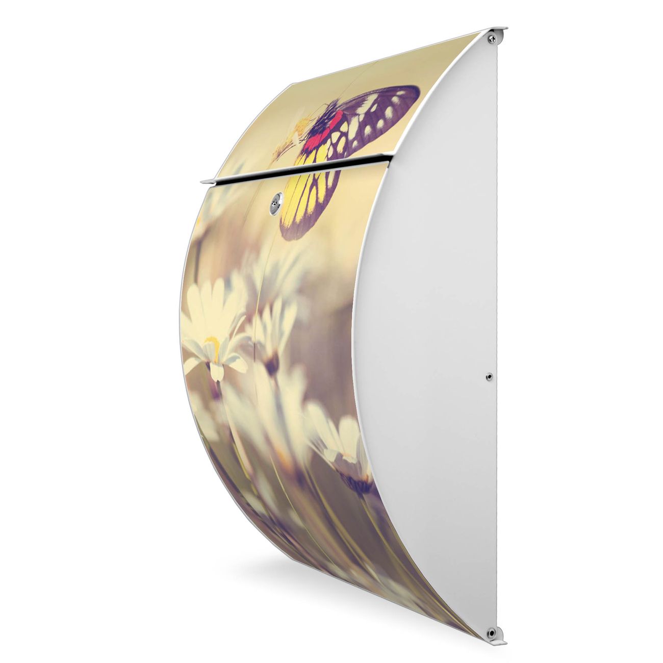 Der weiße Burg Wächter Design Briefkasten mit Motiv Rotgelber Falter bietet Ihnen mit seinem Fassungsvermögen genügend Platz auch für große A4 Sendungen. Auf Wunsch können Sie bei uns auch den passenden Ständer kaufen und so aus dem Wandbriefkasten einen Standbriefkasten machen.