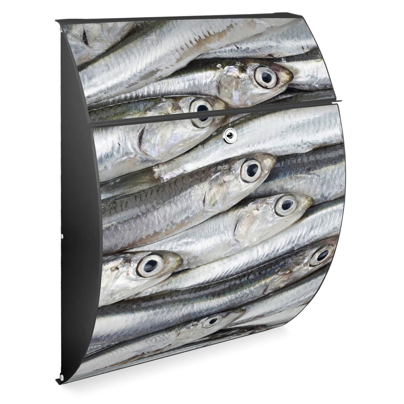 FUNKTION: DESIGN: Das Modell Riviera mit Motiv Sardinen hat ein sehr ansprechendes und zeitloses Design. Heben Sie Sich von der tristen grauen Masse ab, ohne auf Funktionalität zu verzichten. Der integrierte Öffnungsstopp ermöglicht eine einfache Handhabung beim Entnehmen der Post. DETAILS: Der Postkasten besteht aus vollflächig verzinktem Stahl welcher in Anthrazit lackiert wurde. Das Motiv besteht aus einer wetter- und UV-festen Folie, die mit einem Schutzlaminat überzogen ist, durch die Ihren Briefkasten zusätzlich vor Kratzern geschützt ist. Sie erhalten 2 Schlüssel sowie das passende Montagematerial. NUTZEN: Sie können den Briefkasten sowohl als Wandbriefkasten montieren oder einen passenden Ständer kaufen und als Standbriefkasten einbetonieren. Die Größe bietet genügend Platz für Sendungen aller Art, der Einwurf fasst auch größere A4 Sendungen. BANJADO: Ihr Briefkasten wird in Sachsen in einer kleinen Manufaktur von Hand veredelt. Die Motivfolie ist lösungsmittelfrei und schutzlaminiert, dies sorgt für einen langen Halt. Wir legen großen Wert auf die Verbindung von Funktionalität und Design. Sie erhalten Handarbeit aus Sachsen.