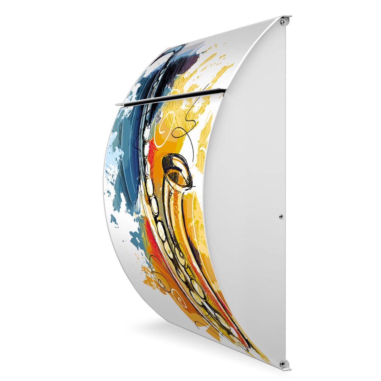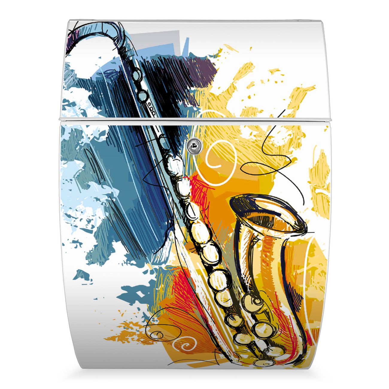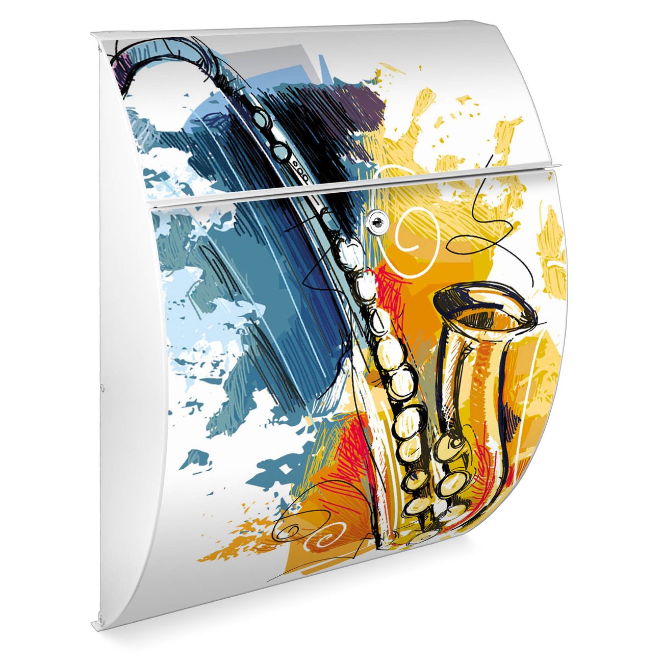 Der weiße Burg Wächter Design Briefkasten mit Motiv Saxophon bietet Ihnen mit seinem Fassungsvermögen genügend Platz auch für große A4 Sendungen. Auf Wunsch können Sie bei uns auch den passenden Ständer kaufen und so aus dem Wandbriefkasten einen Standbriefkasten machen.