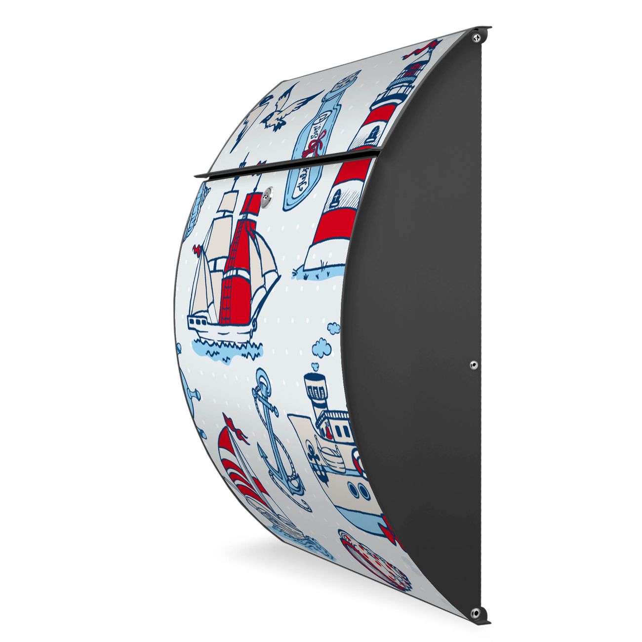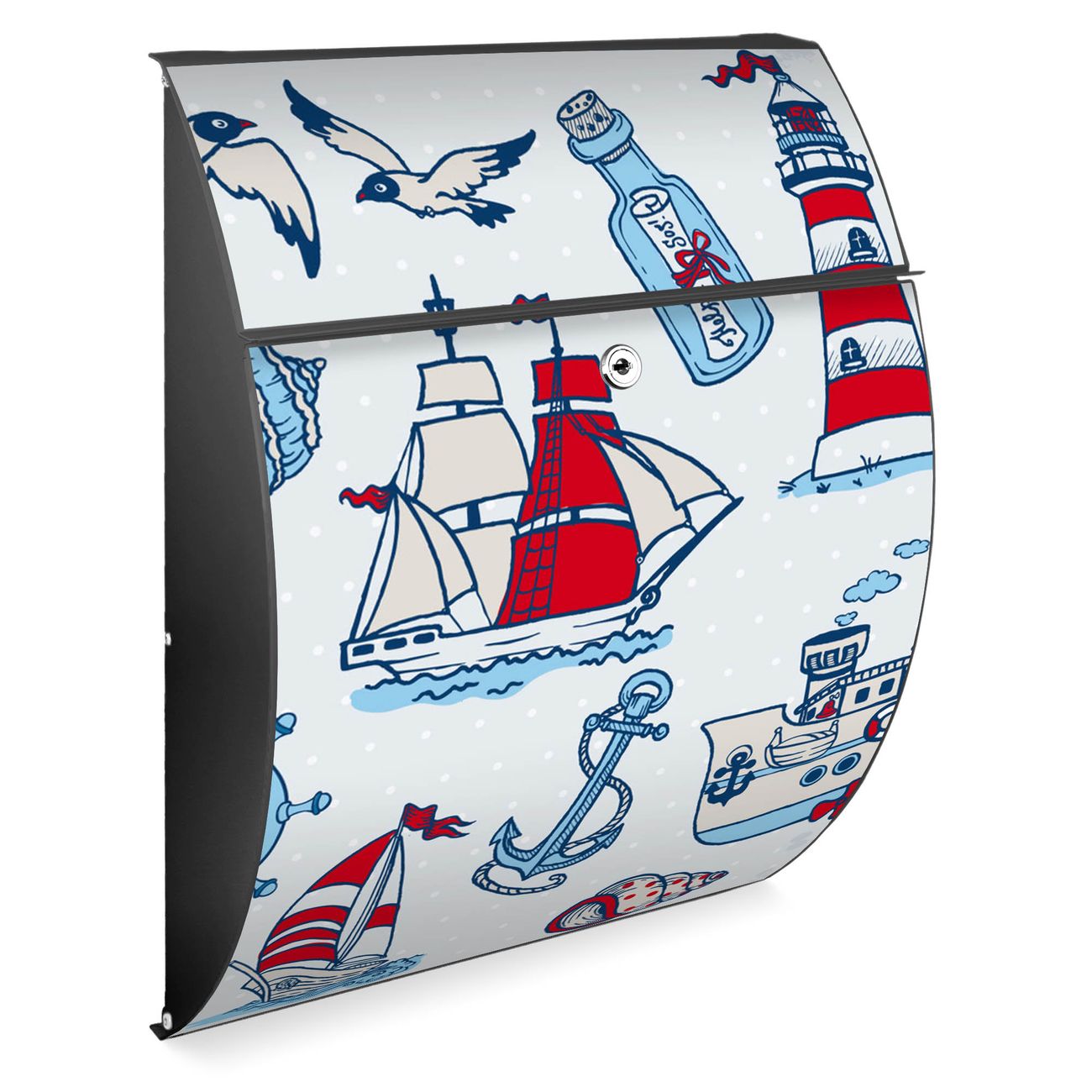 FUNKTION: DESIGN: Das Modell Riviera mit Motiv Schiff Ahoj hat ein sehr ansprechendes und zeitloses Design. Heben Sie Sich von der tristen grauen Masse ab, ohne auf Funktionalität zu verzichten. Der integrierte Öffnungsstopp ermöglicht eine einfache Handhabung beim Entnehmen der Post. DETAILS: Der Postkasten besteht aus vollflächig verzinktem Stahl welcher in Anthrazit lackiert wurde. Das Motiv besteht aus einer wetter- und UV-festen Folie, die mit einem Schutzlaminat überzogen ist, durch die Ihren Briefkasten zusätzlich vor Kratzern geschützt ist. Sie erhalten 2 Schlüssel sowie das passende Montagematerial. NUTZEN: Sie können den Briefkasten sowohl als Wandbriefkasten montieren oder einen passenden Ständer kaufen und als Standbriefkasten einbetonieren. Die Größe bietet genügend Platz für Sendungen aller Art, der Einwurf fasst auch größere A4 Sendungen. BANJADO: Ihr Briefkasten wird in Sachsen in einer kleinen Manufaktur von Hand veredelt. Die Motivfolie ist lösungsmittelfrei und schutzlaminiert, dies sorgt für einen langen Halt. Wir legen großen Wert auf die Verbindung von Funktionalität und Design. Sie erhalten Handarbeit aus Sachsen.