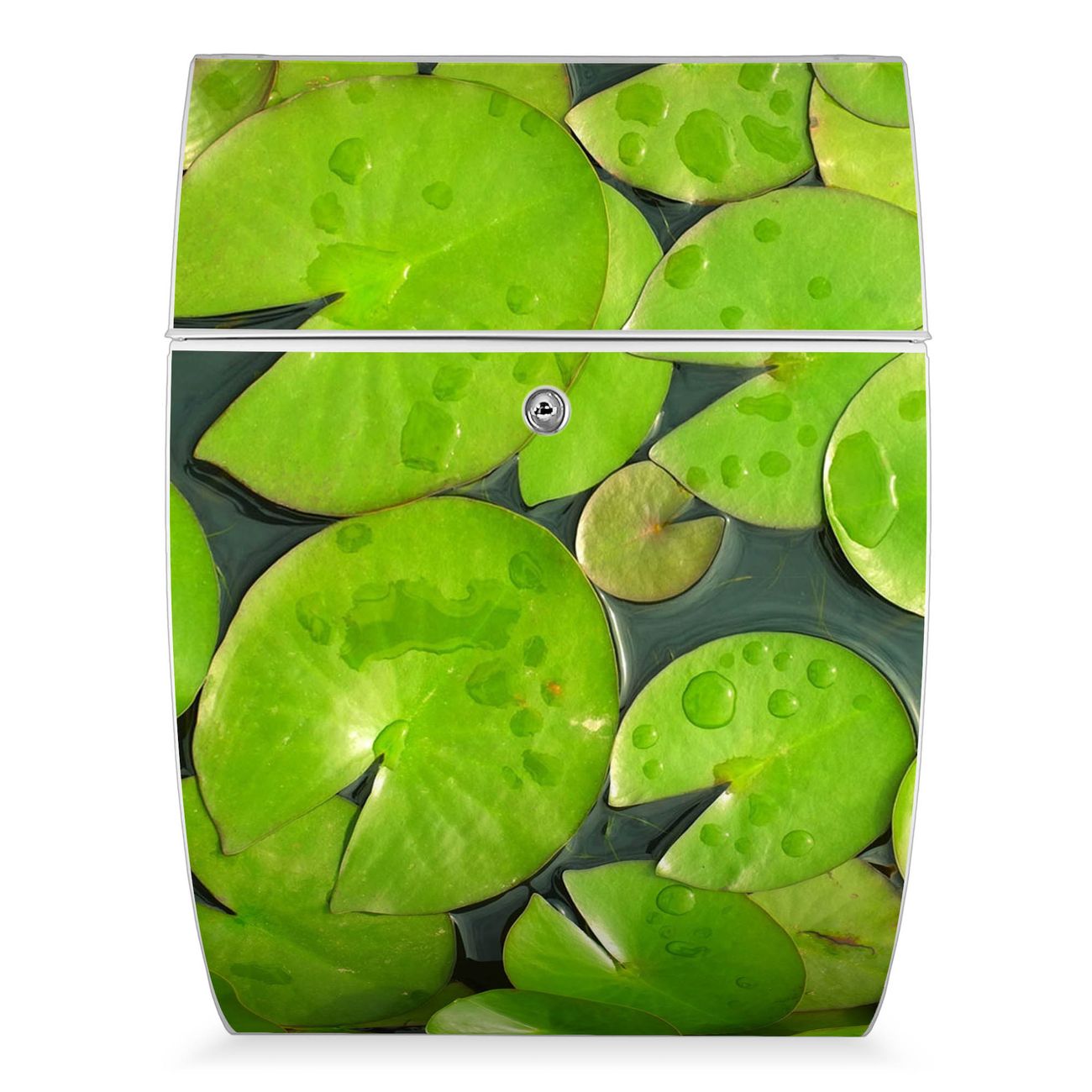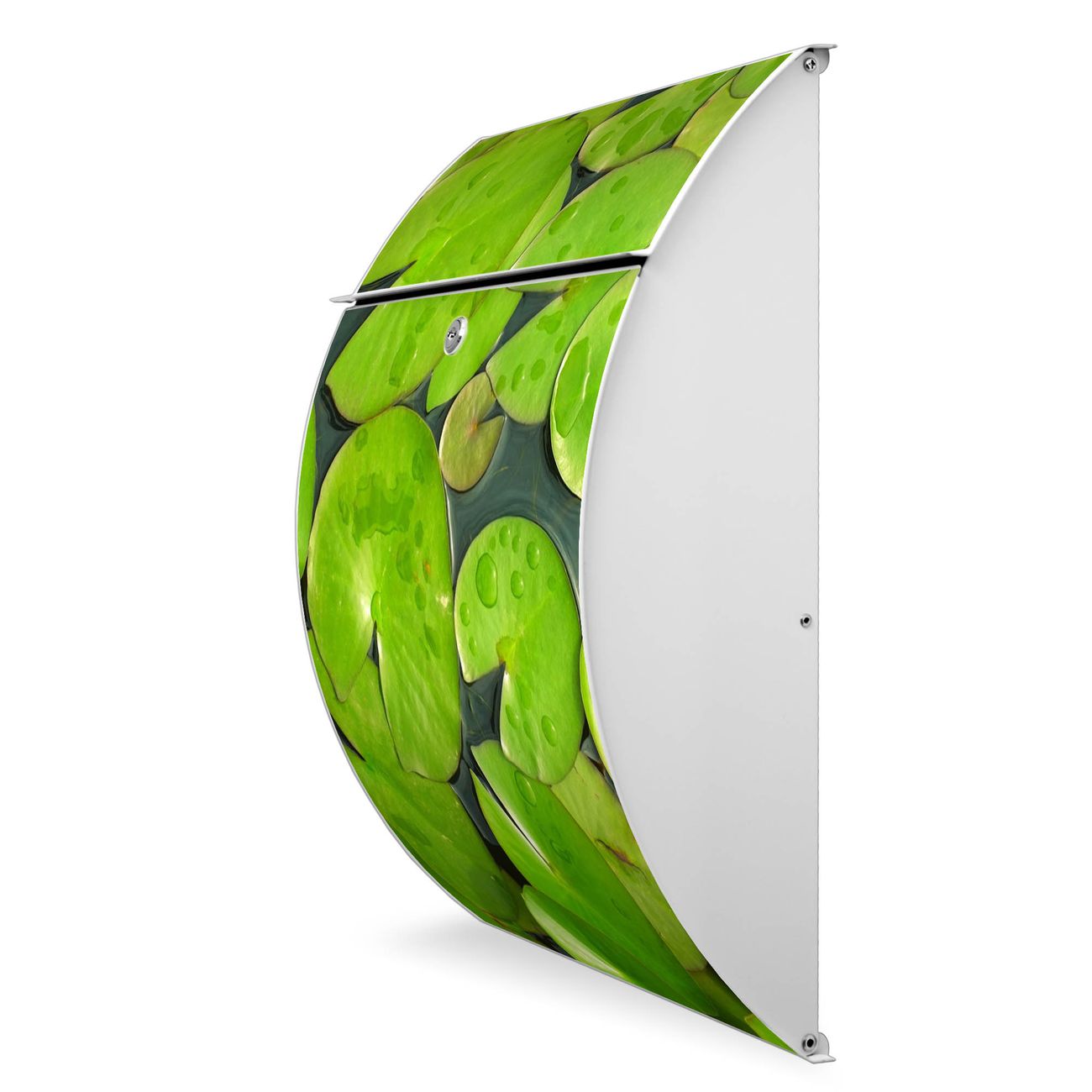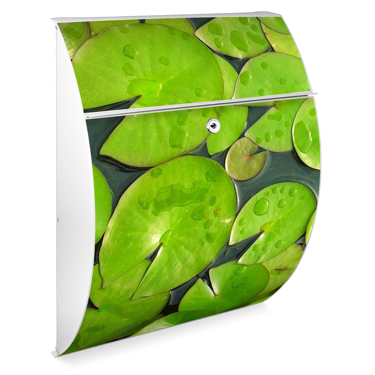 Der weiße Burg Wächter Design Briefkasten mit Motiv Seerosenblätter bietet Ihnen mit seinem Fassungsvermögen genügend Platz auch für große A4 Sendungen. Auf Wunsch können Sie bei uns auch den passenden Ständer kaufen und so aus dem Wandbriefkasten einen Standbriefkasten machen.