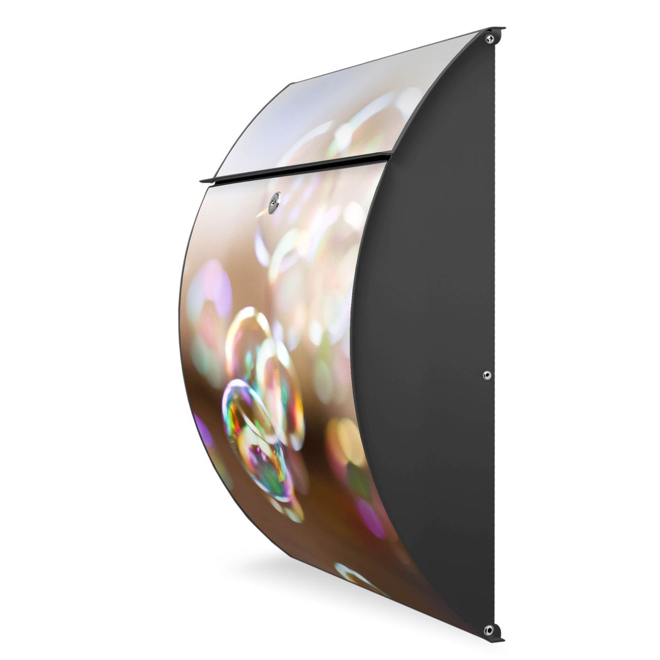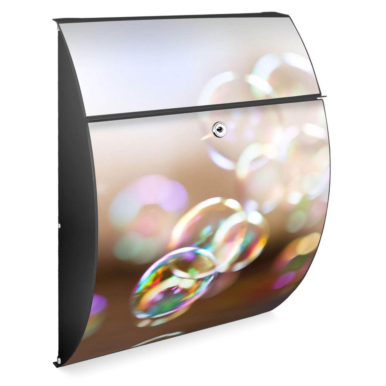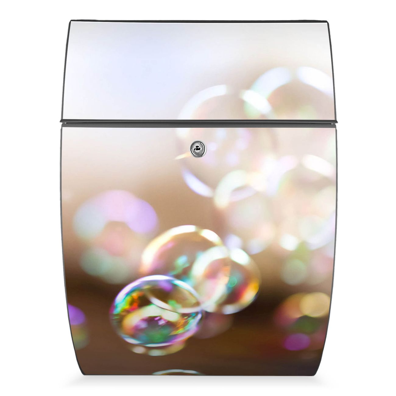 FUNKTION: DESIGN: Das Modell Riviera mit Motiv Seifenblasen hat ein sehr ansprechendes und zeitloses Design. Heben Sie Sich von der tristen grauen Masse ab, ohne auf Funktionalität zu verzichten. Der integrierte Öffnungsstopp ermöglicht eine einfache Handhabung beim Entnehmen der Post. DETAILS: Der Postkasten besteht aus vollflächig verzinktem Stahl welcher in Anthrazit lackiert wurde. Das Motiv besteht aus einer wetter- und UV-festen Folie, die mit einem Schutzlaminat überzogen ist, durch die Ihren Briefkasten zusätzlich vor Kratzern geschützt ist. Sie erhalten 2 Schlüssel sowie das passende Montagematerial. NUTZEN: Sie können den Briefkasten sowohl als Wandbriefkasten montieren oder einen passenden Ständer kaufen und als Standbriefkasten einbetonieren. Die Größe bietet genügend Platz für Sendungen aller Art, der Einwurf fasst auch größere A4 Sendungen. BANJADO: Ihr Briefkasten wird in Sachsen in einer kleinen Manufaktur von Hand veredelt. Die Motivfolie ist lösungsmittelfrei und schutzlaminiert, dies sorgt für einen langen Halt. Wir legen großen Wert auf die Verbindung von Funktionalität und Design. Sie erhalten Handarbeit aus Sachsen.