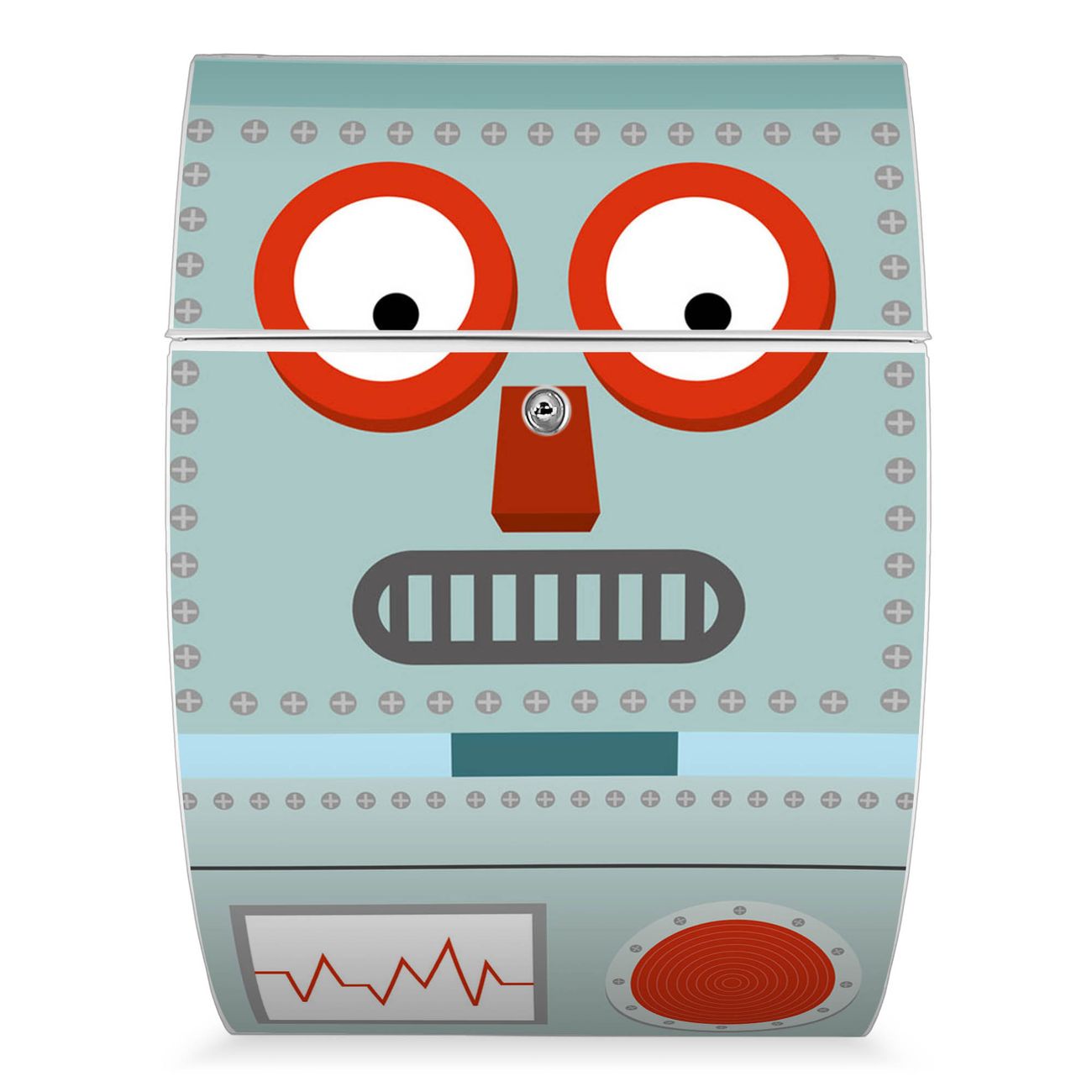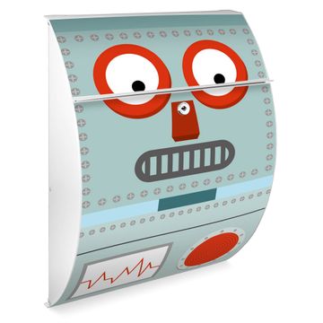 Der weiße Burg Wächter Design Briefkasten mit Motiv Shocked Robot bietet Ihnen mit seinem Fassungsvermögen genügend Platz auch für große A4 Sendungen. Auf Wunsch können Sie bei uns auch den passenden Ständer kaufen und so aus dem Wandbriefkasten einen Standbriefkasten machen.