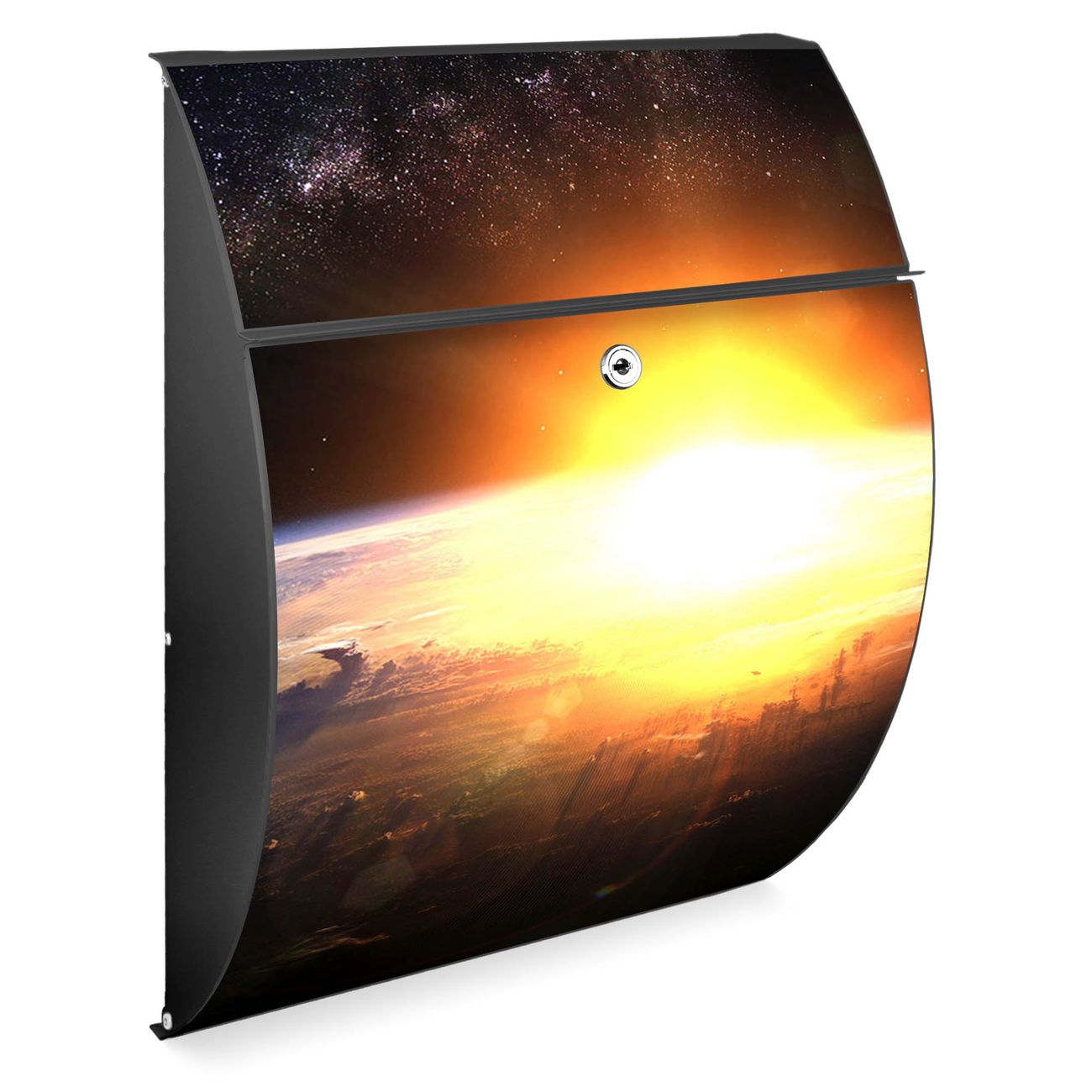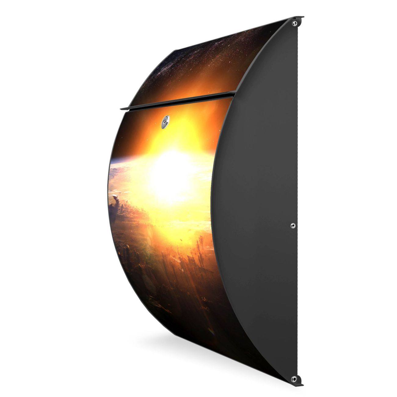 FUNKTION: DESIGN: Das Modell Riviera mit Motiv Sonne im Weltall hat ein sehr ansprechendes und zeitloses Design. Heben Sie Sich von der tristen grauen Masse ab, ohne auf Funktionalität zu verzichten. Der integrierte Öffnungsstopp ermöglicht eine einfache Handhabung beim Entnehmen der Post. DETAILS: Der Postkasten besteht aus vollflächig verzinktem Stahl welcher in Anthrazit lackiert wurde. Das Motiv besteht aus einer wetter- und UV-festen Folie, die mit einem Schutzlaminat überzogen ist, durch die Ihren Briefkasten zusätzlich vor Kratzern geschützt ist. Sie erhalten 2 Schlüssel sowie das passende Montagematerial. NUTZEN: Sie können den Briefkasten sowohl als Wandbriefkasten montieren oder einen passenden Ständer kaufen und als Standbriefkasten einbetonieren. Die Größe bietet genügend Platz für Sendungen aller Art, der Einwurf fasst auch größere A4 Sendungen. BANJADO: Ihr Briefkasten wird in Sachsen in einer kleinen Manufaktur von Hand veredelt. Die Motivfolie ist lösungsmittelfrei und schutzlaminiert, dies sorgt für einen langen Halt. Wir legen großen Wert auf die Verbindung von Funktionalität und Design. Sie erhalten Handarbeit aus Sachsen.